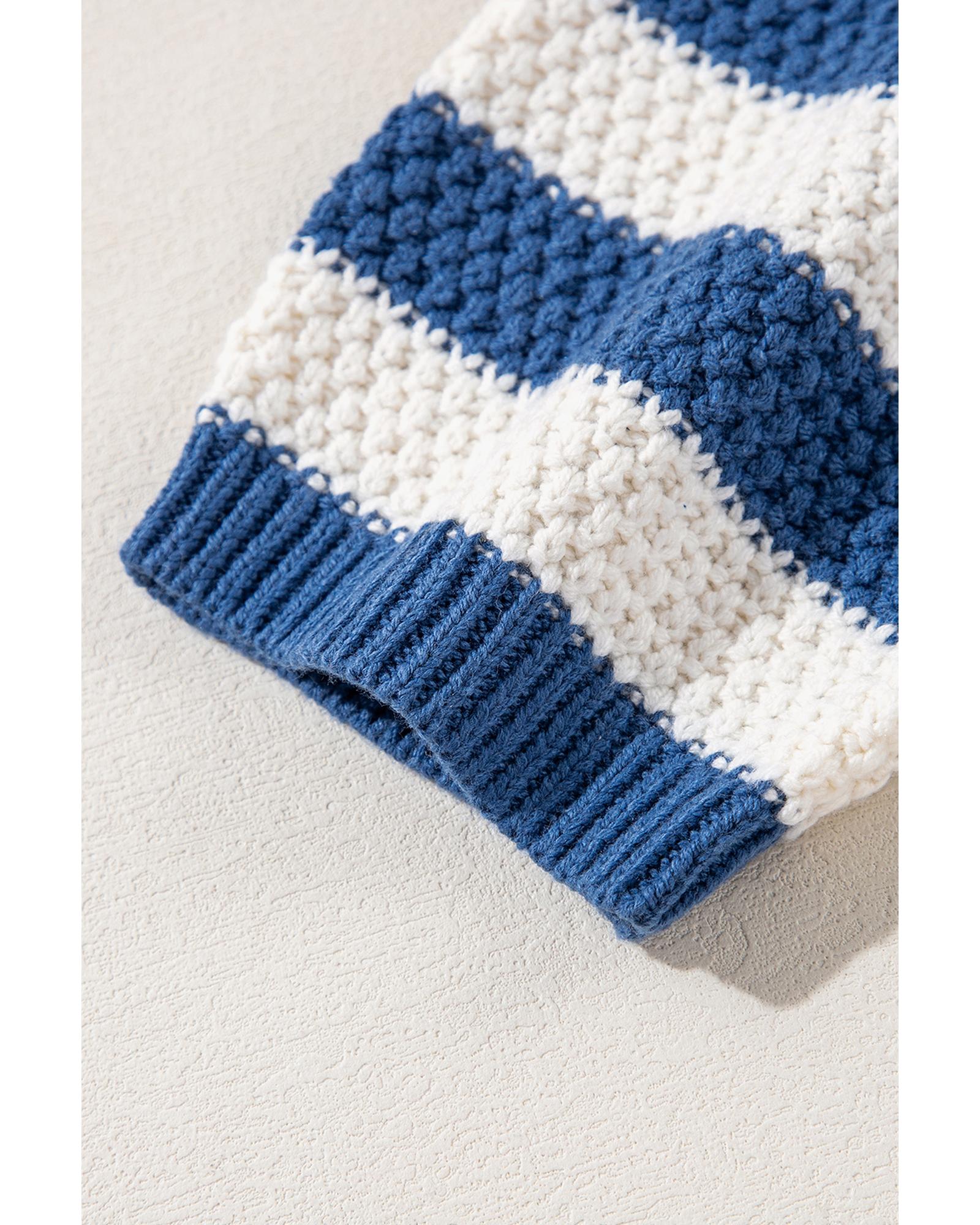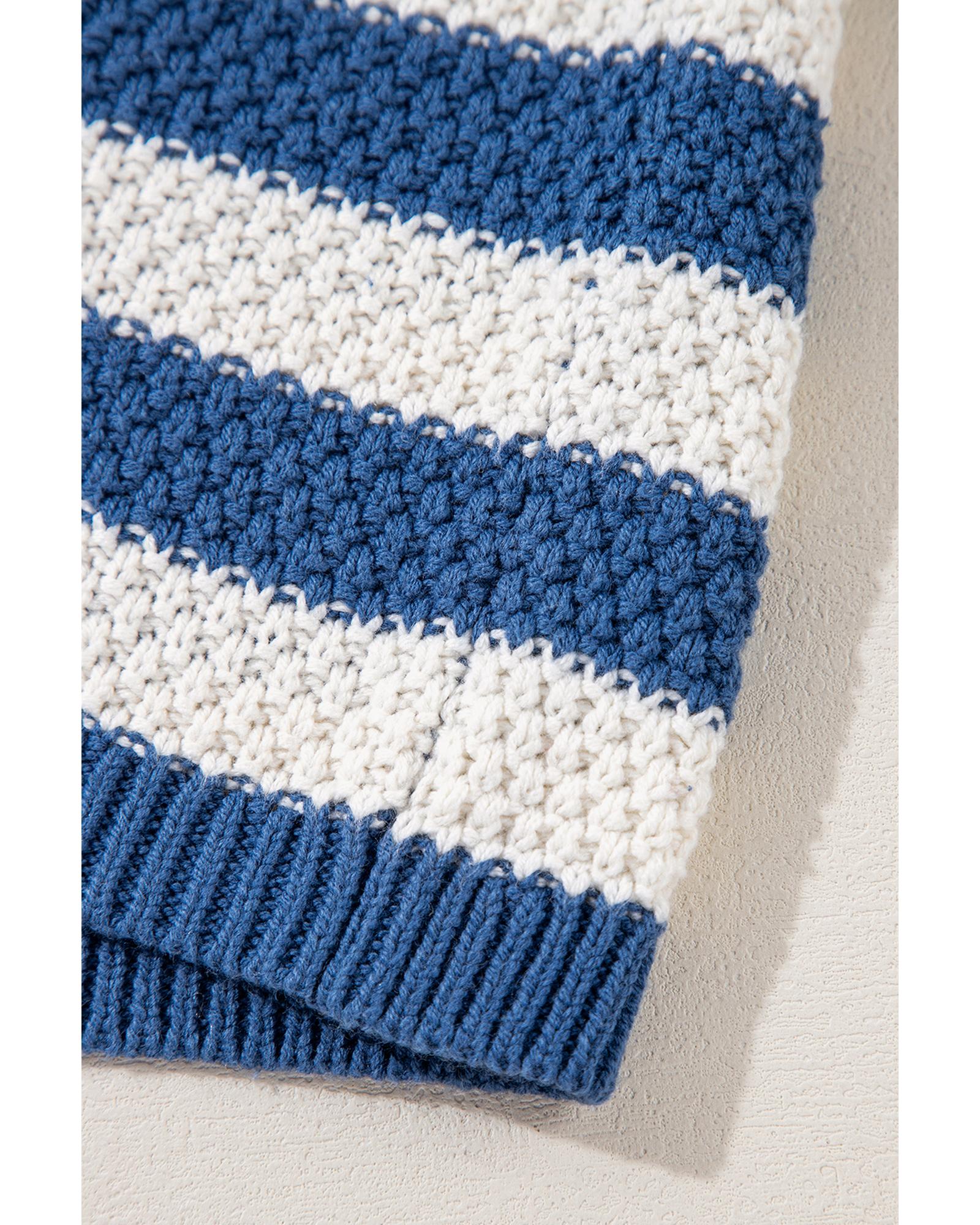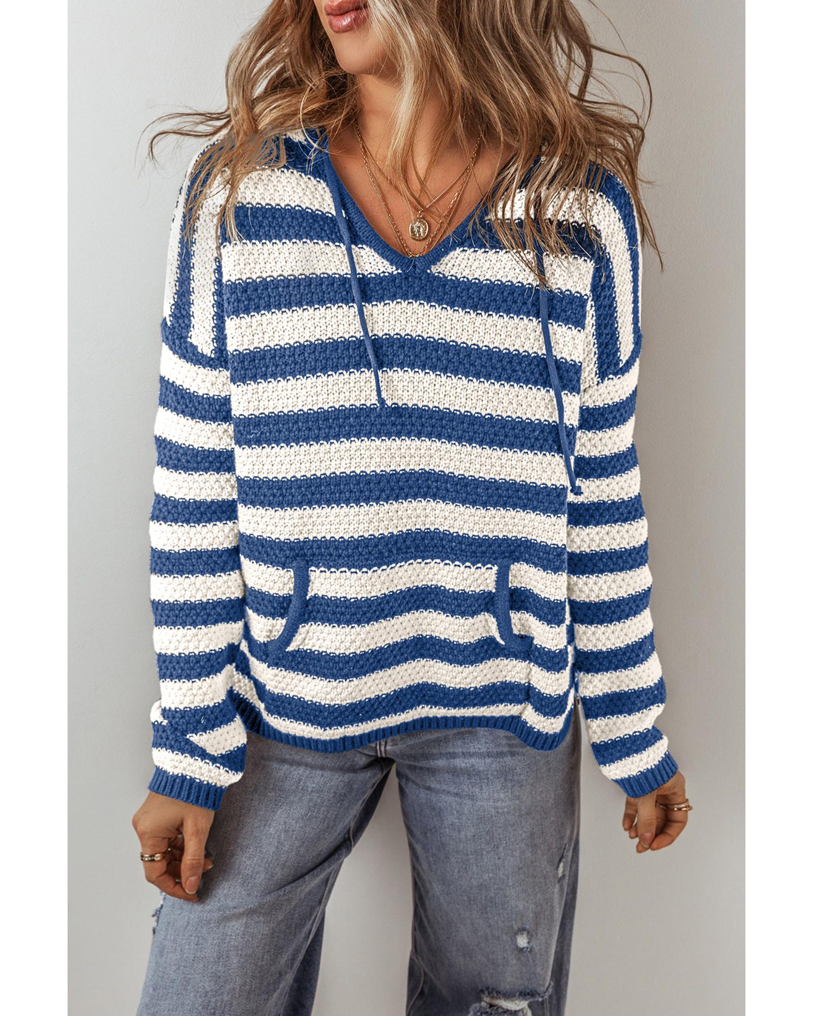 Blue Stripe V Neck Pocketed Drawstring Hooded Sweater – XL