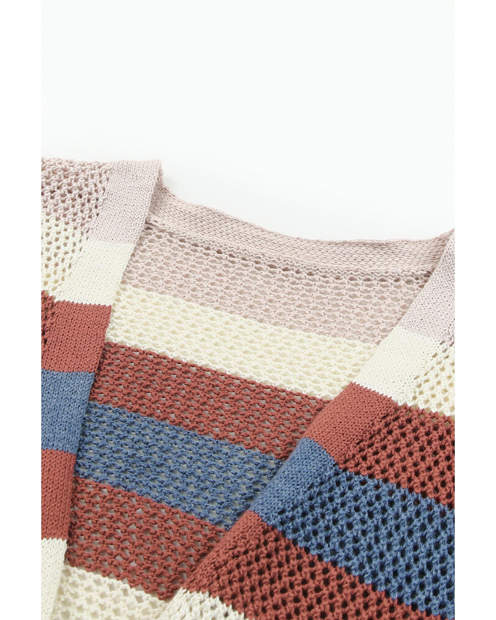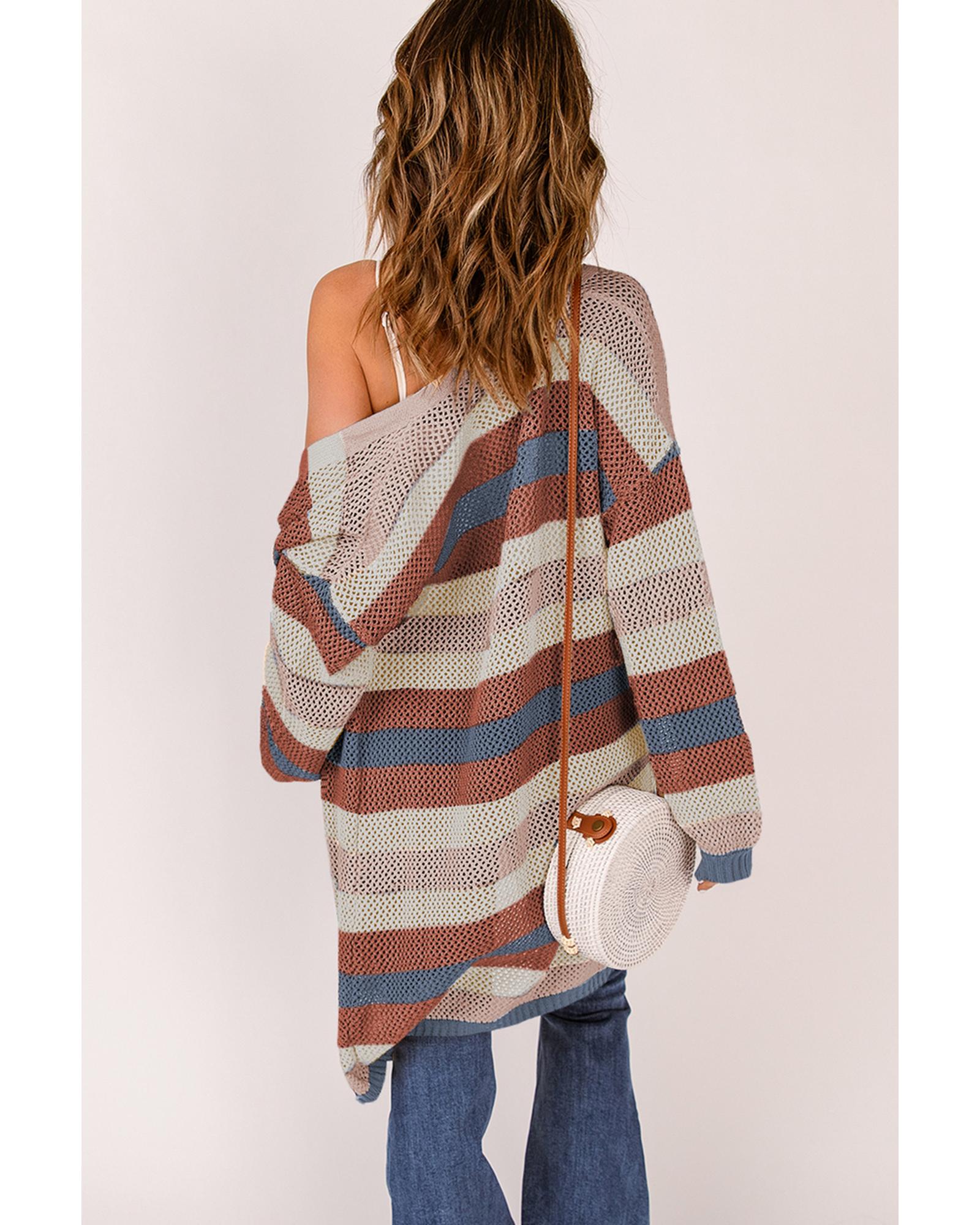 • Blue Striped Color Block Hollowed Knit Cardigan