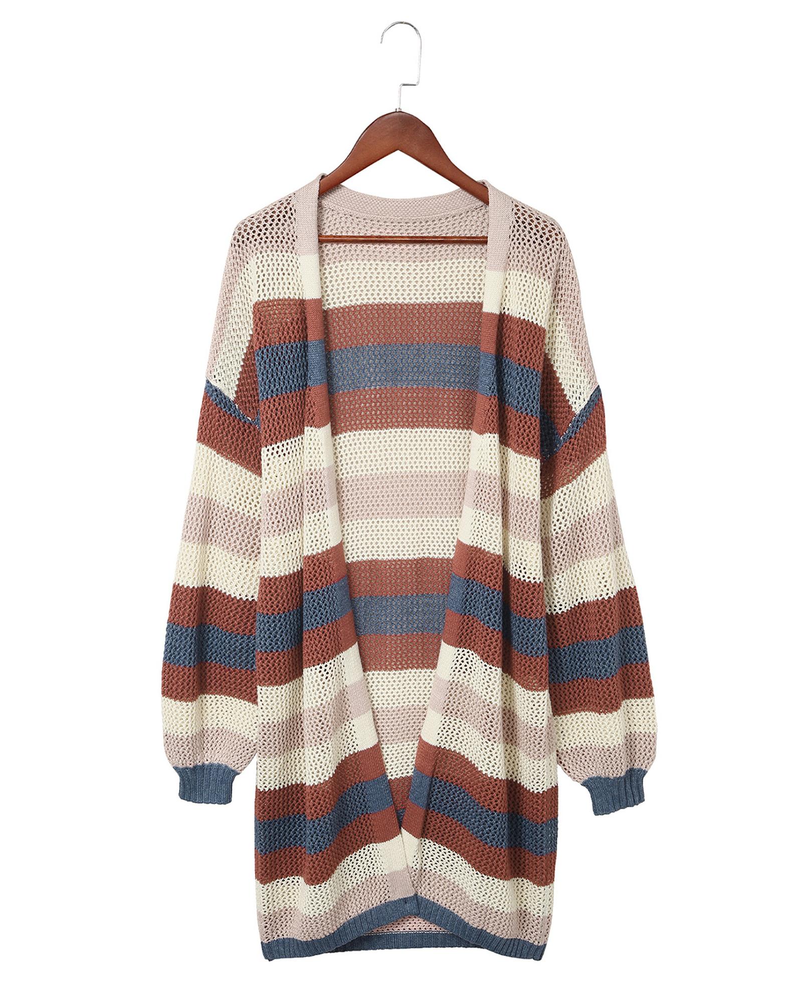 Blue Striped Color Block Hollowed Knit Cardigan – 2XL