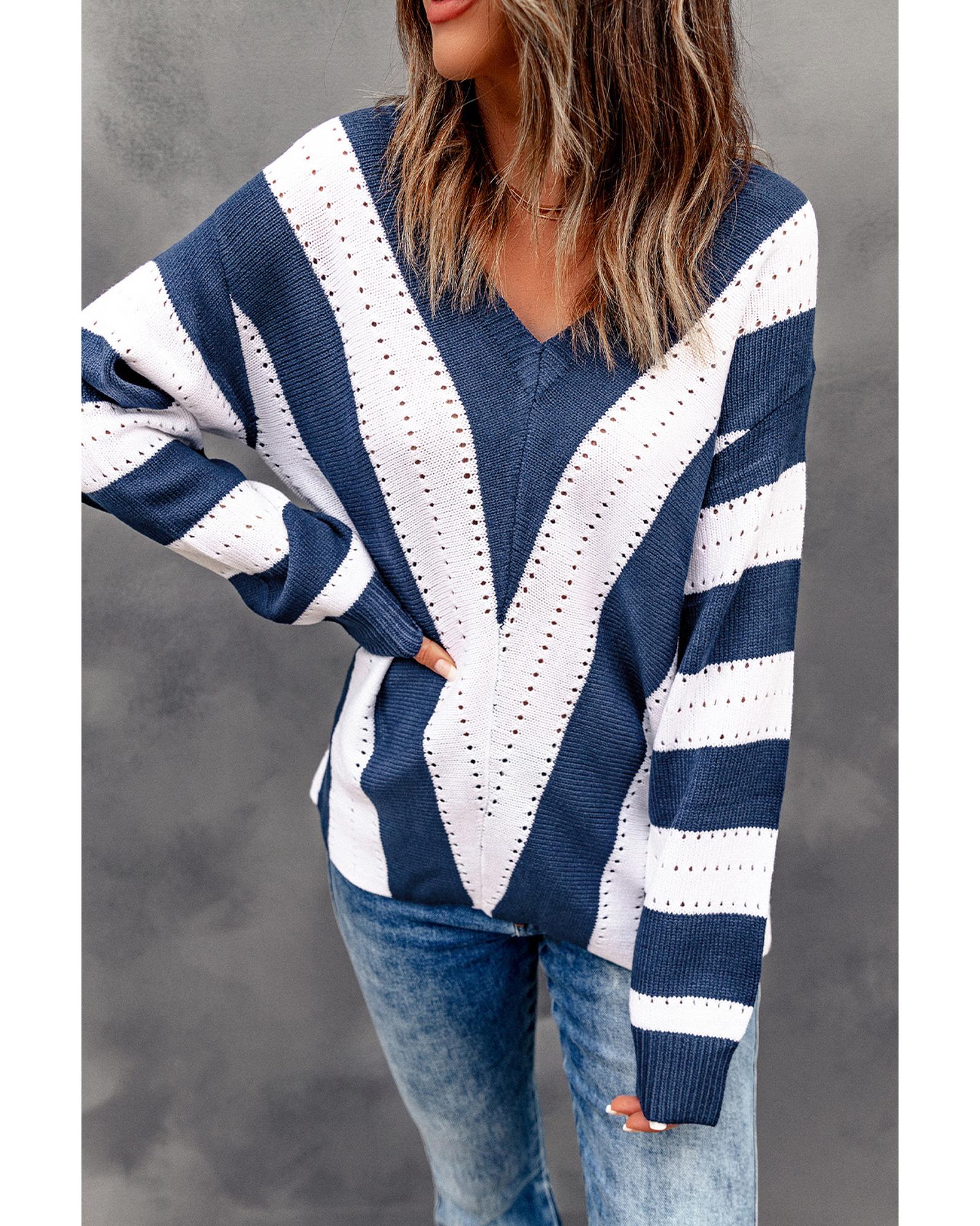 Blue Striped Colorblock V Neck Knitted Sweater – XL