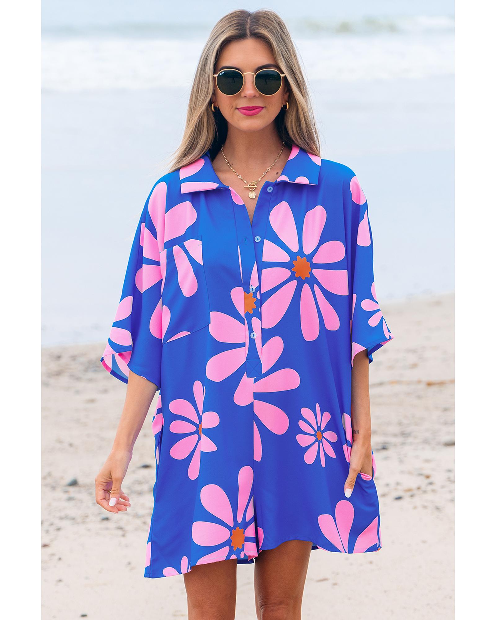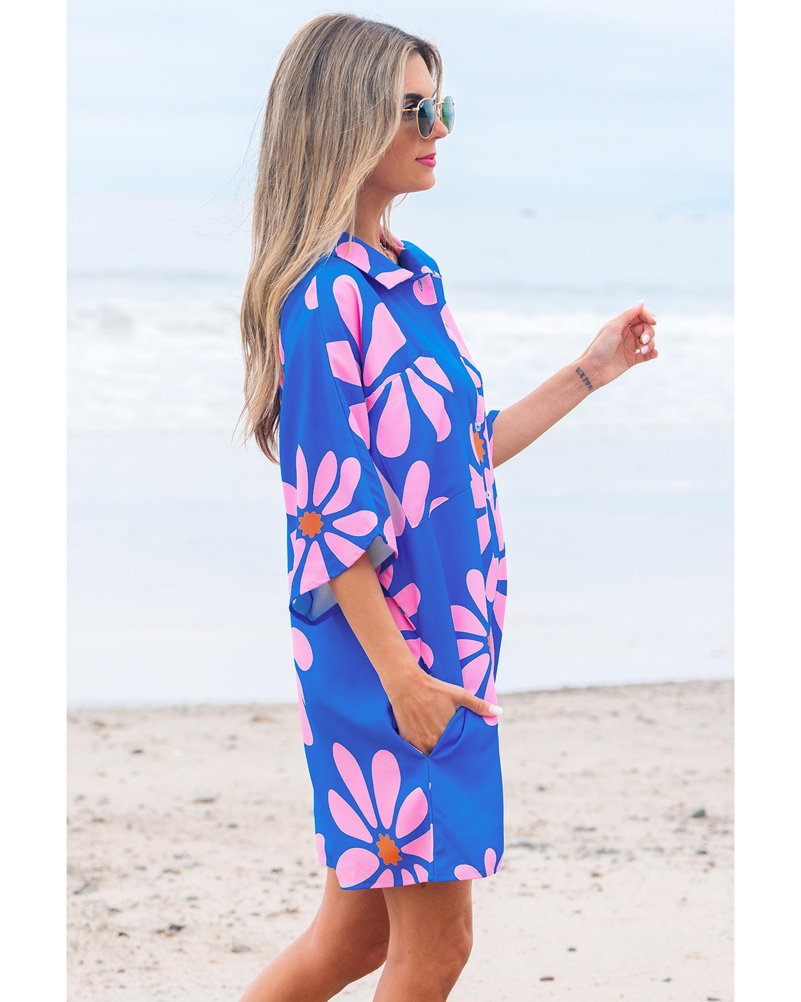 - Blue Summer Flower Print Shirt Collar Button Front Loose Romper