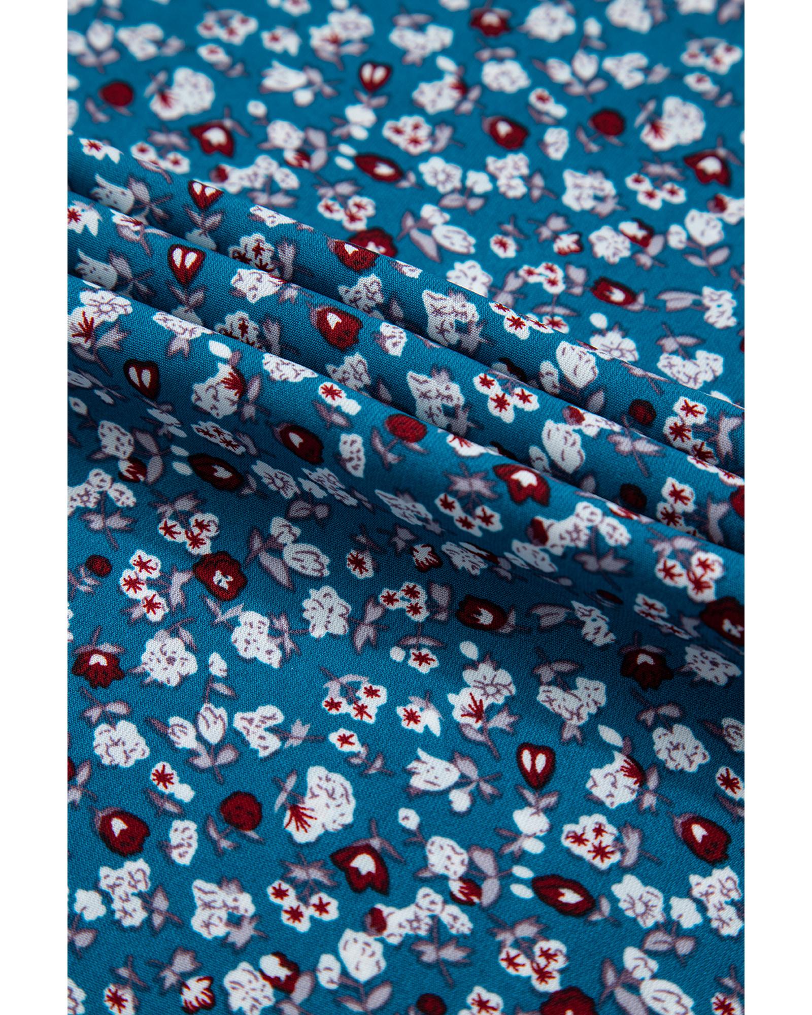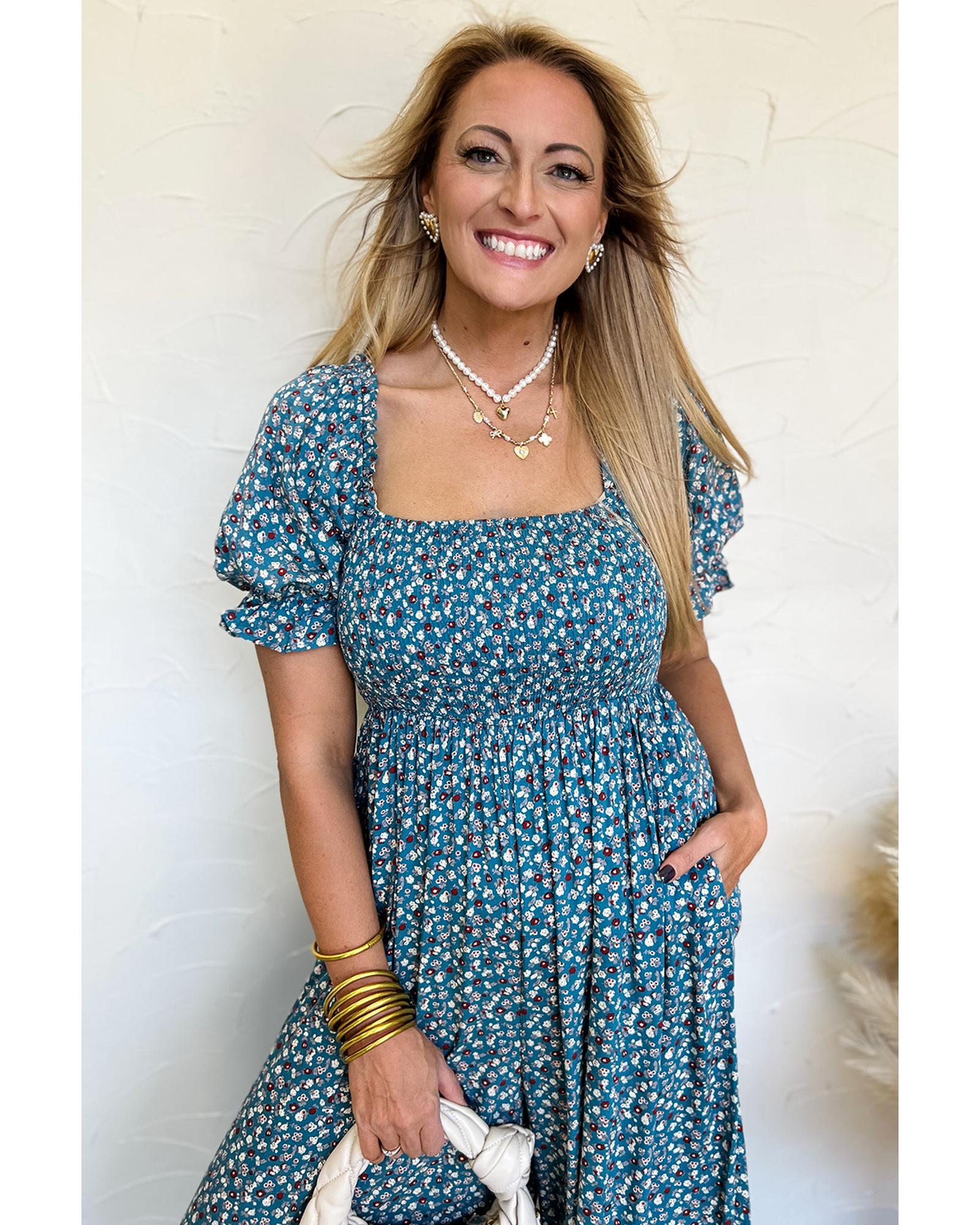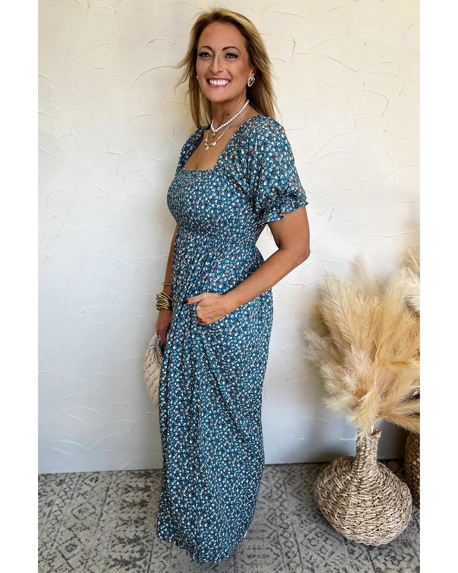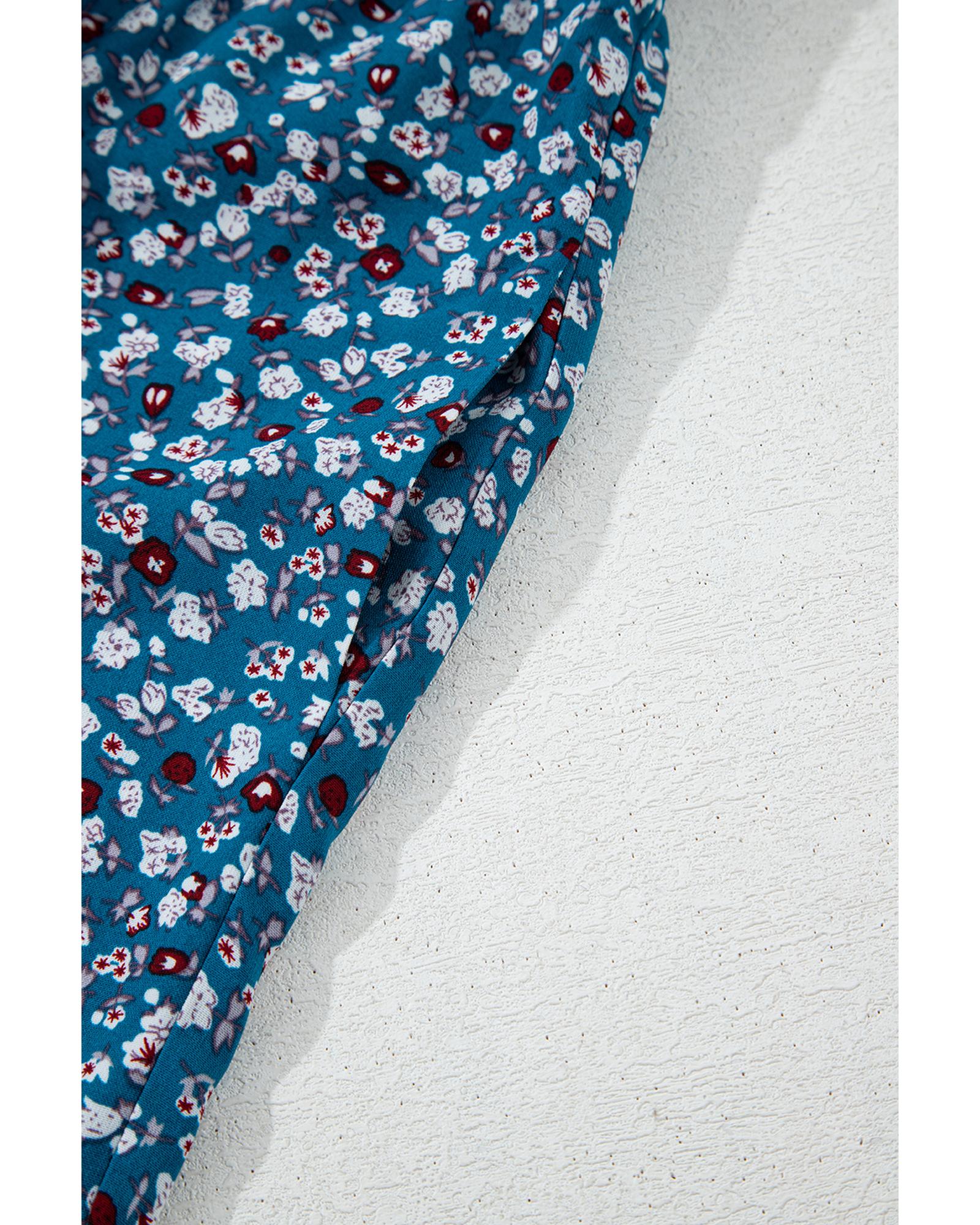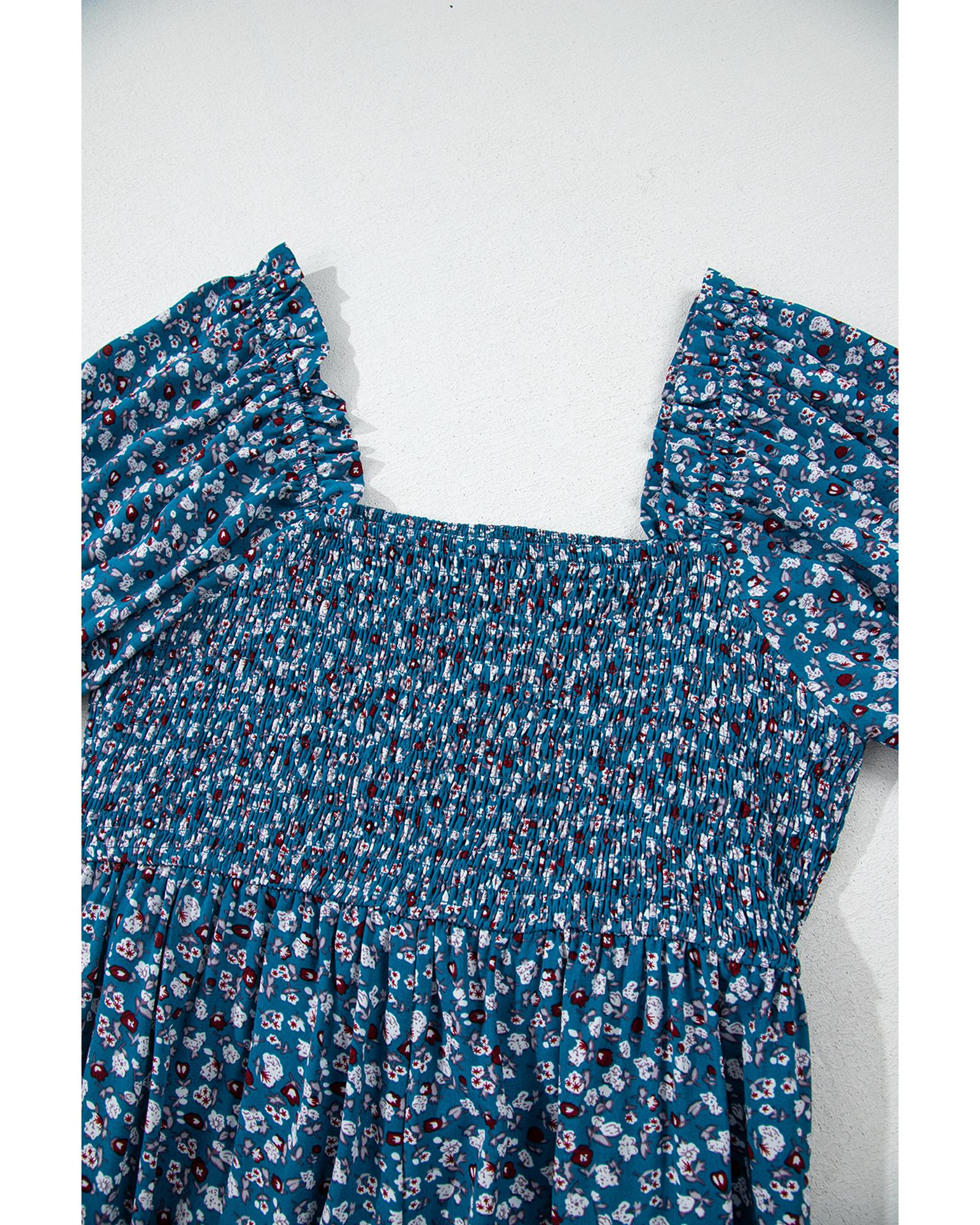 Blue Vintage Boho Floral Smocked Short Puff Sleeve Wide Leg Jumpsuit - M