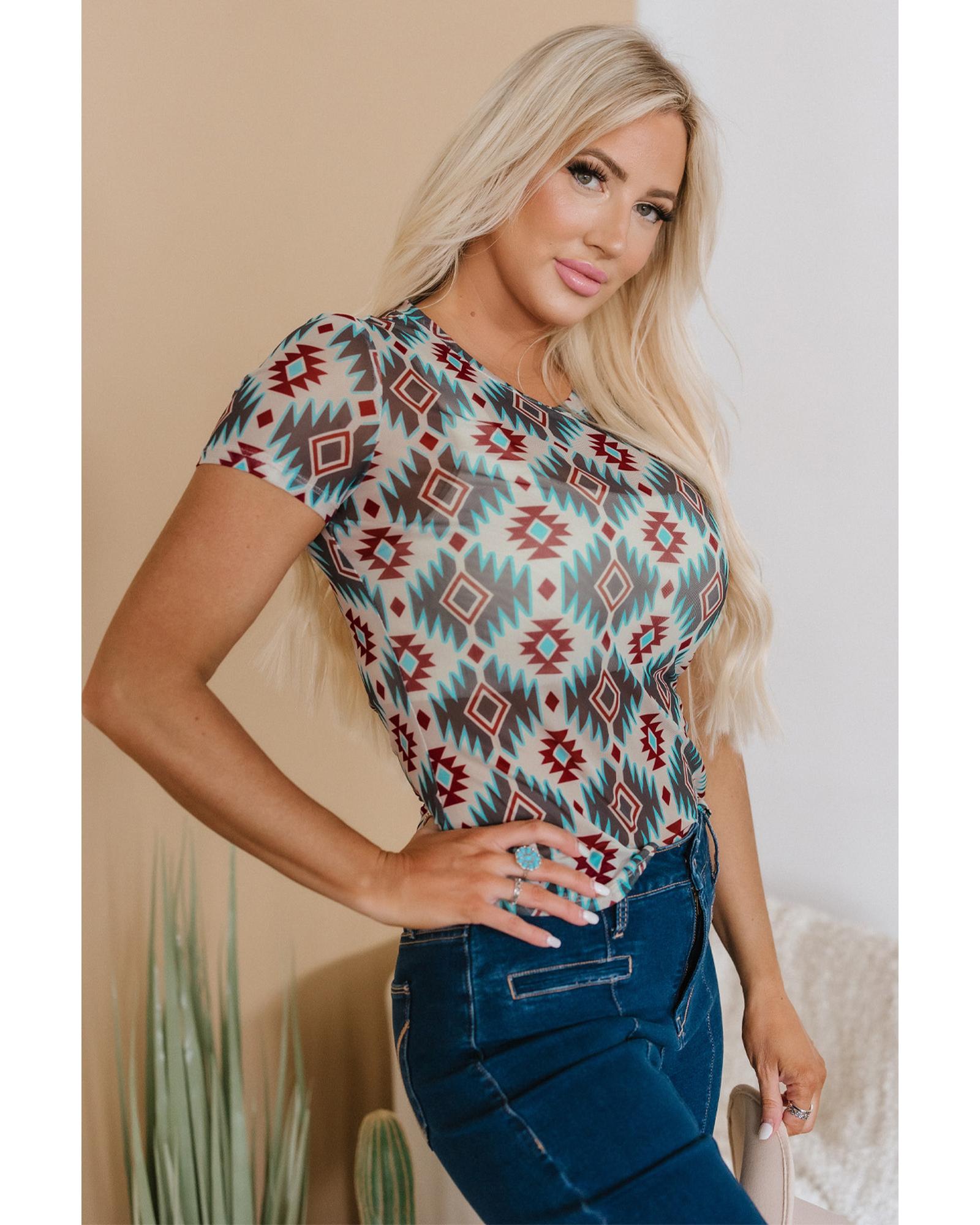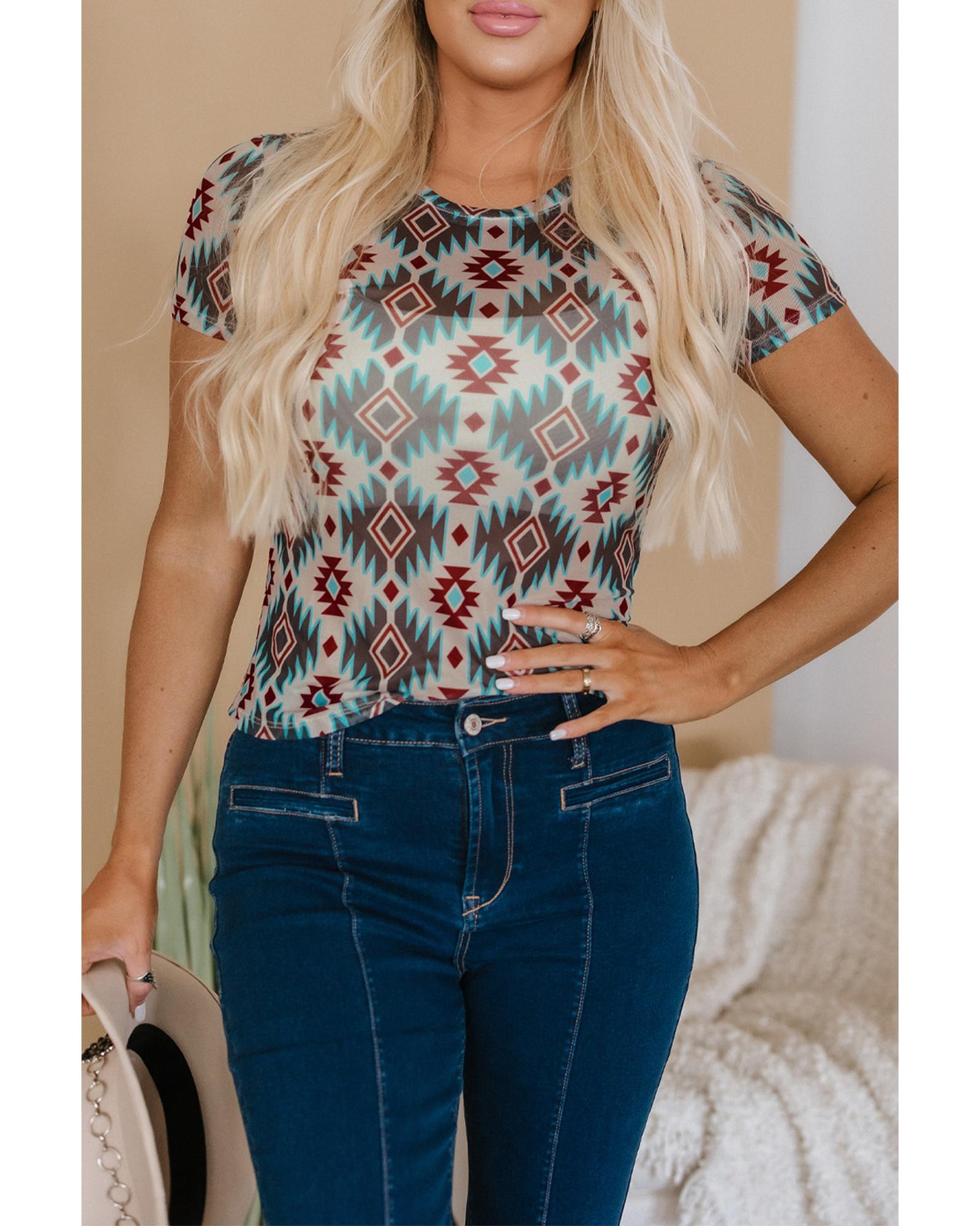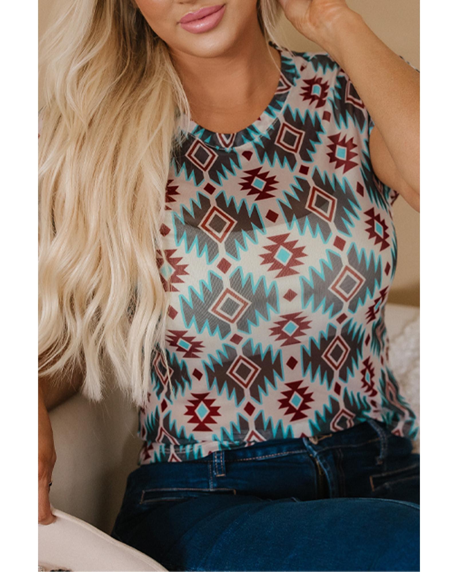 Blue Western Aztec Print Mesh Slim T Shirt – M