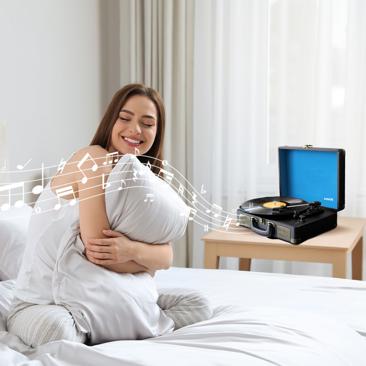 Whether you’re spinning old-school records or curating your backyard playlist, the Laser Bluetooth Suitcase Turntable is made to move with you. Just plug in, pair up, and press play.