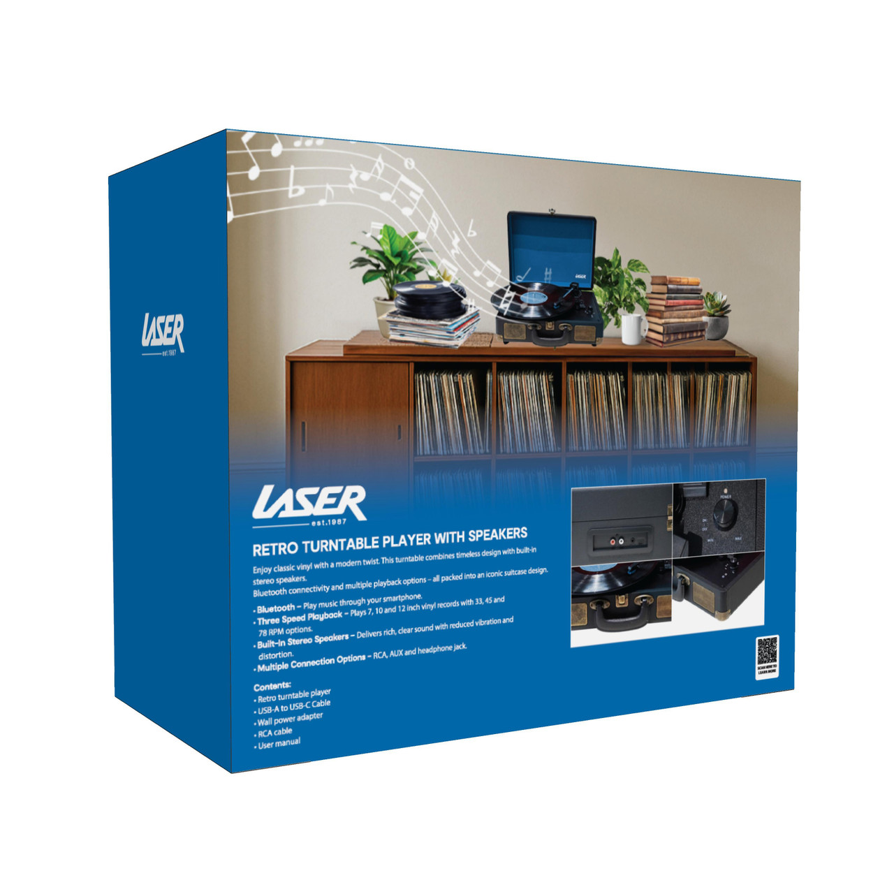 Vintage charm meets modern sound with the Laser Bluetooth Suitcase Turntable with Built-in Speaker.
