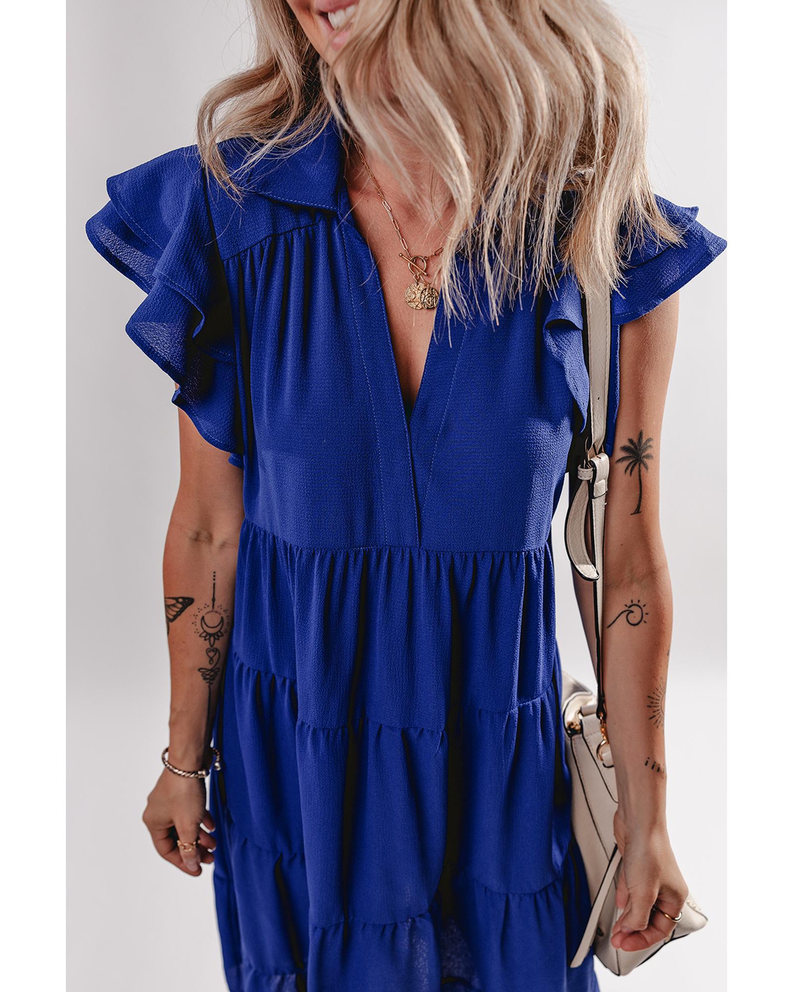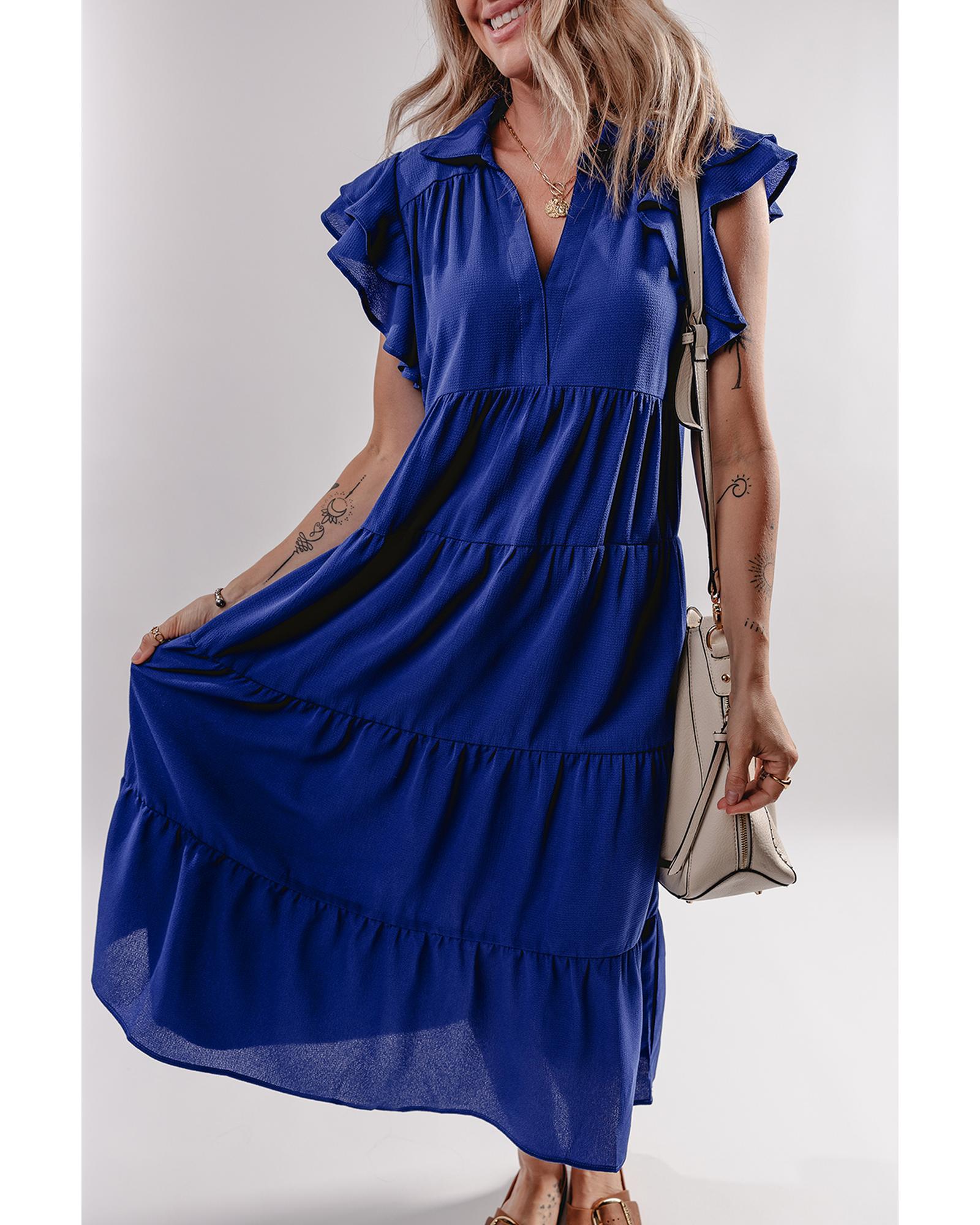 Bluing Ruffled Short Sleeve Collared V Neck Tiered Midi Dress – M