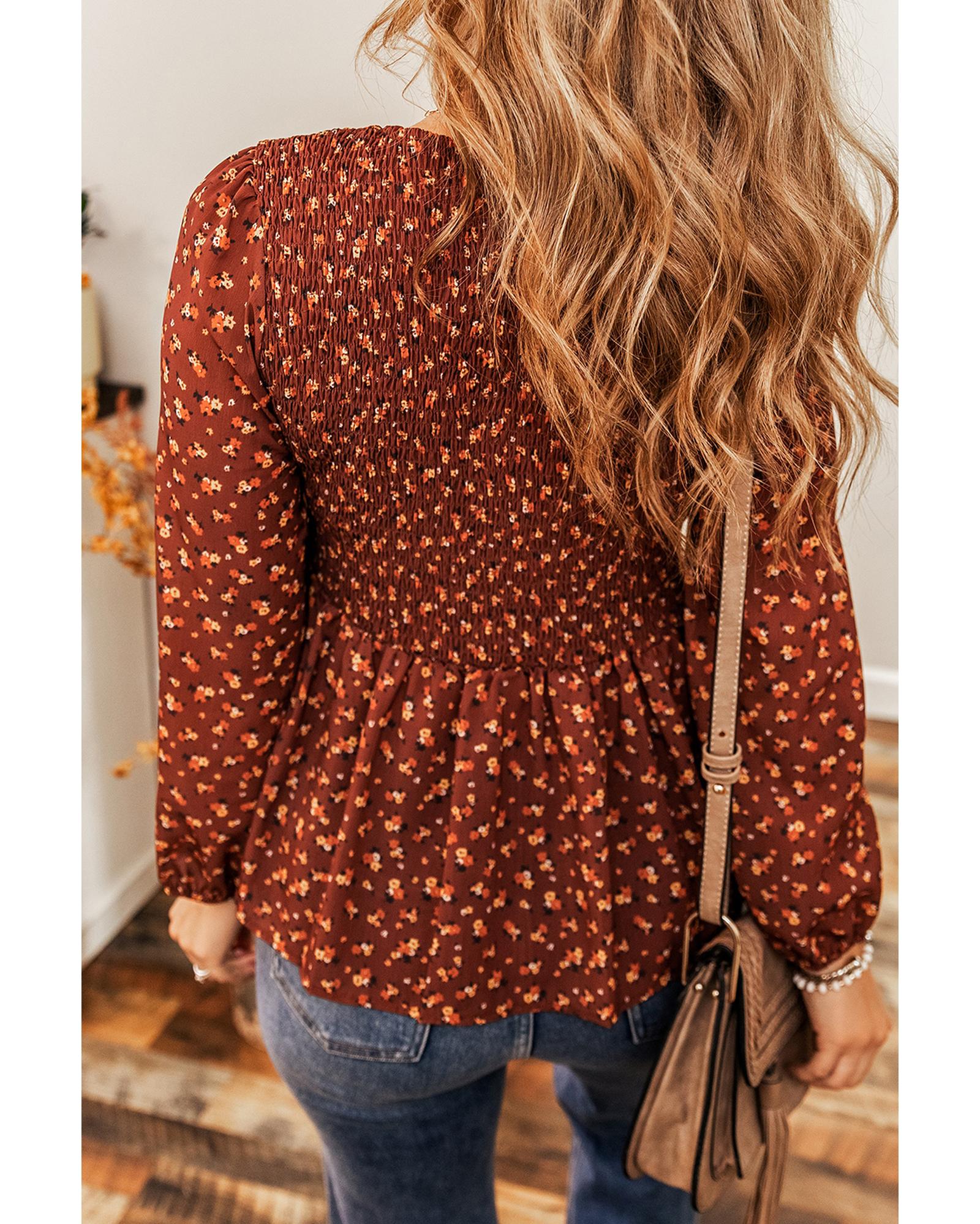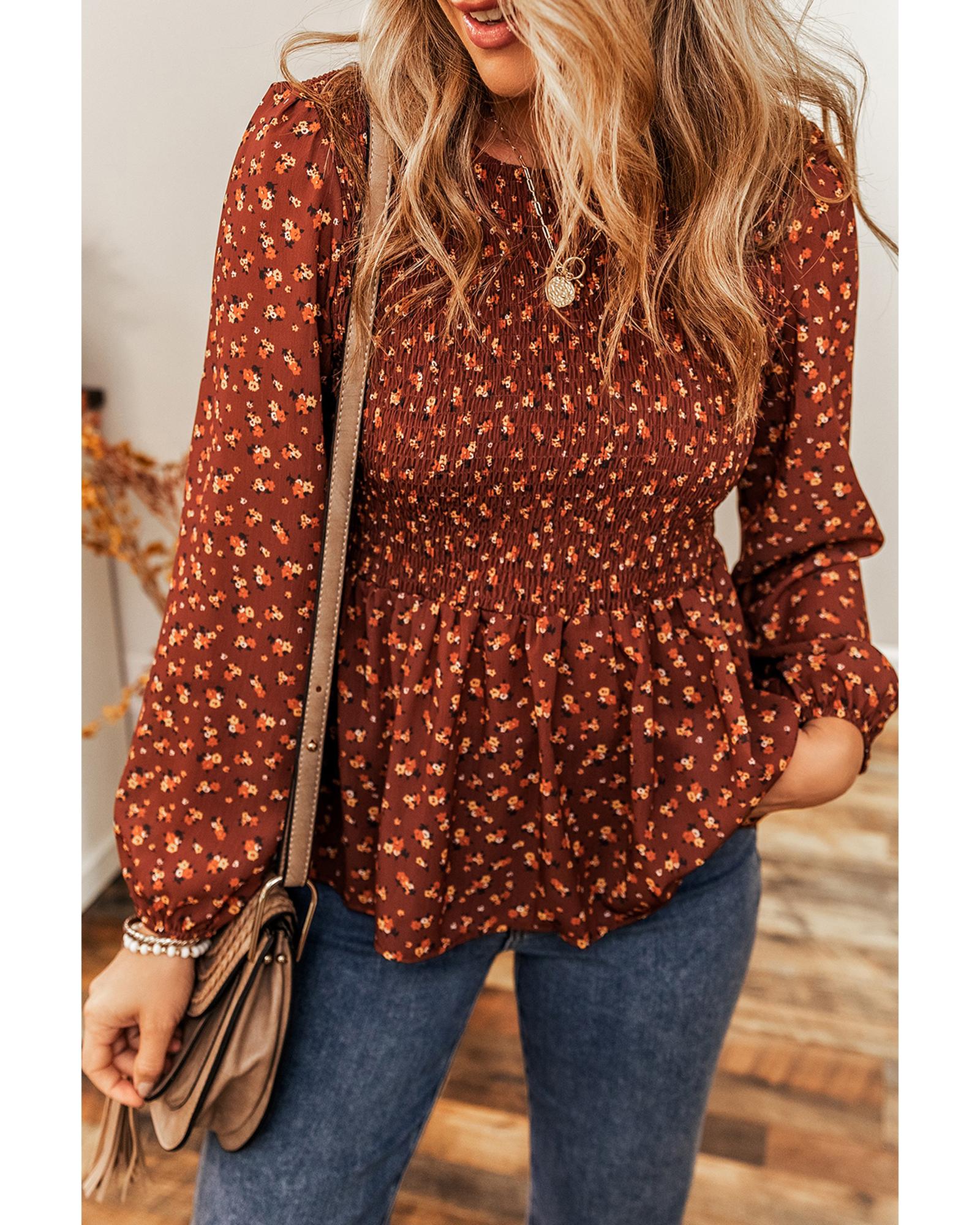 Boho Floral Smocked Bust Ruffled Peplum Blouse – S