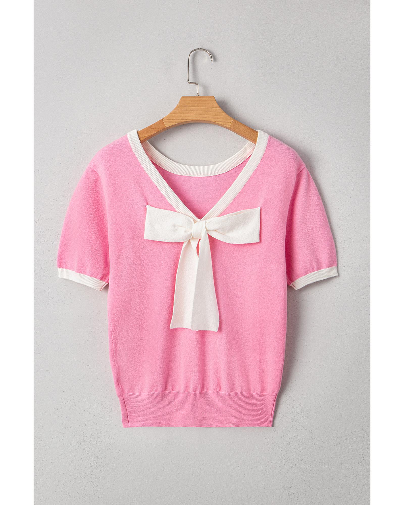 Bonbon Colorblock Bow V-Shape Cut Back Short Sleeve Sweater – XL