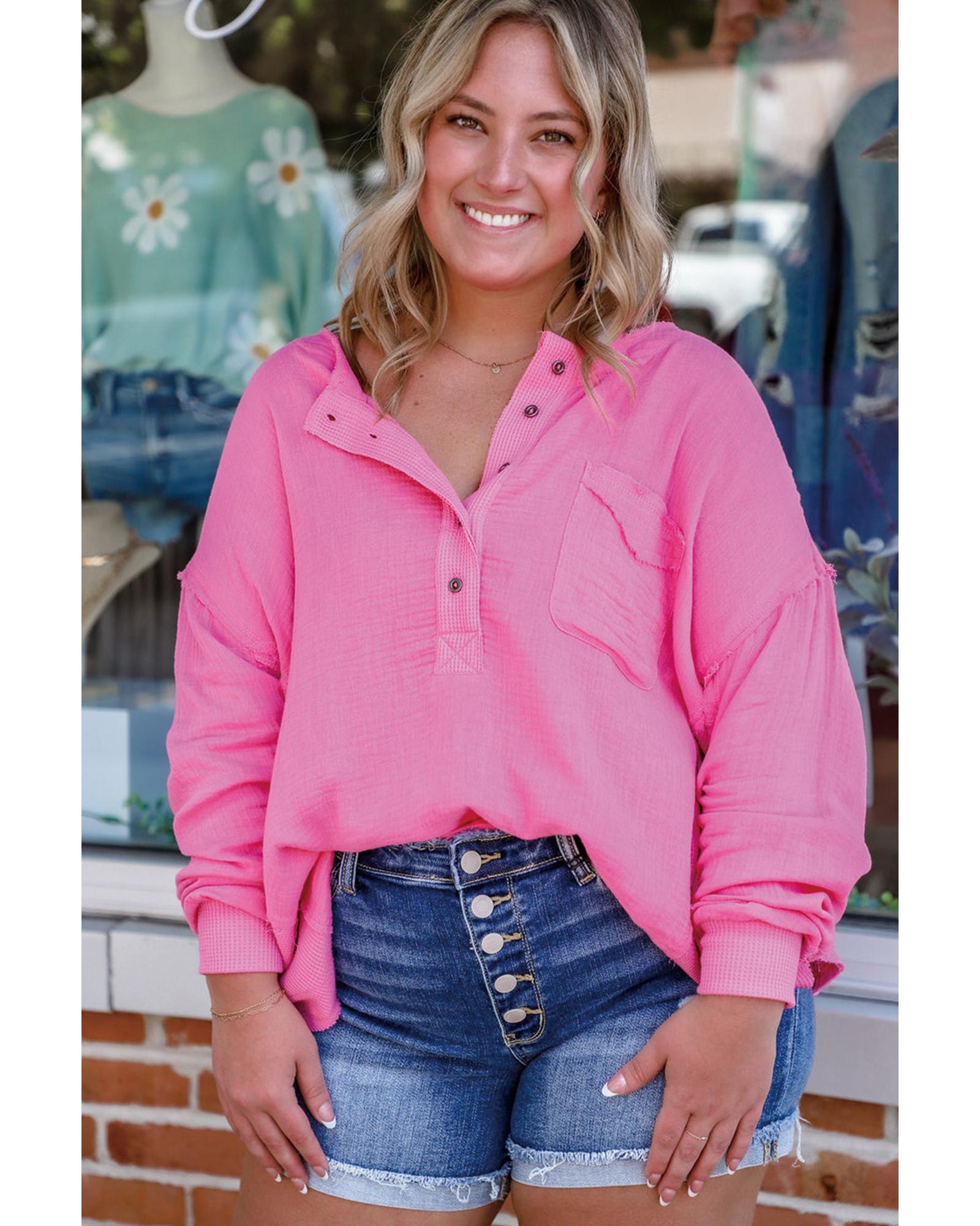 Bonbon Half Buttons Chest Pocket Drop Sleeve Plus Size Top – 2X