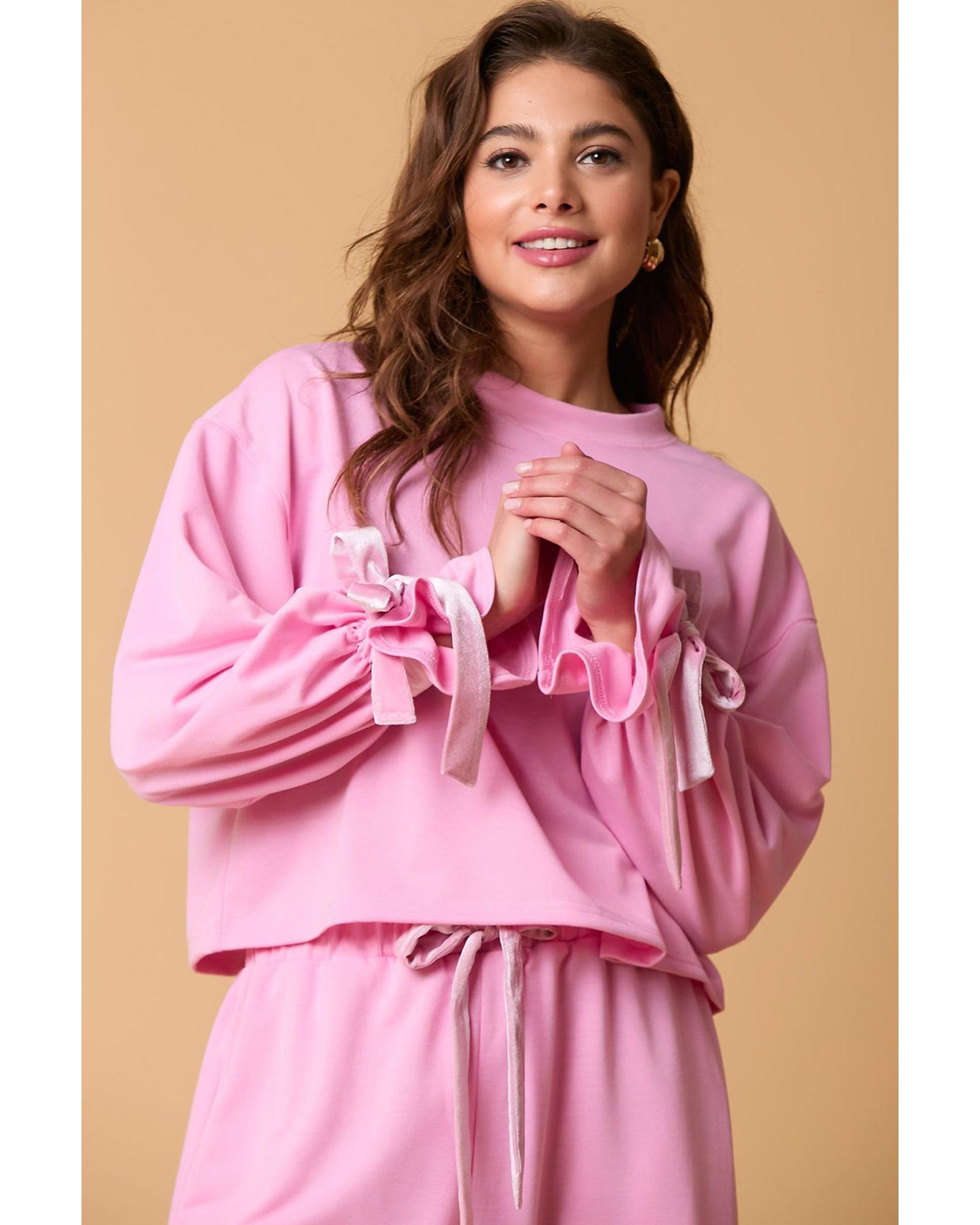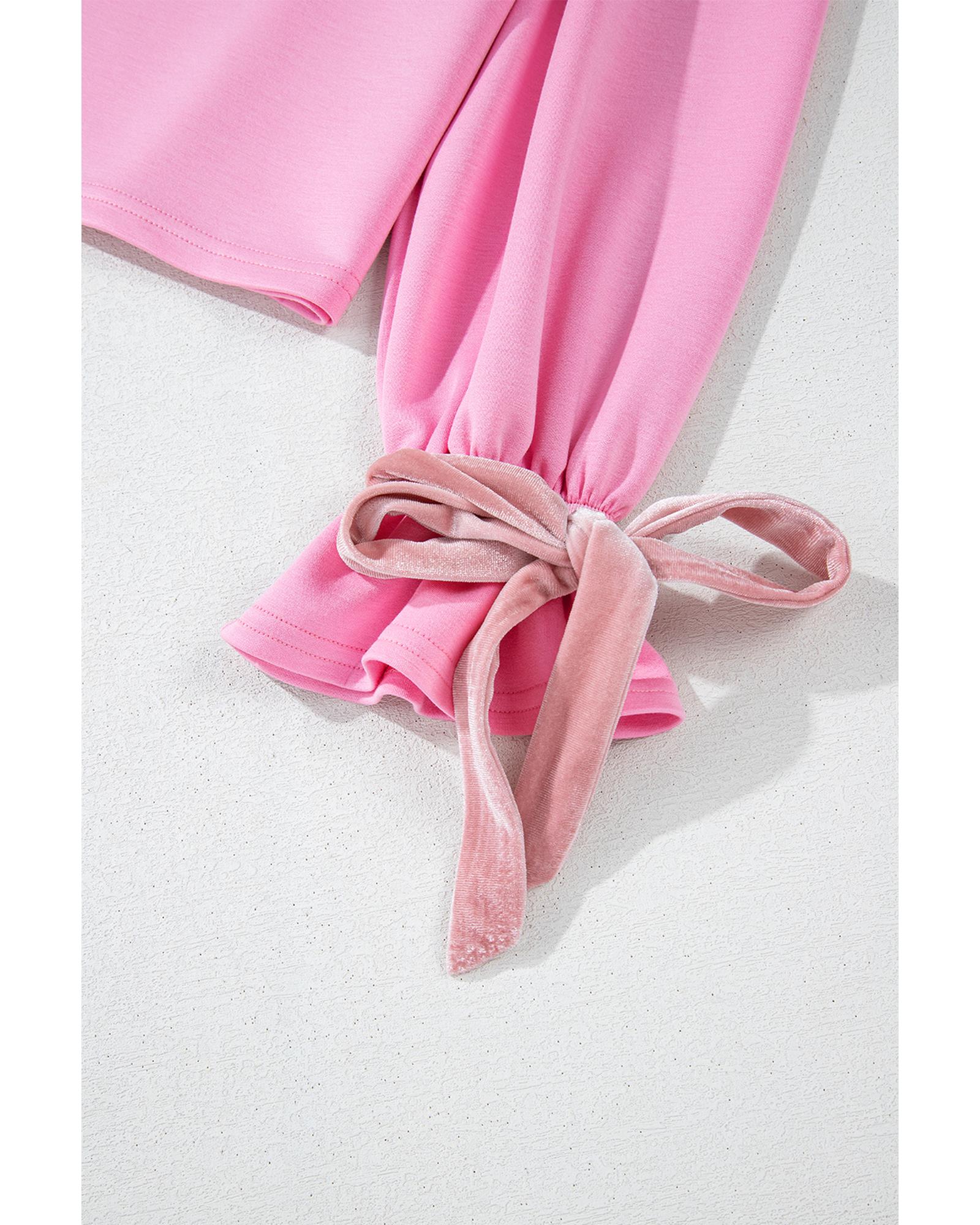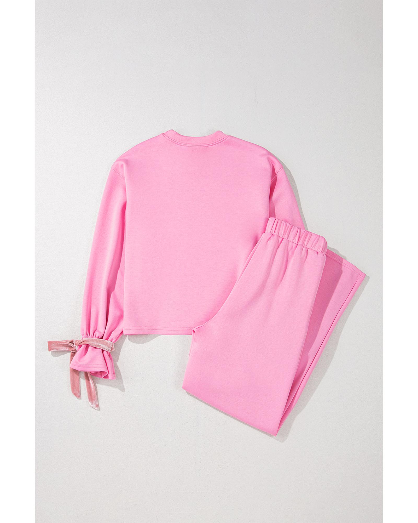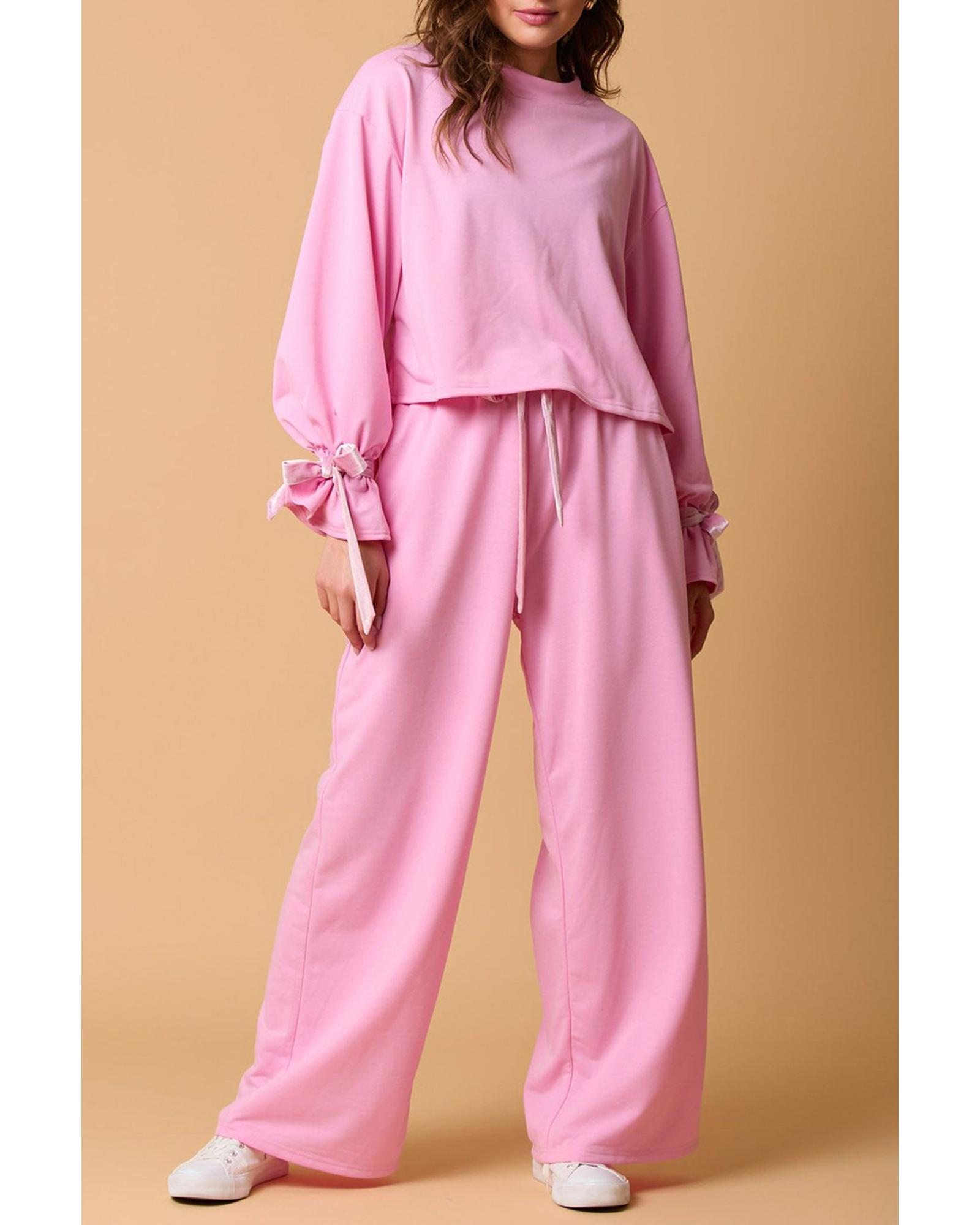 Bonbon Solid Color Drawstring Long Sleeve Top and Pants Set – L