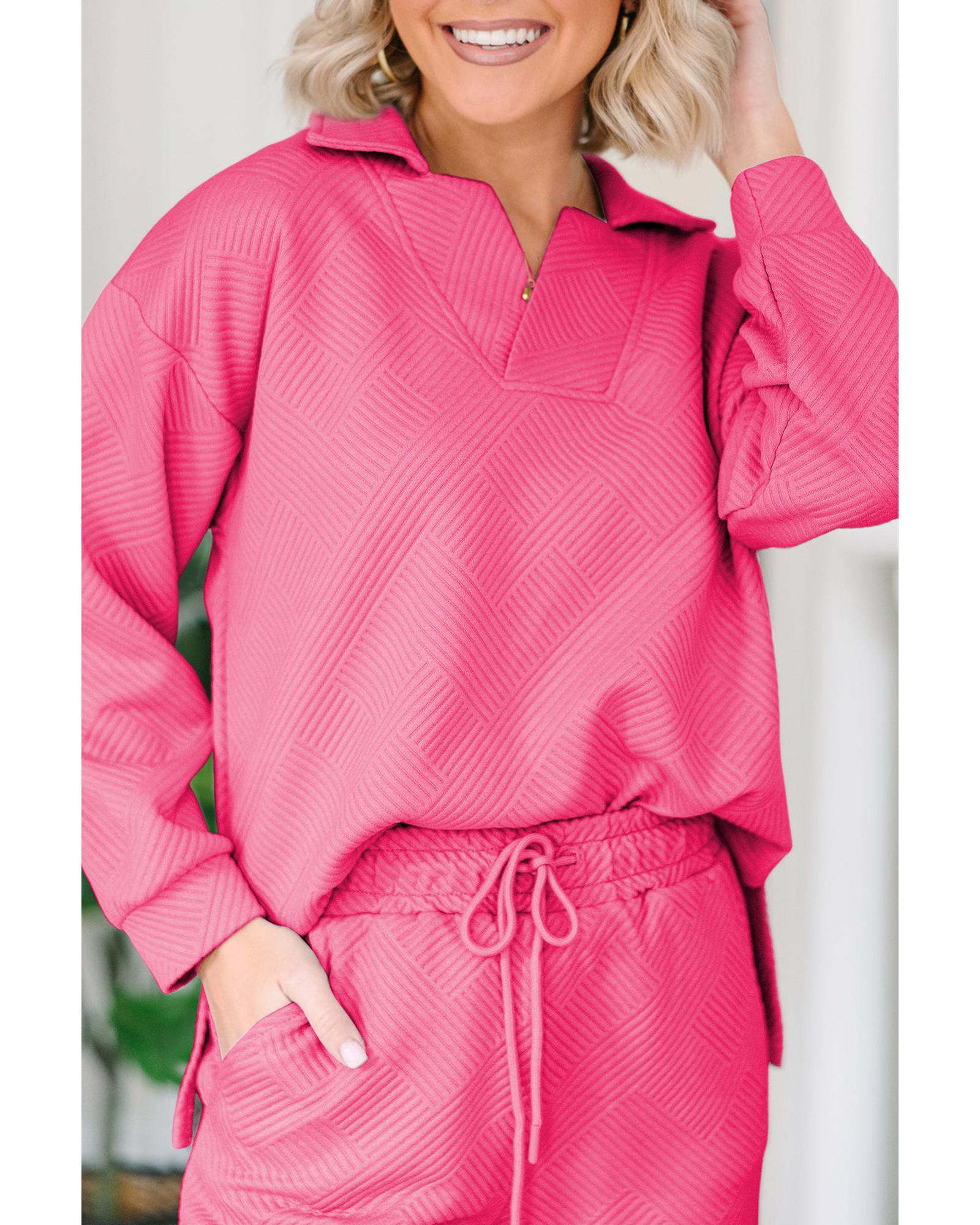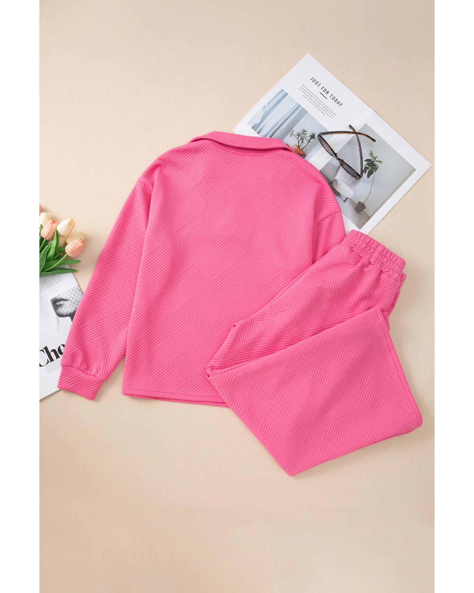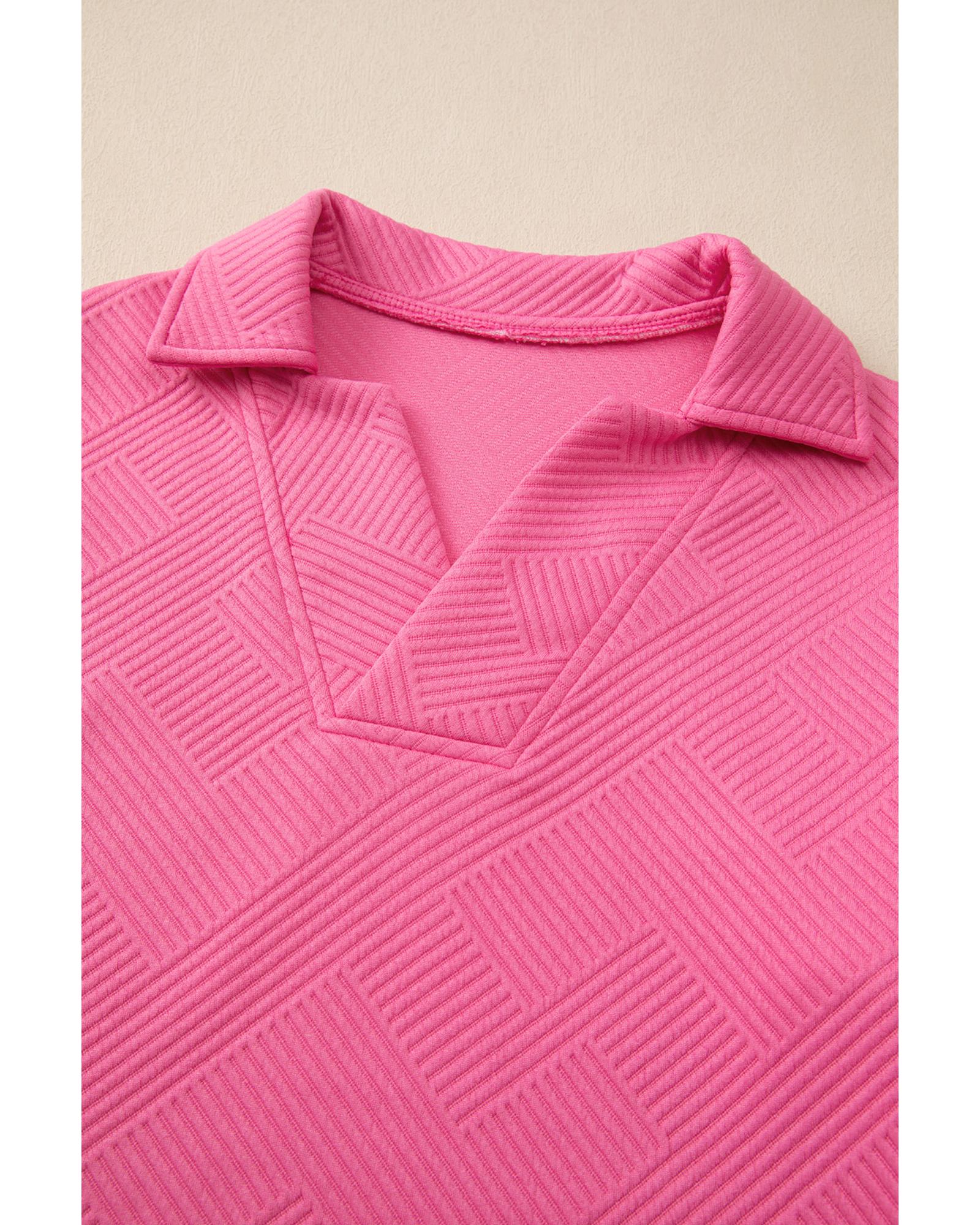 • Bonbon Solid Textured Collared V Neck Top and Wide Leg Pants Set