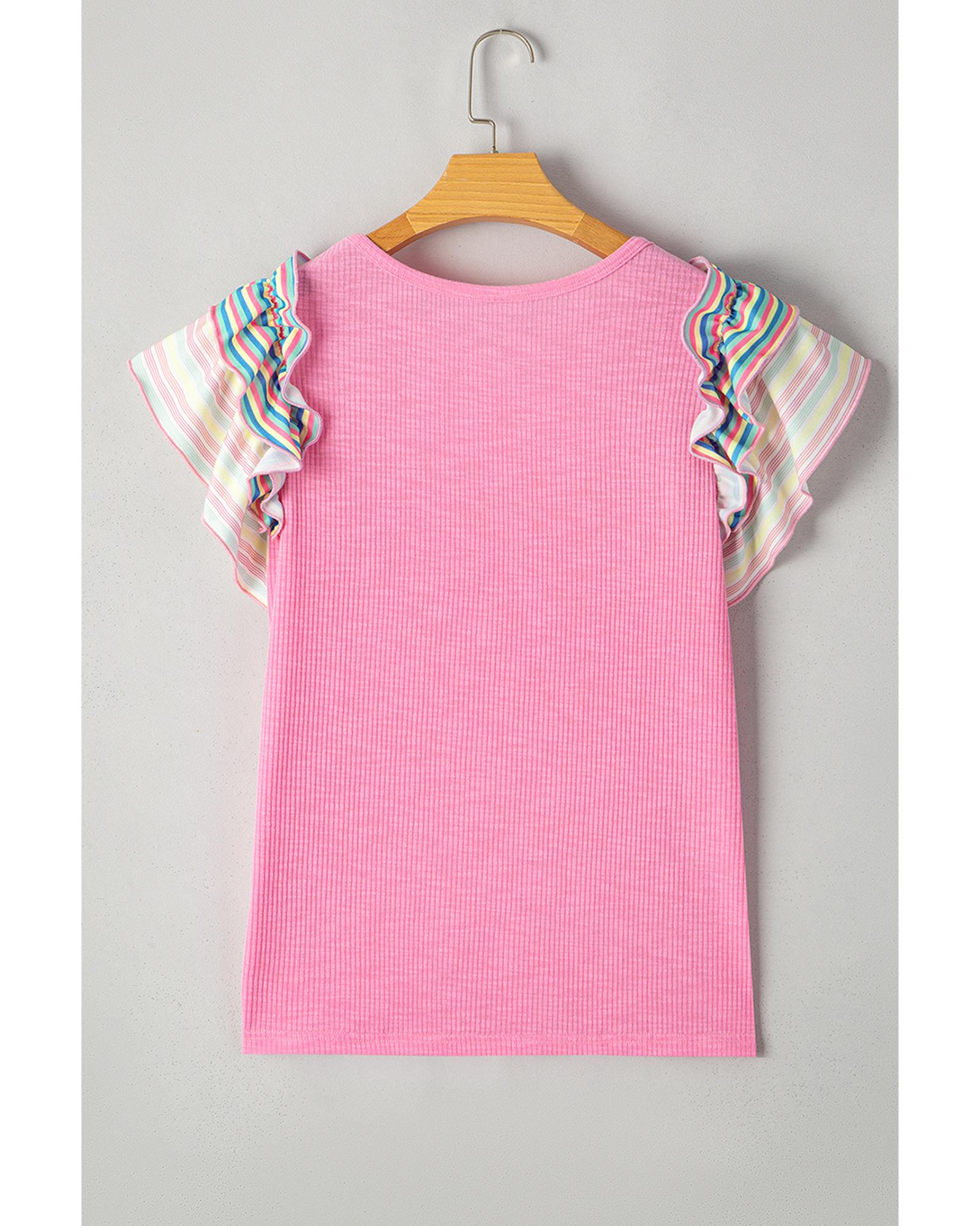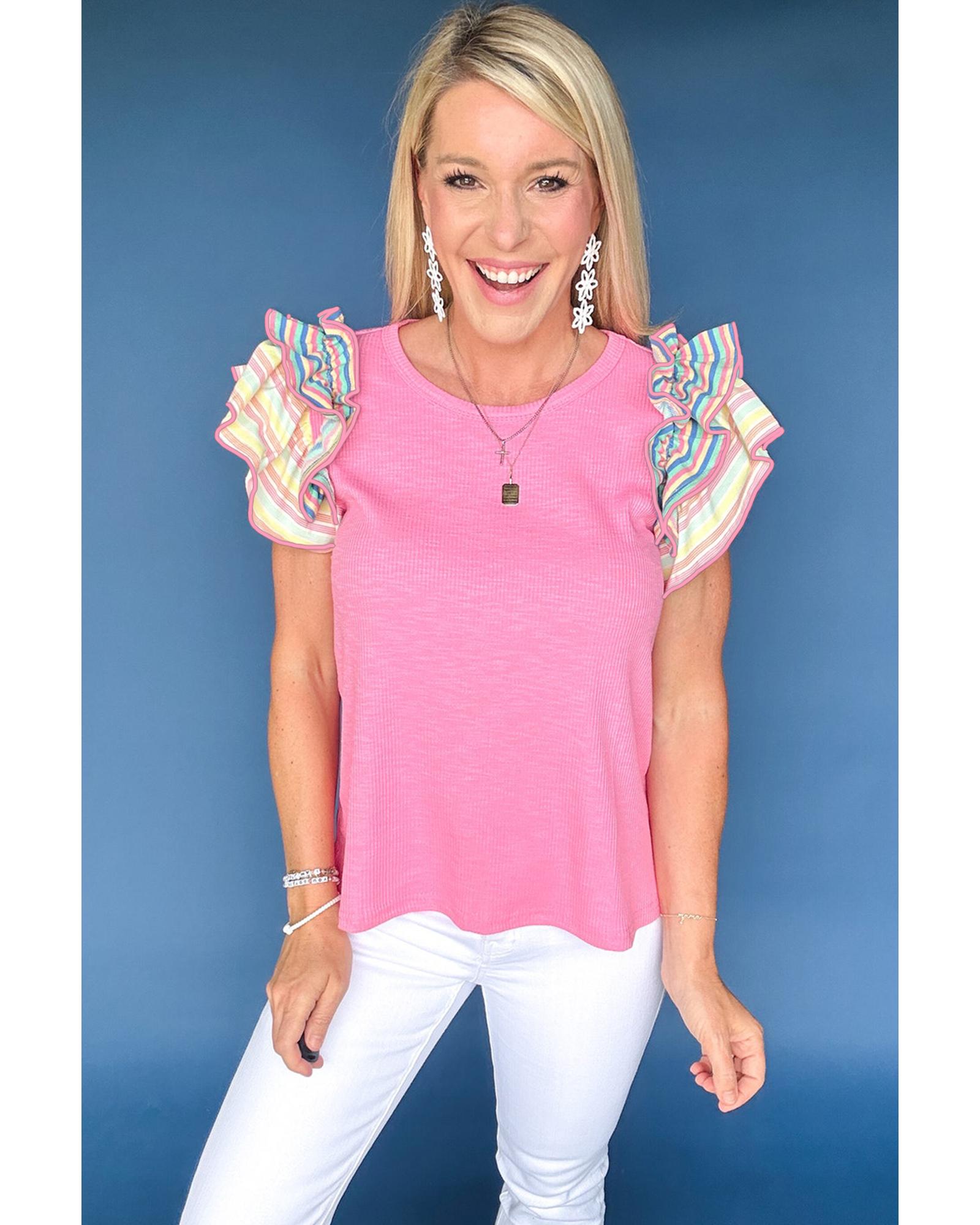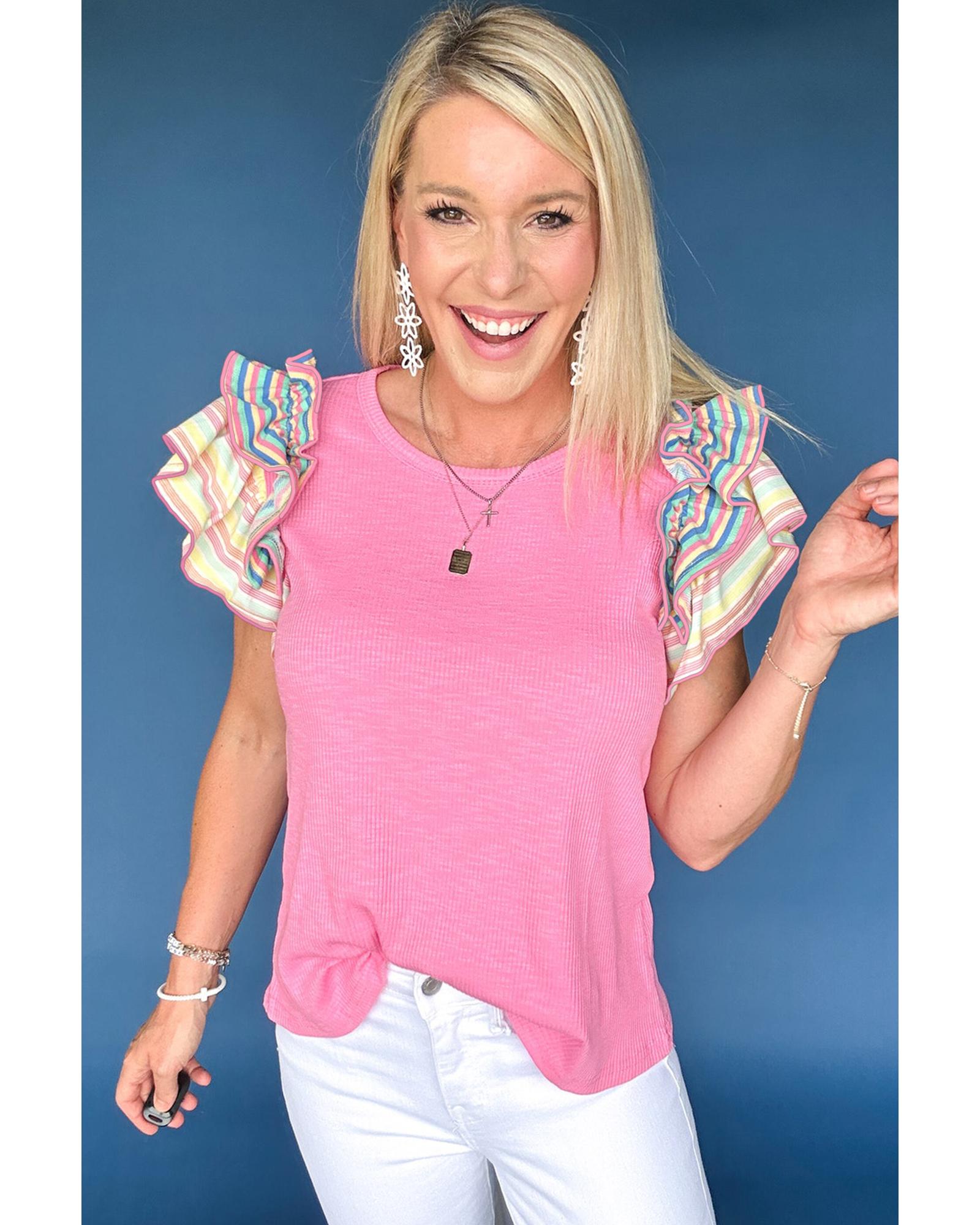 Bonbon Striped Ruffle Flutter Sleeve Ribbed Blouse – M