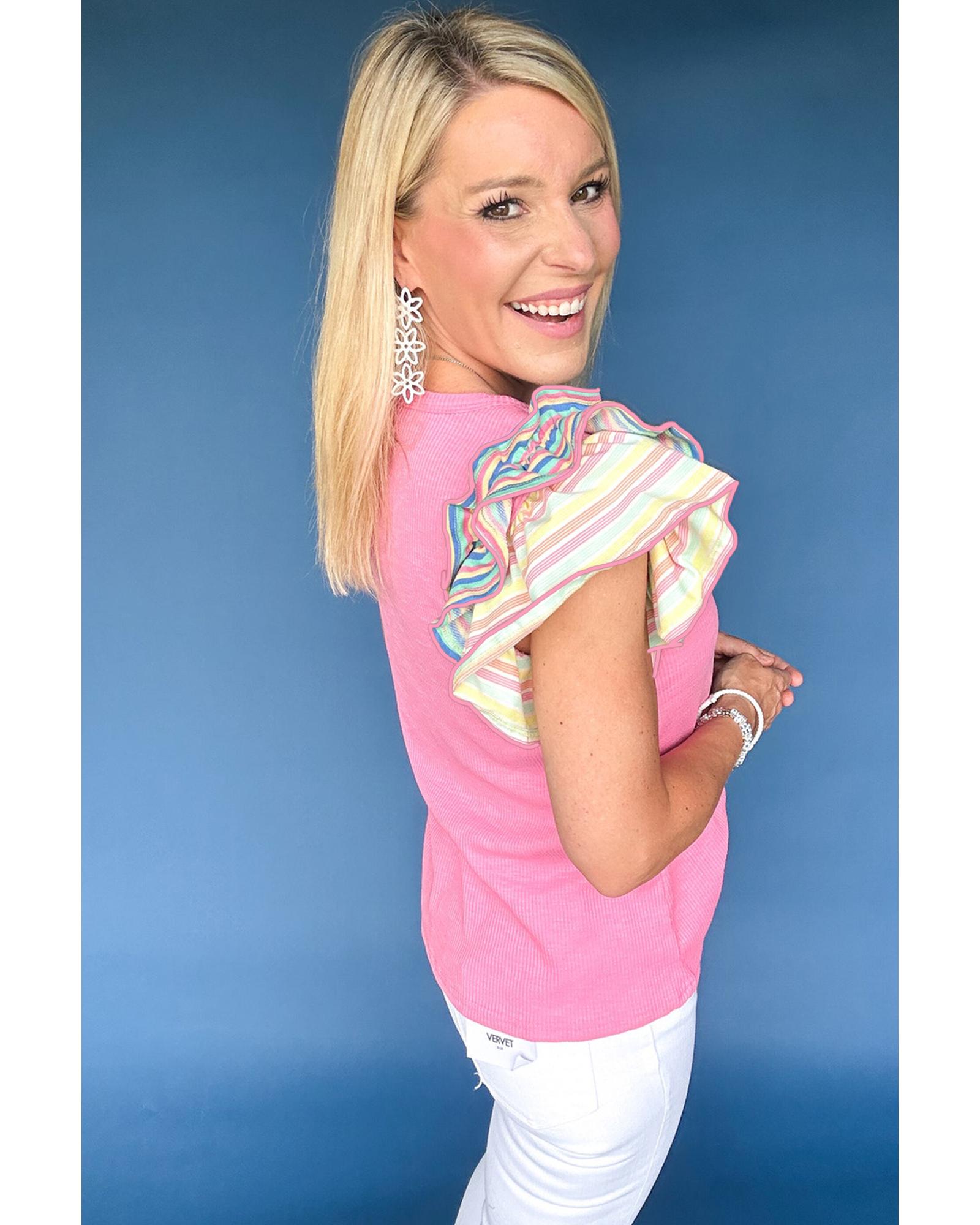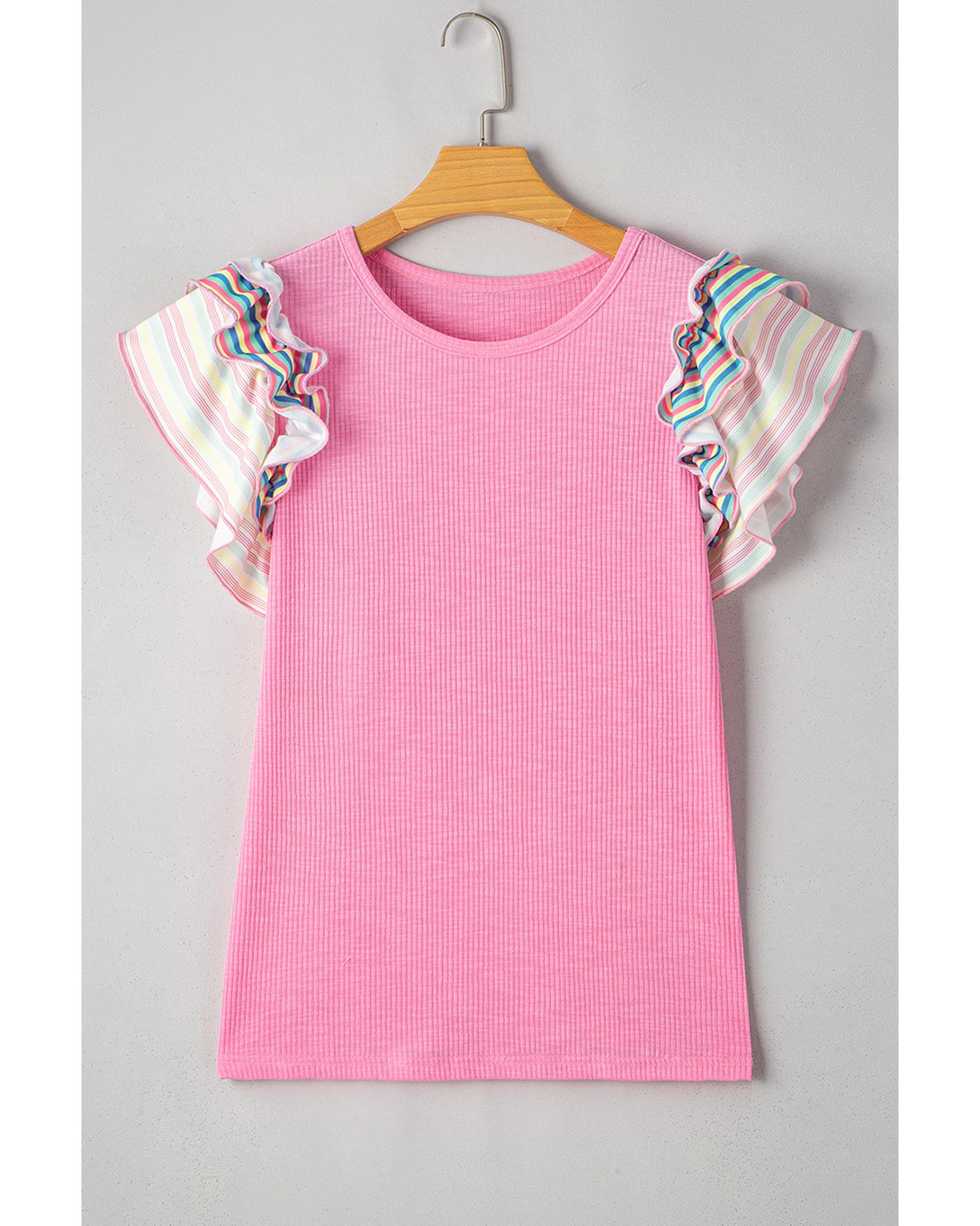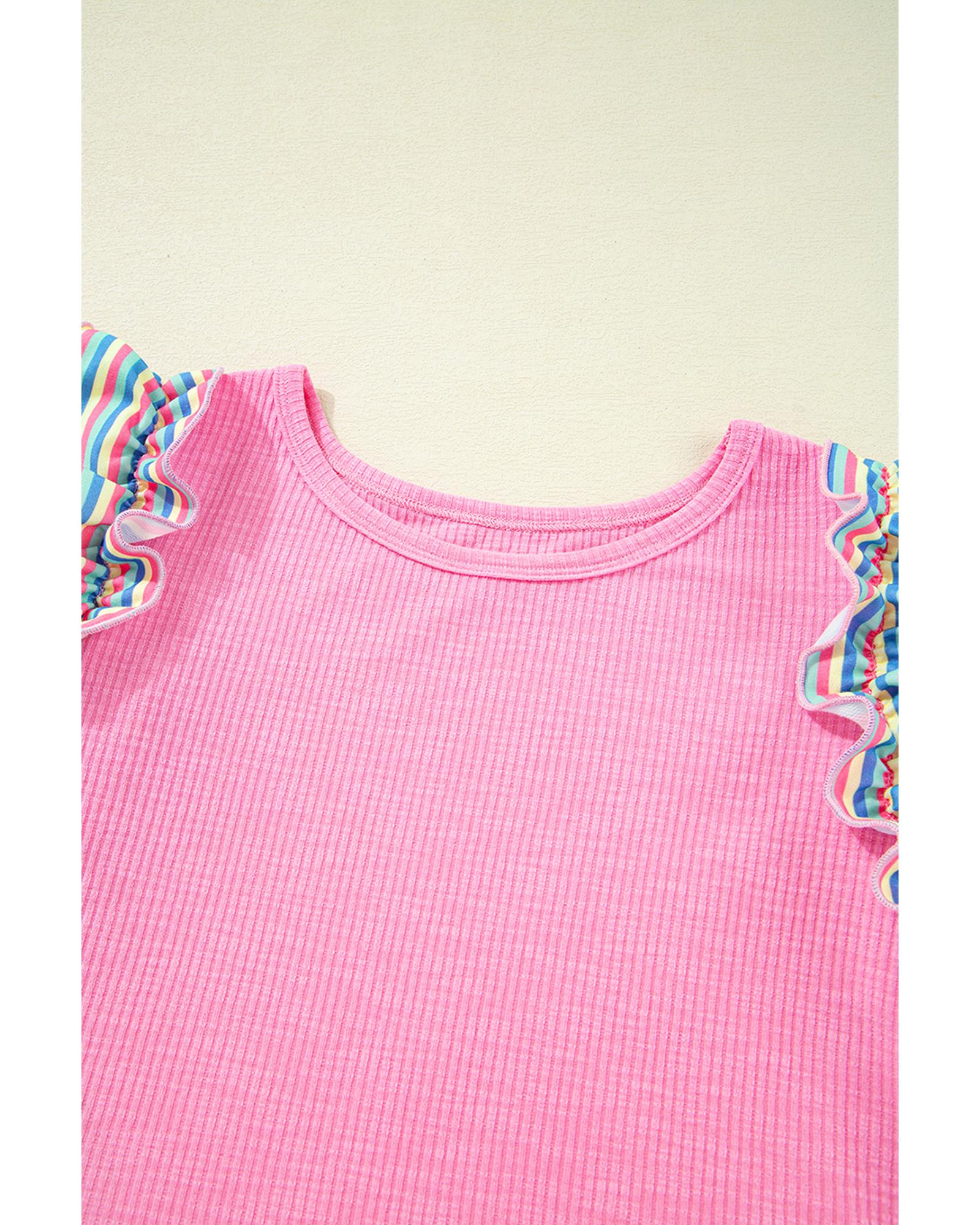 Bonbon Striped Ruffle Flutter Sleeve Ribbed Blouse – M