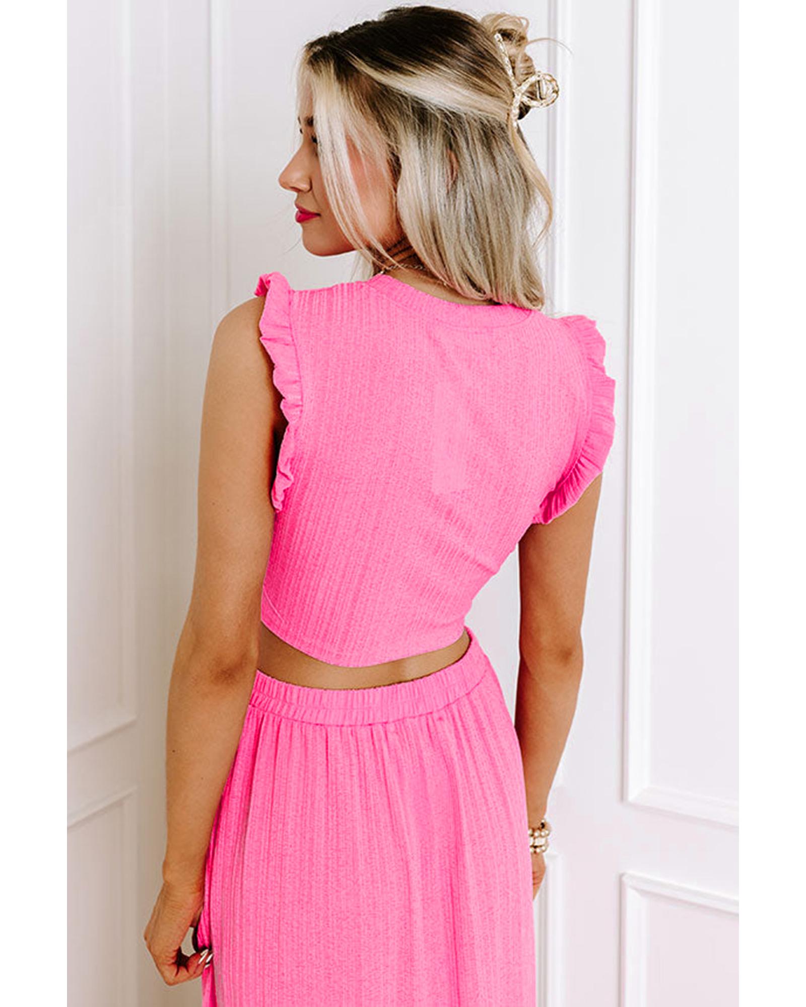 Bonbon Textured Ruffle Trim Crop Vest Lace-up Long Skirt Set – XL
