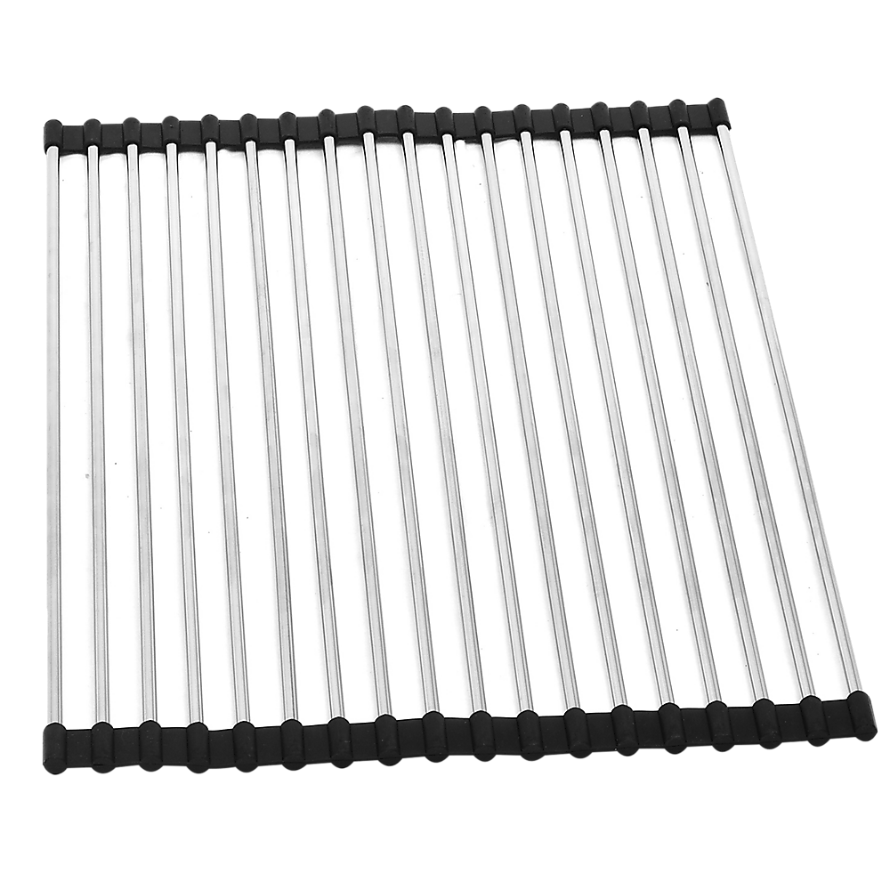 • Foldable dish drying rack. Constructed of stainless steel bars and a flexible silicone frame allowing you to fold it up tightly for storage. Stainless steel bars make it hygienic and easy to clean. Strong enough to hold dishes or pots and pans.
