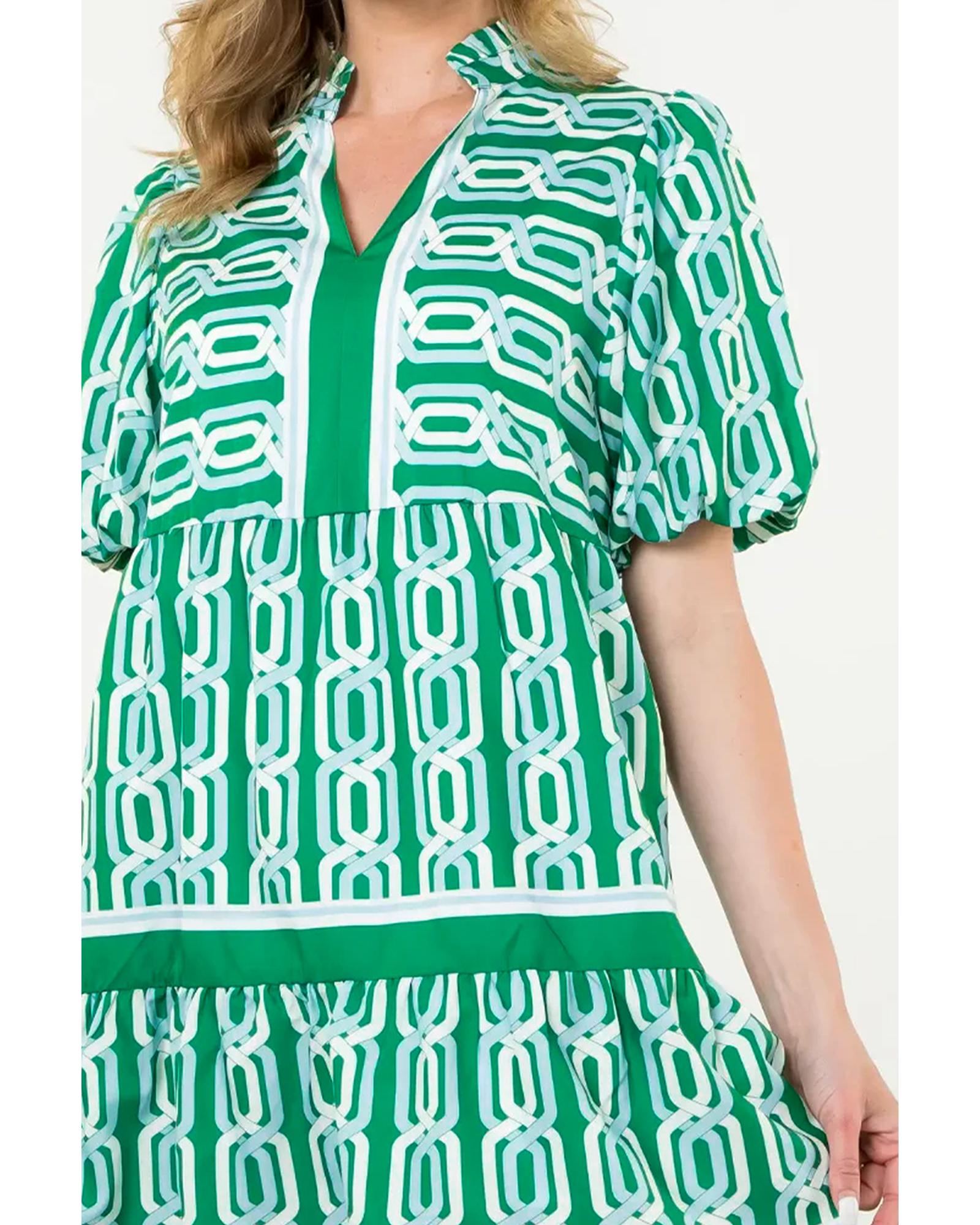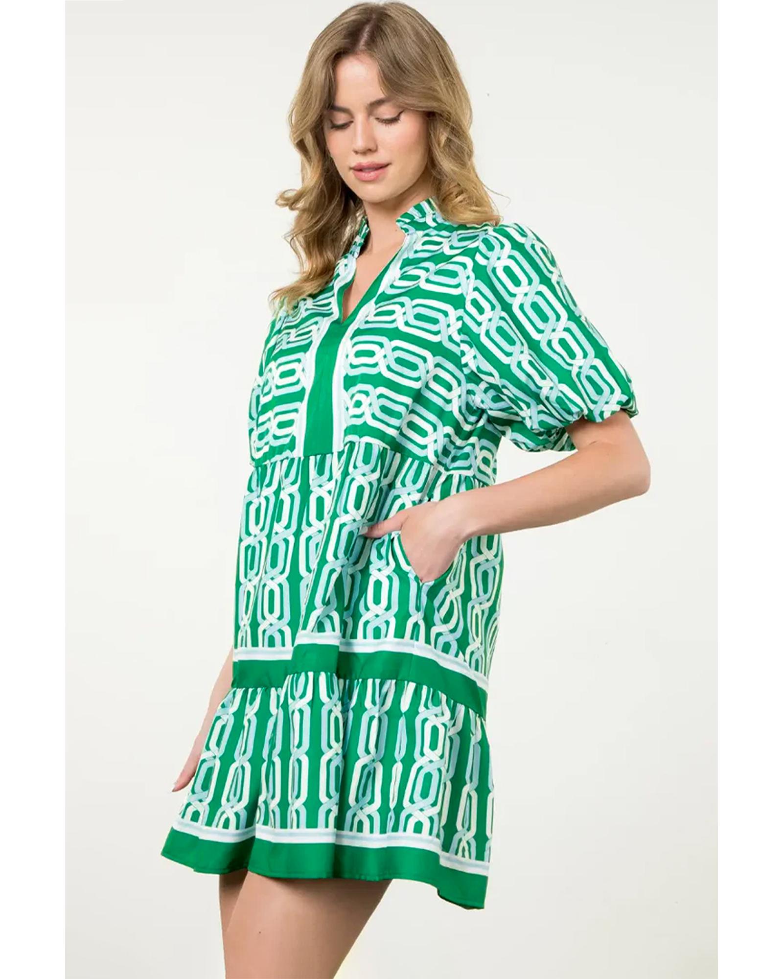 Bright Green Abstract Patterned V Neck Puff Short Sleeve Mini Dress – L