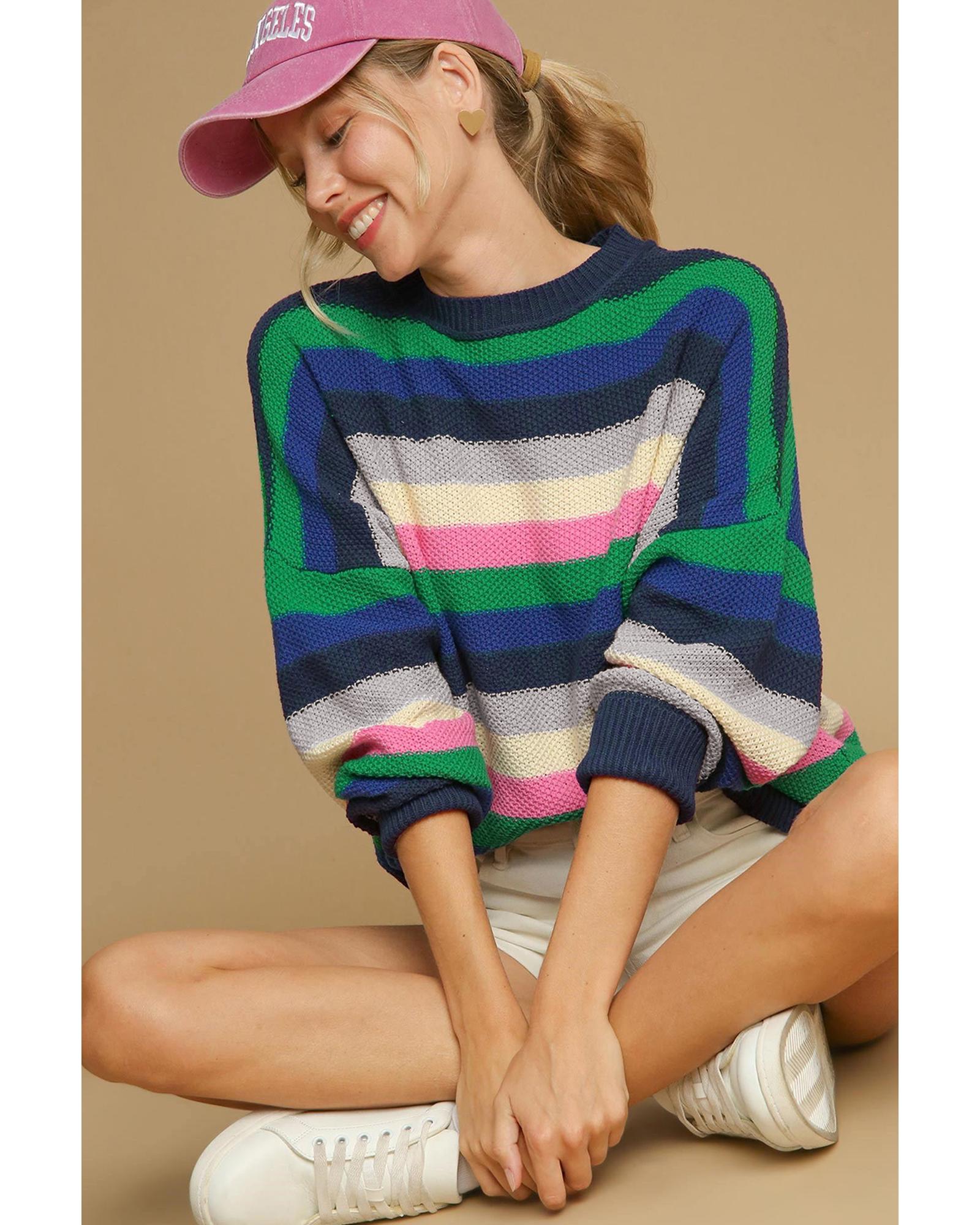 Bright Green Rainbow Striped Crew Neck Drop Shoulder Sweater – XL