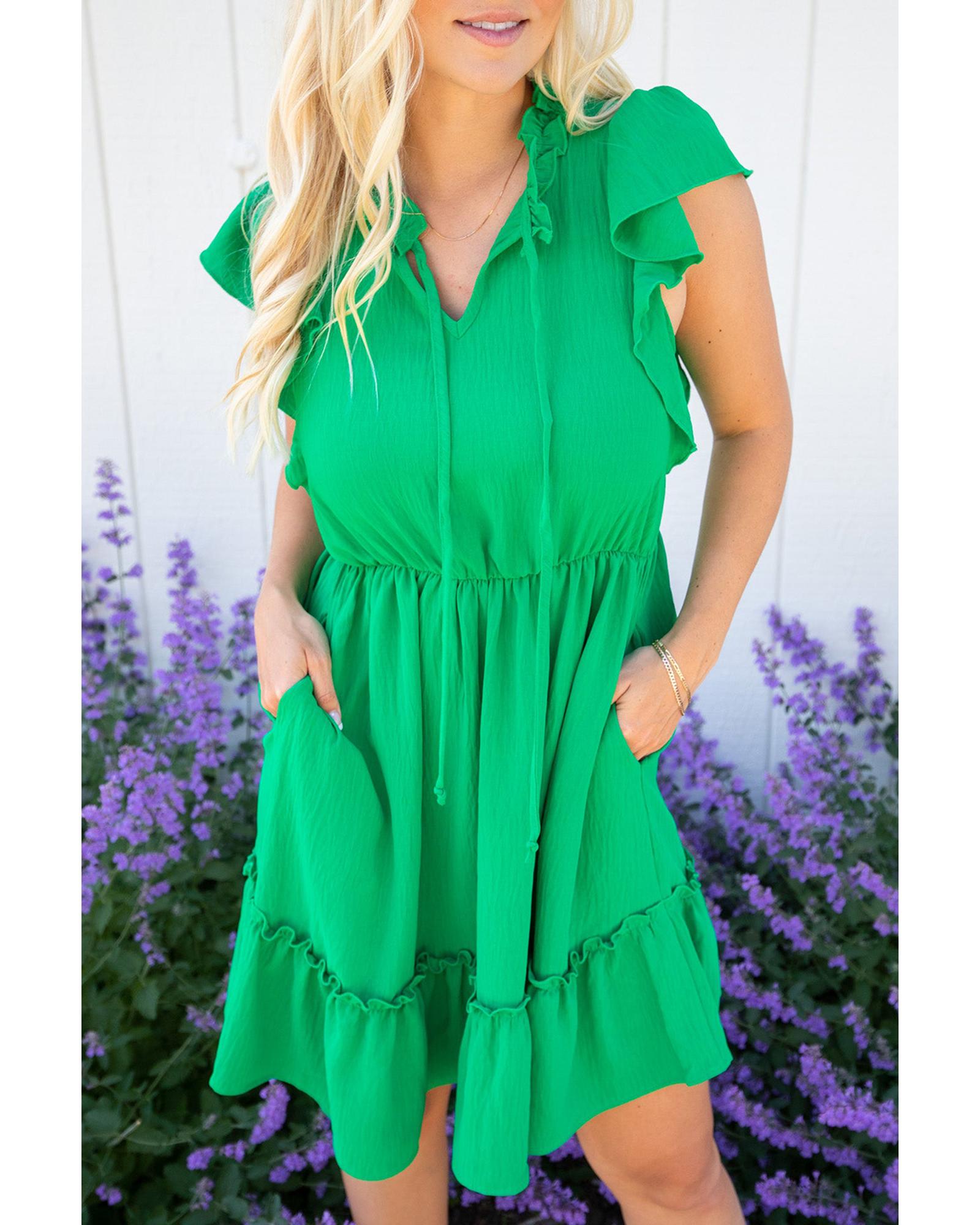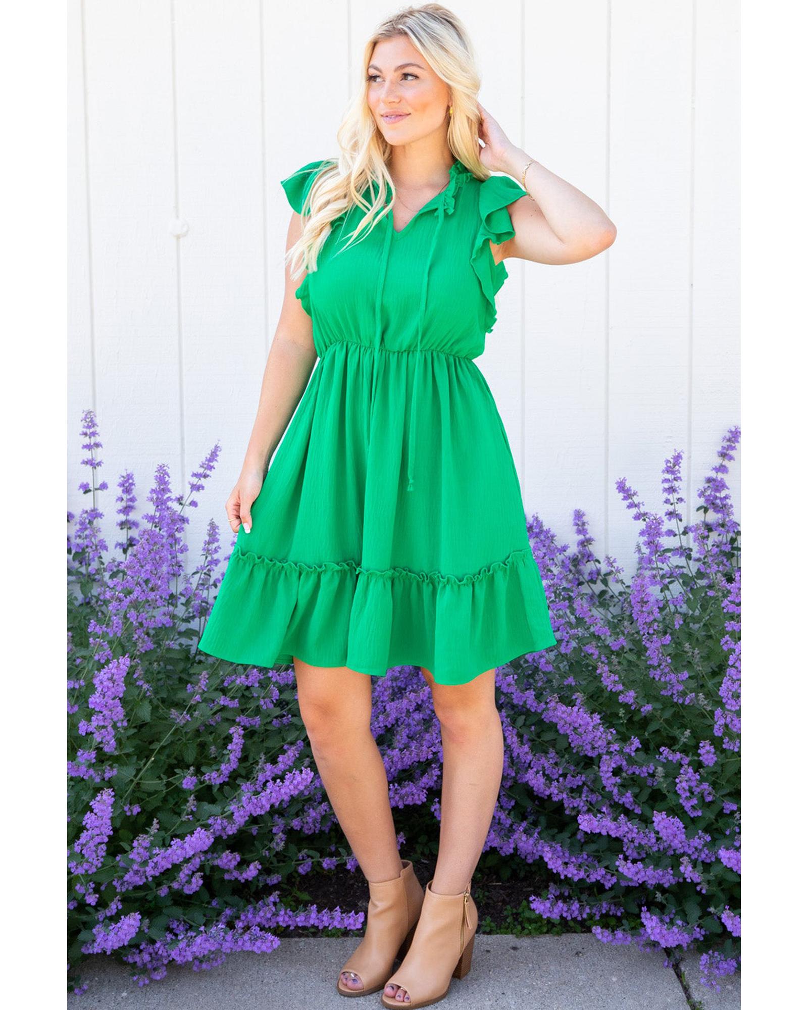 Bright Green Split V Neck Elastic Waist Ruffled Dress – L