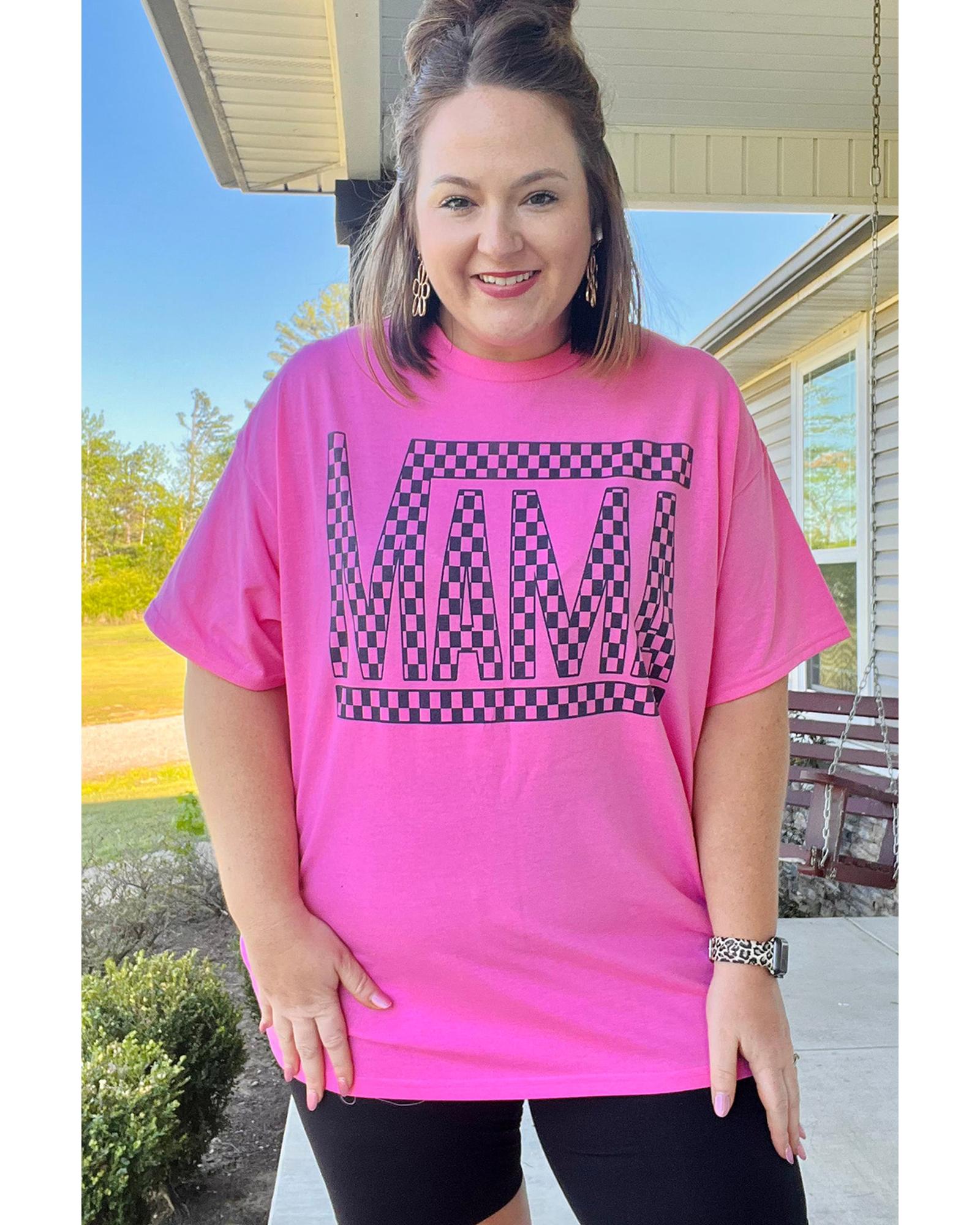Bright Pink Checker MAMA Letter Printed Graphic Plus Size T Shirt - 1X