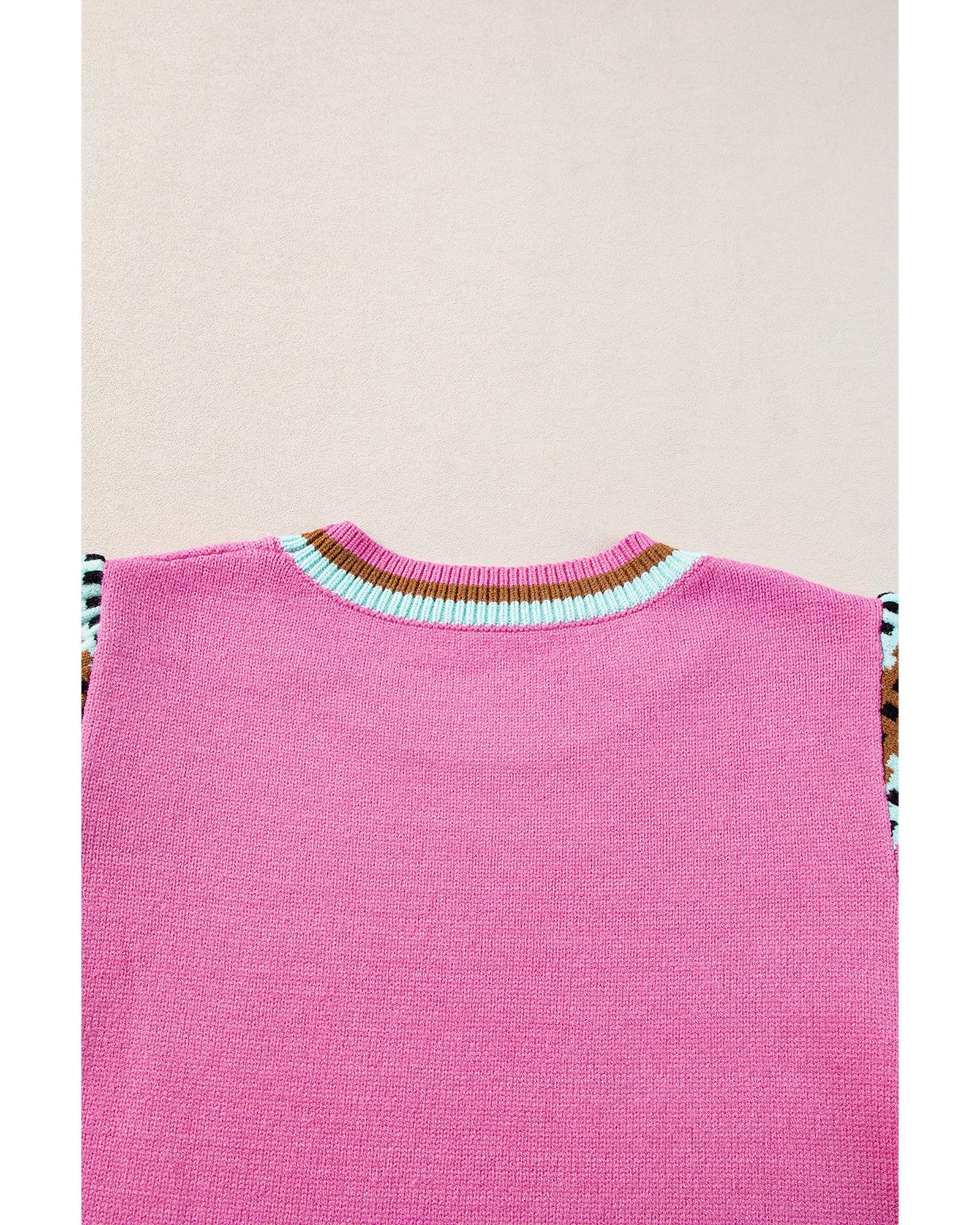 Bright Pink Contrast Printed Cap Sleeves Crewneck Sweater – XL