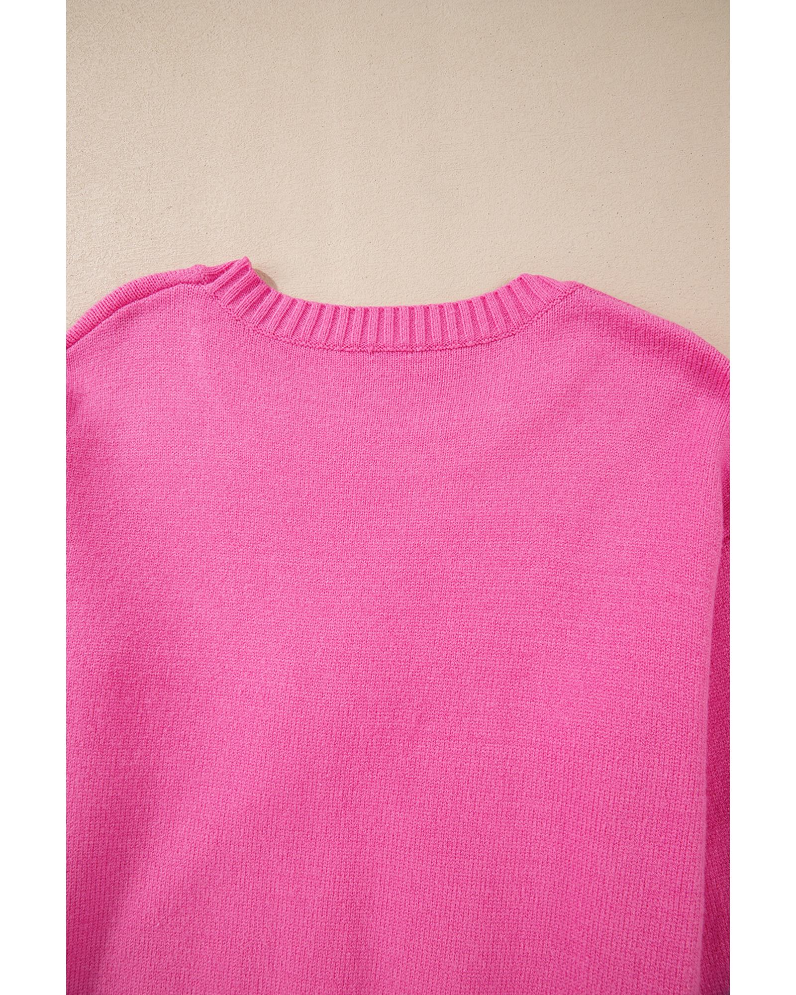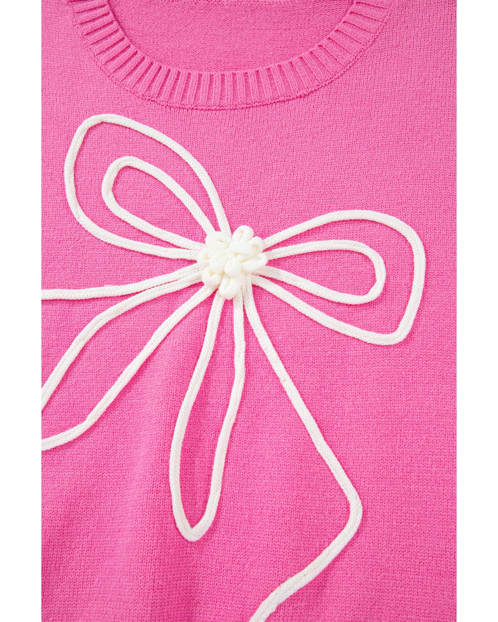 Bright Pink Corded Flower Bow Ribbed Trim Casual Sweater – S