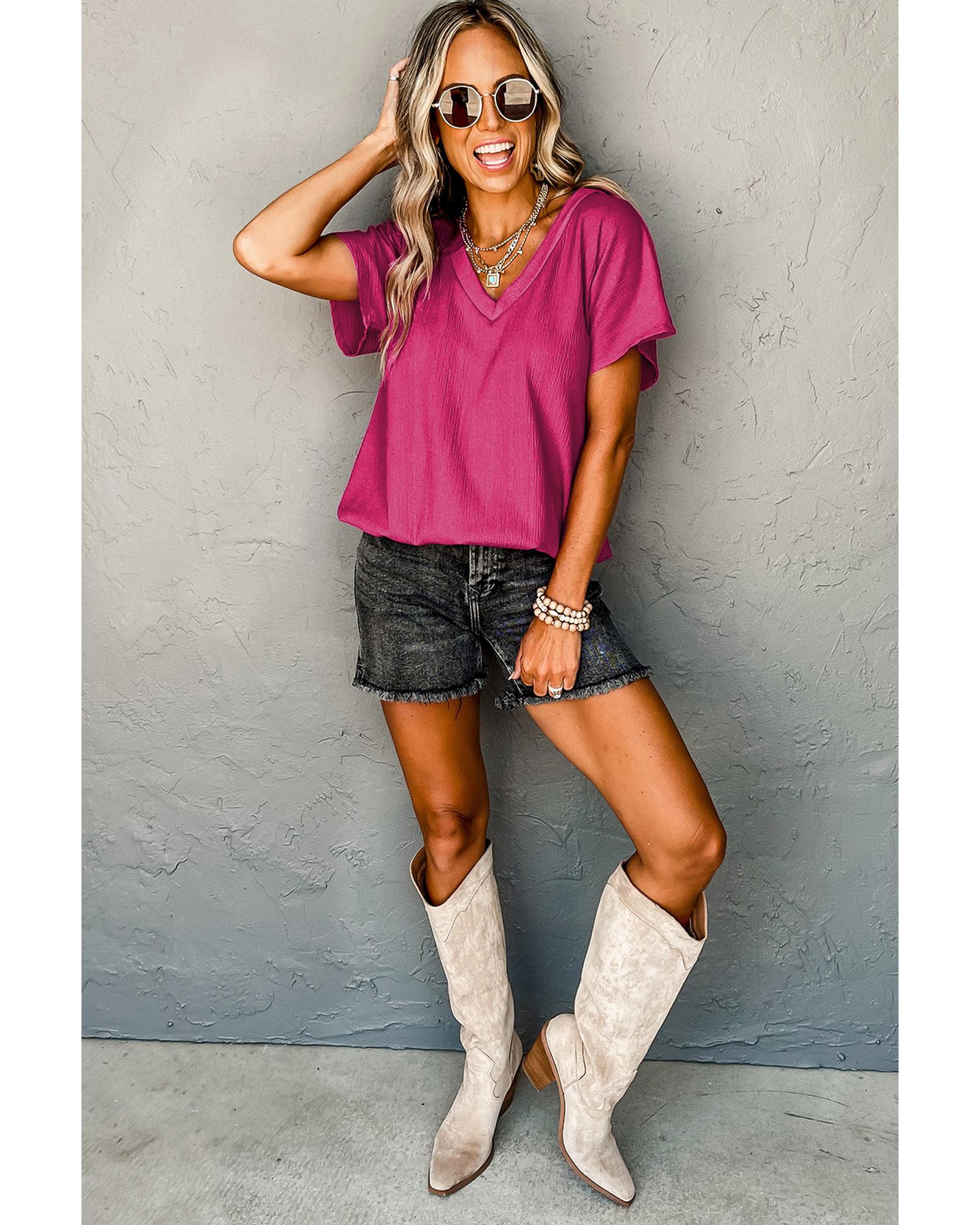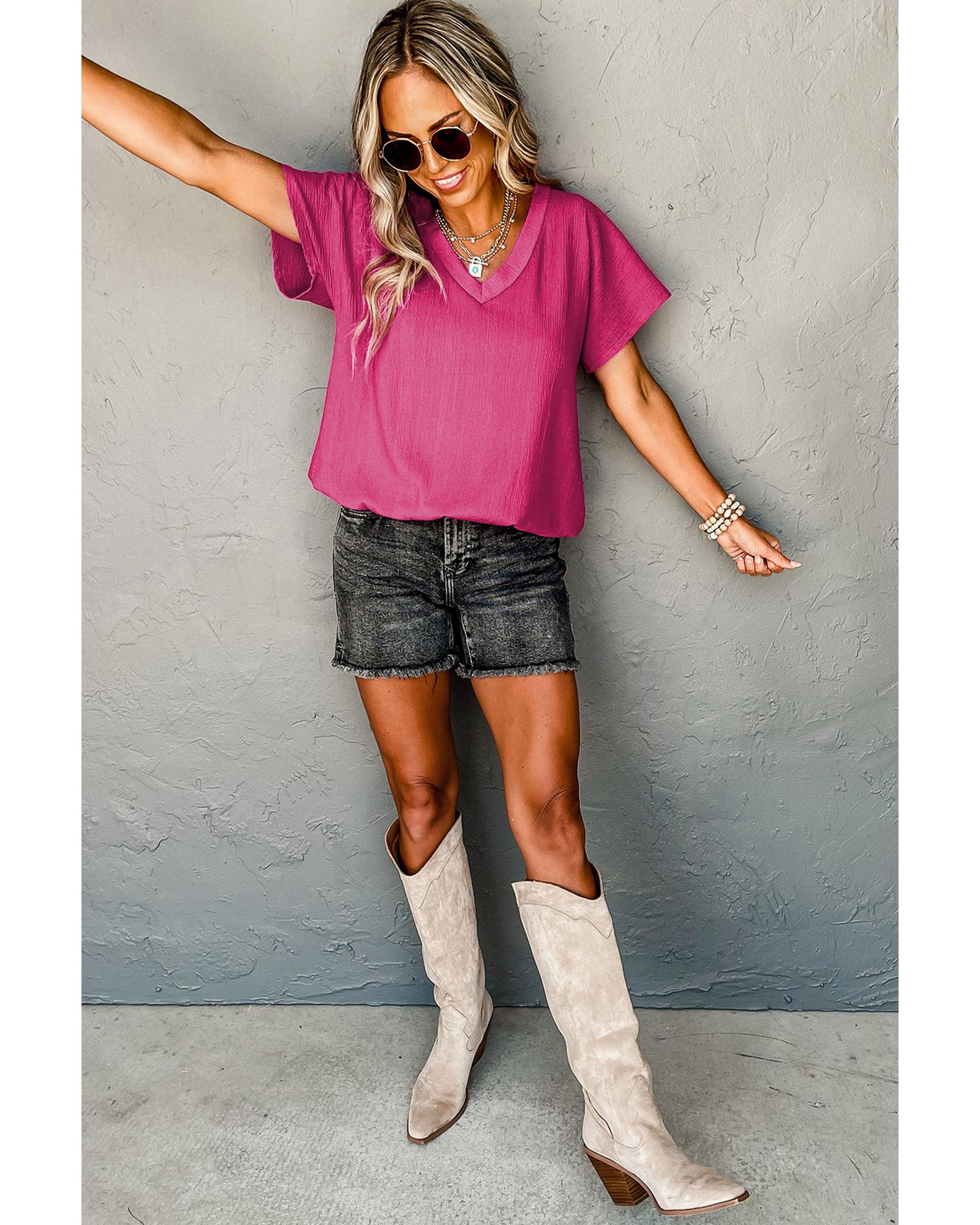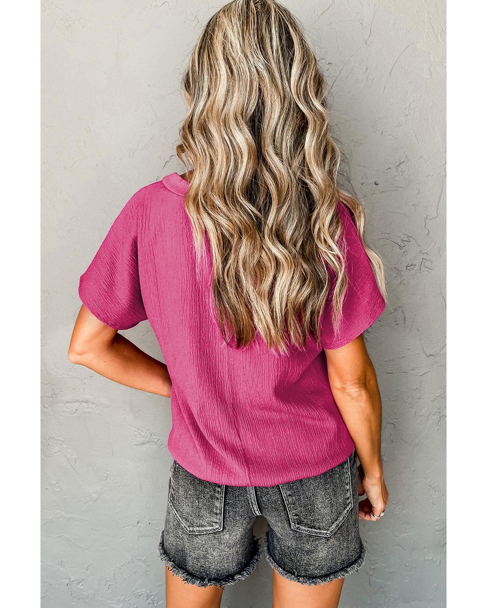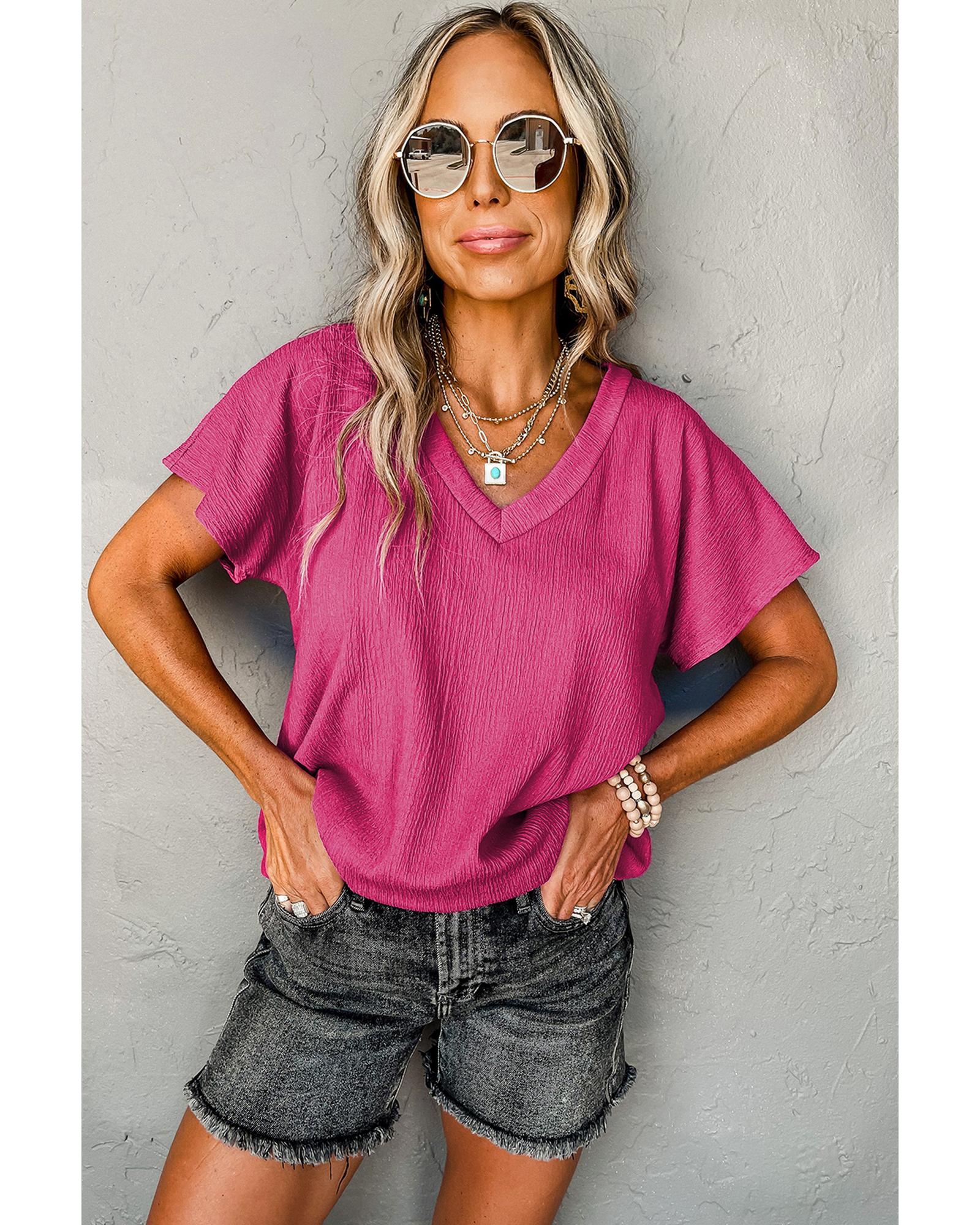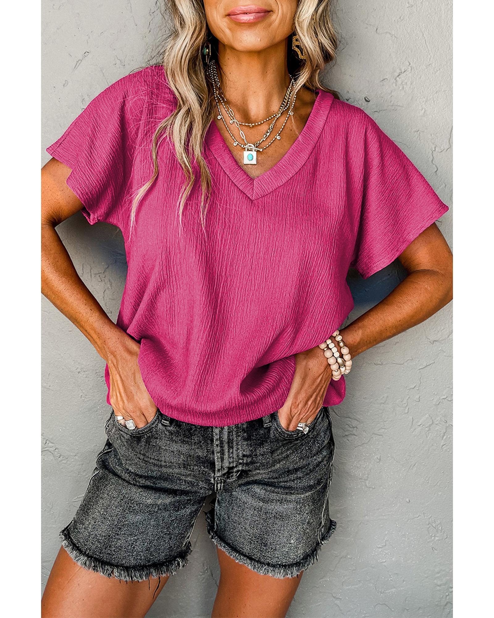 Bright Pink Crinkled V Neck Wide Sleeve T-shirt – S