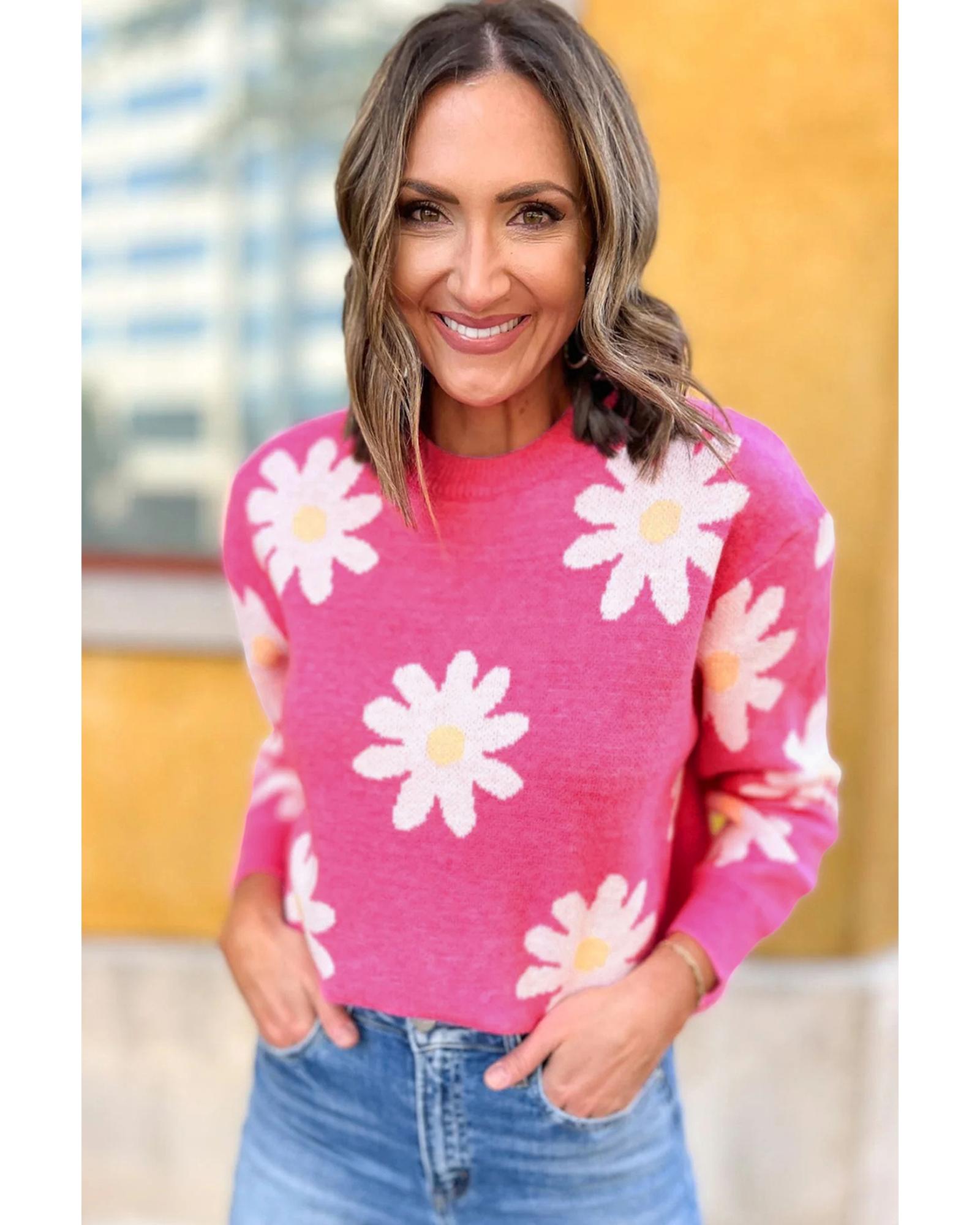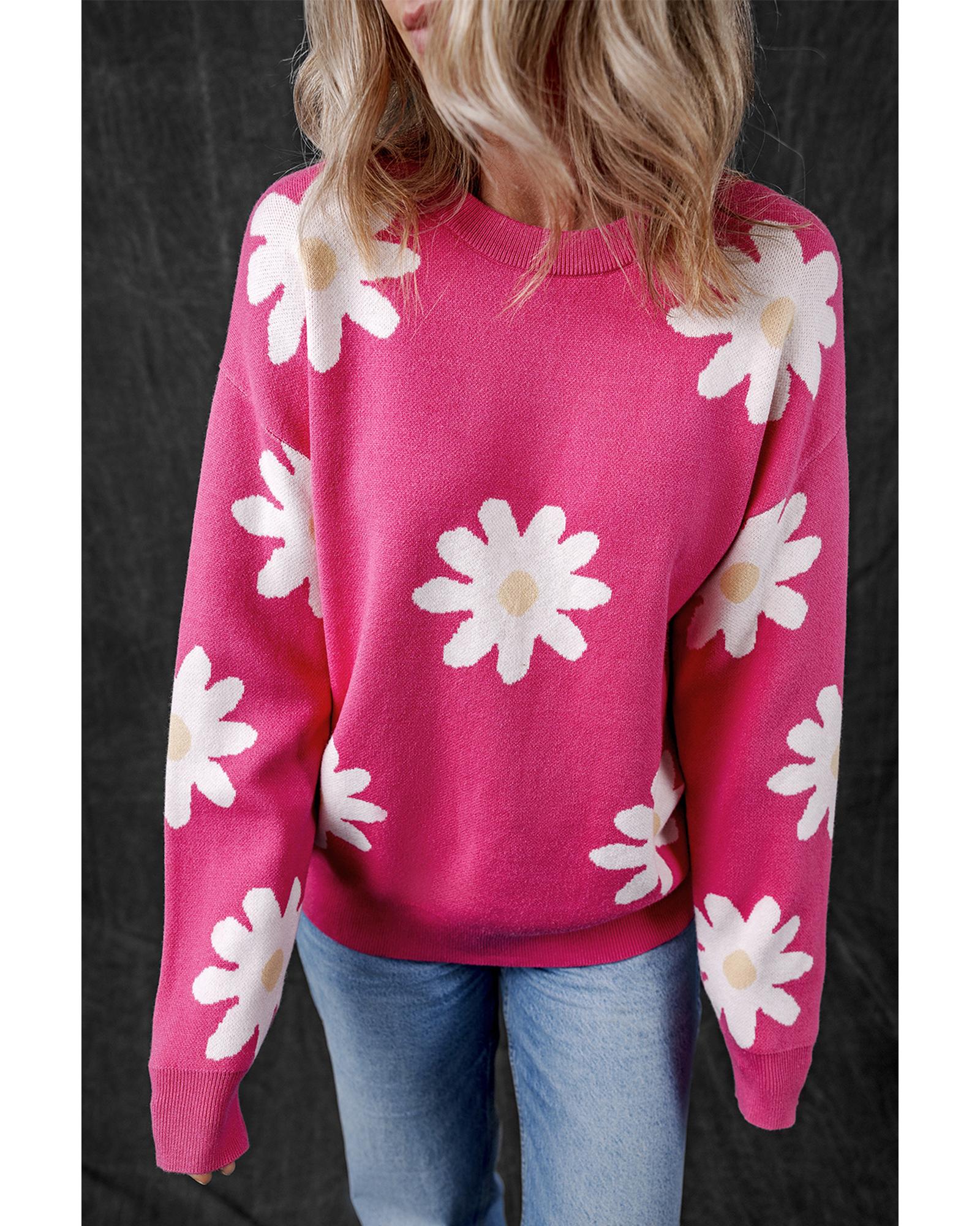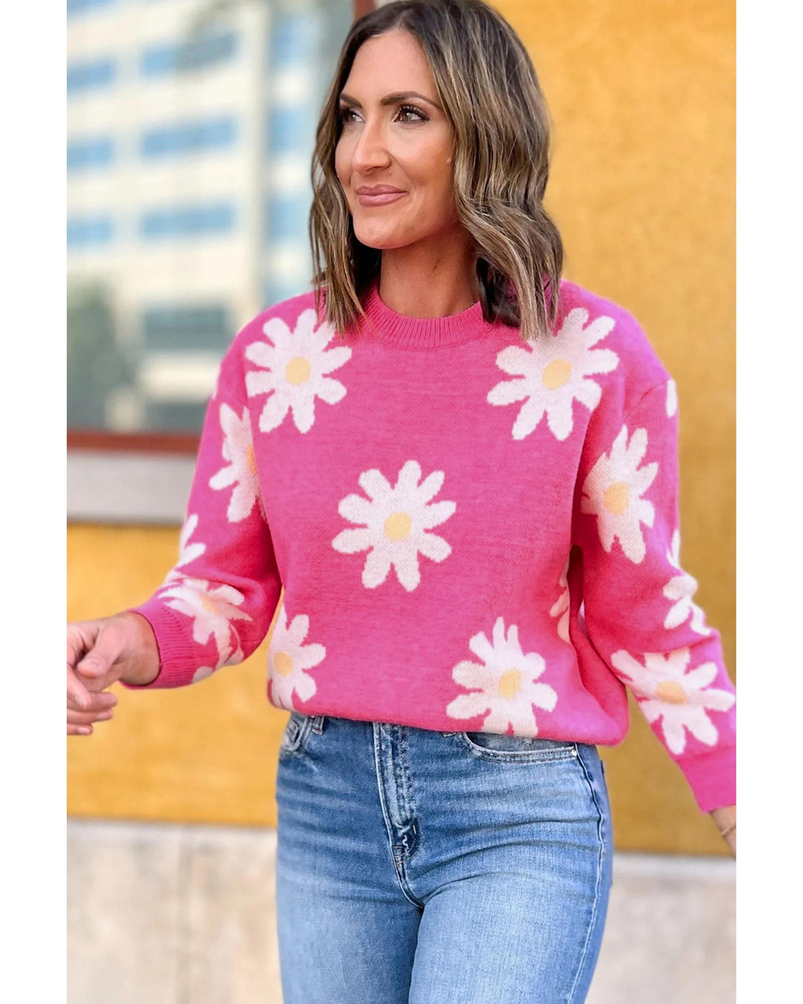 Bright Pink Daisy Flower Crew Neck Long Sleeve Sweater – M