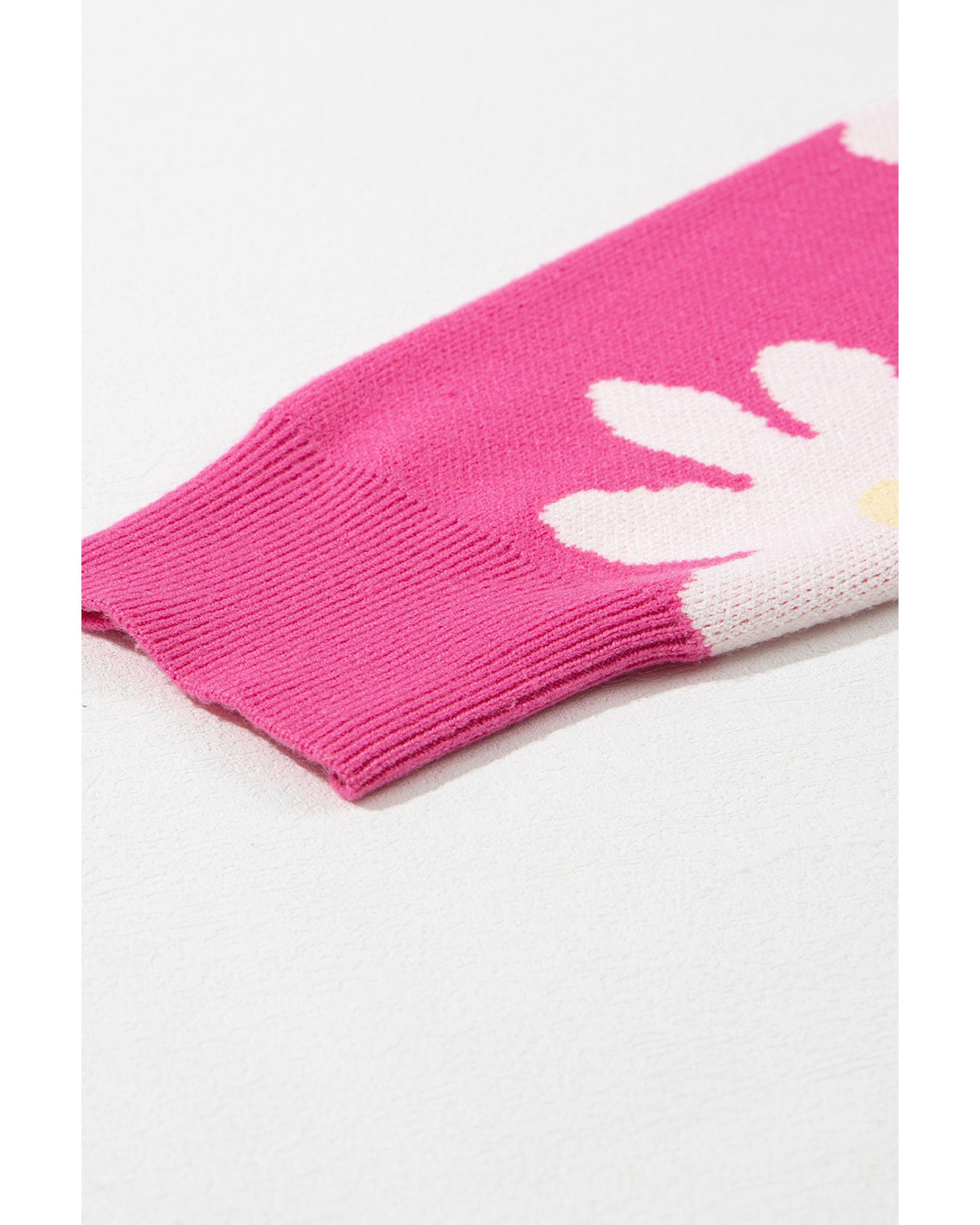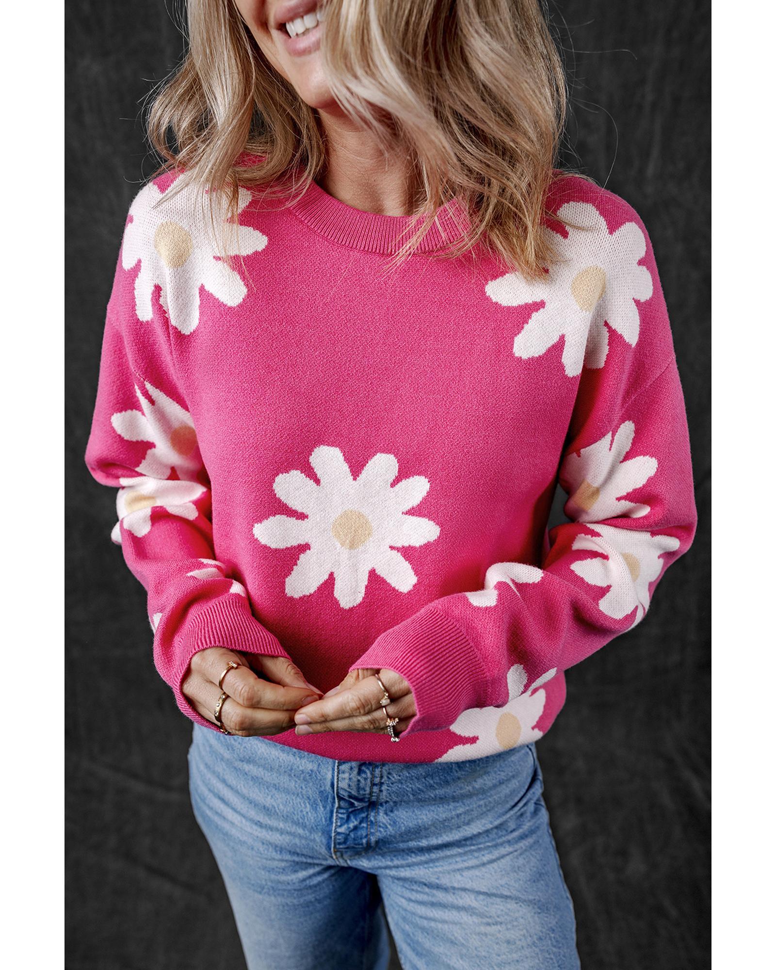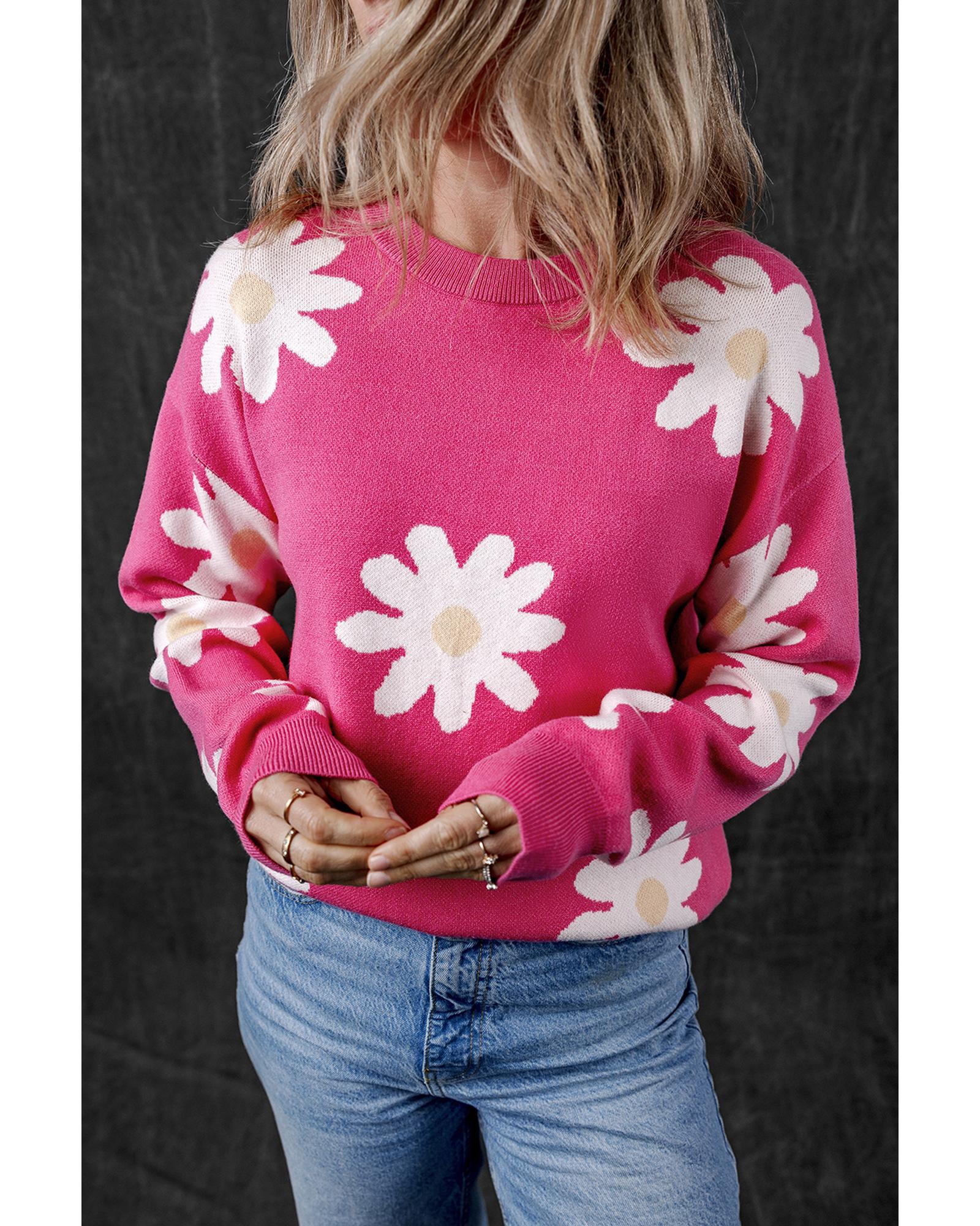 Bright Pink Daisy Flower Crew Neck Long Sleeve Sweater – M