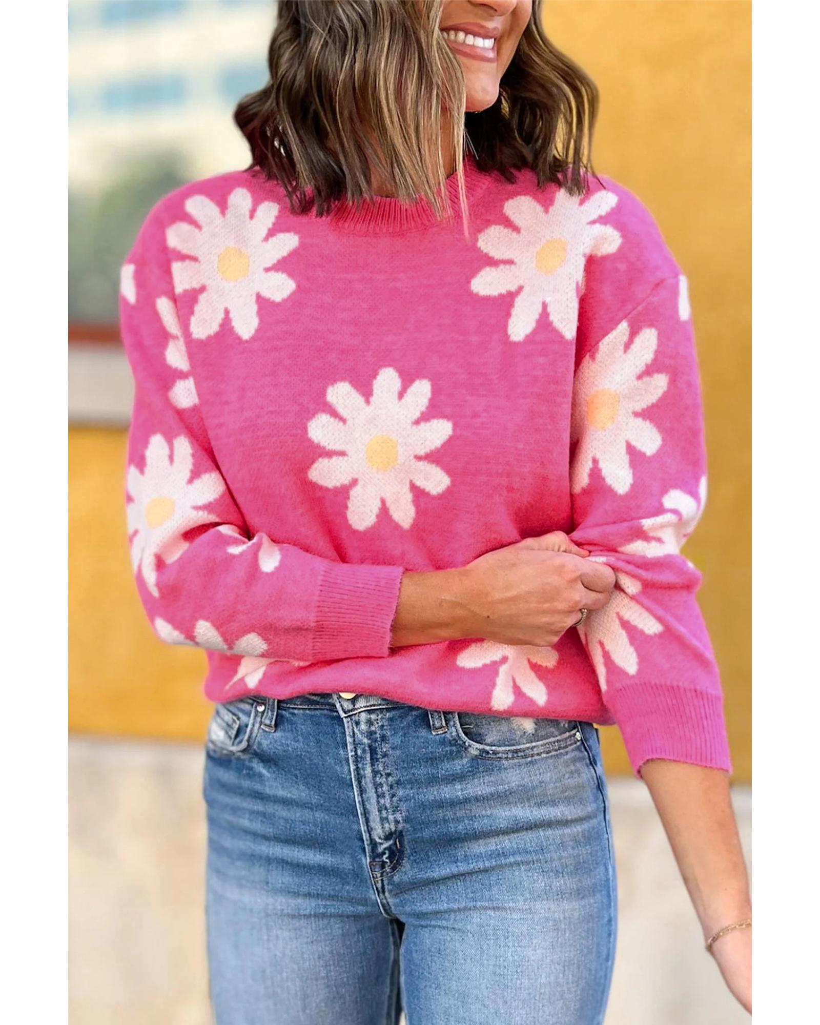 Bright Pink Daisy Flower Crew Neck Long Sleeve Sweater – XL