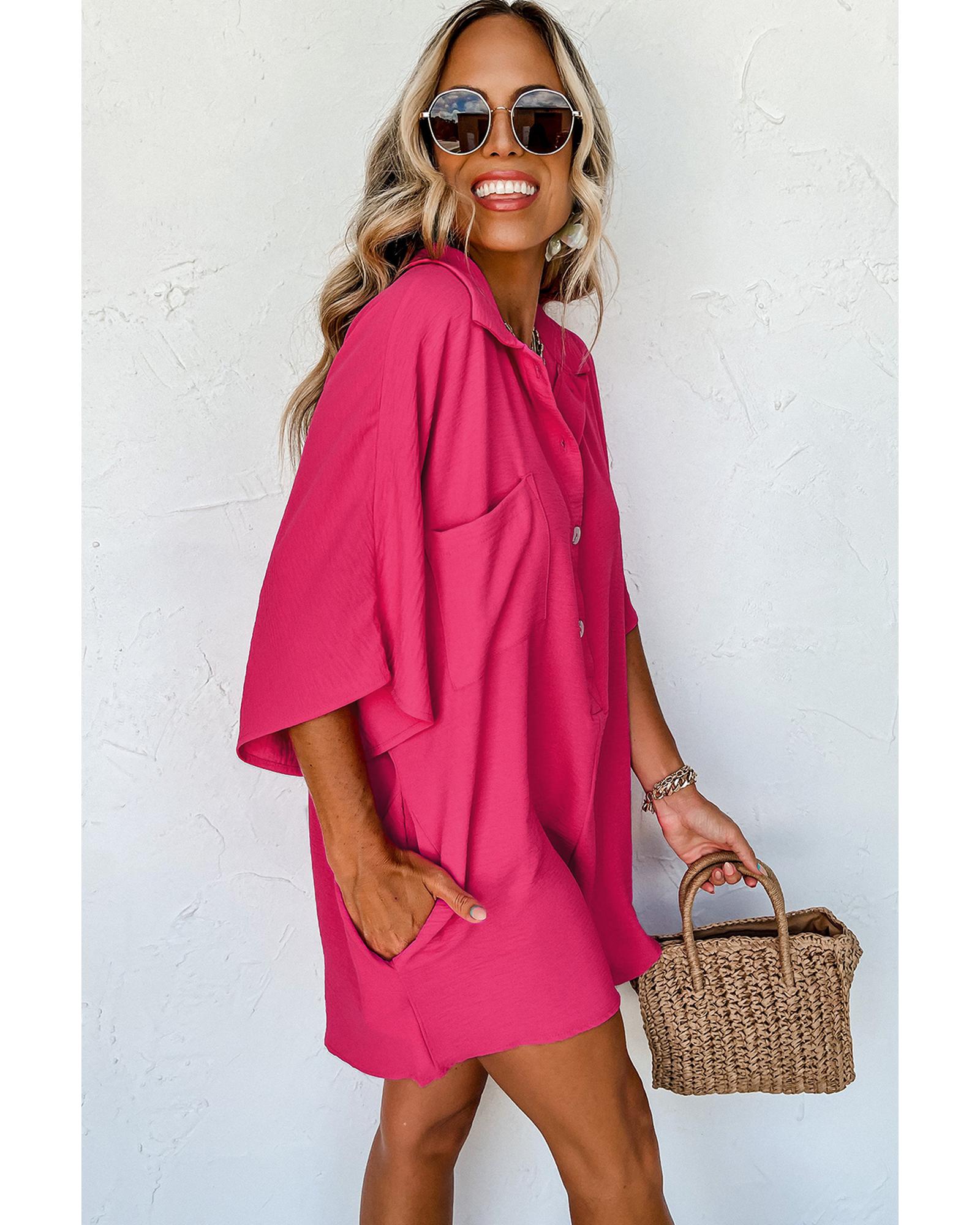 Bright pink half - button collared loose romper Solid color casual wear for women Button closures turn