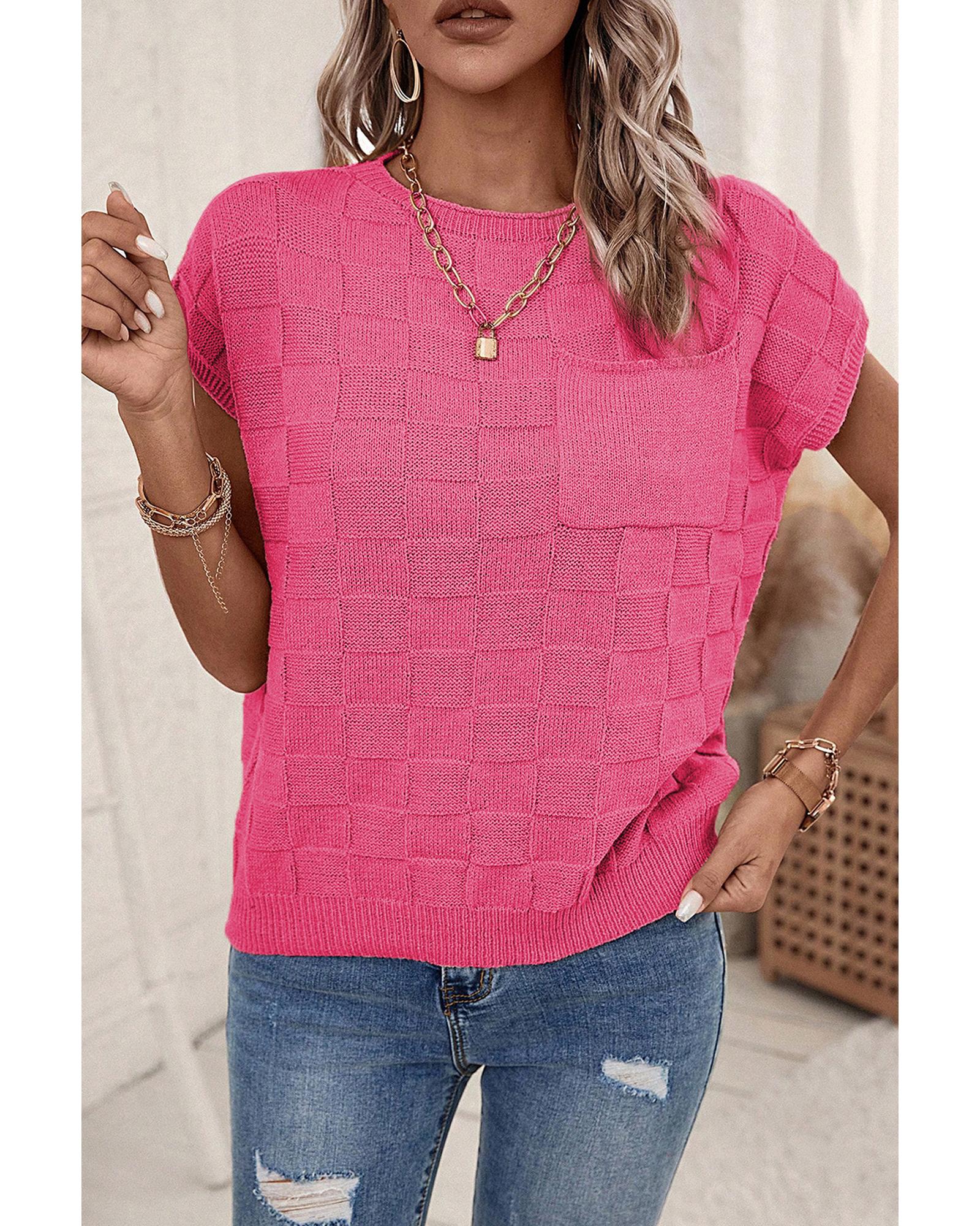 Bright Pink Lattice Textured Knit Short Sleeve Sweater – XL