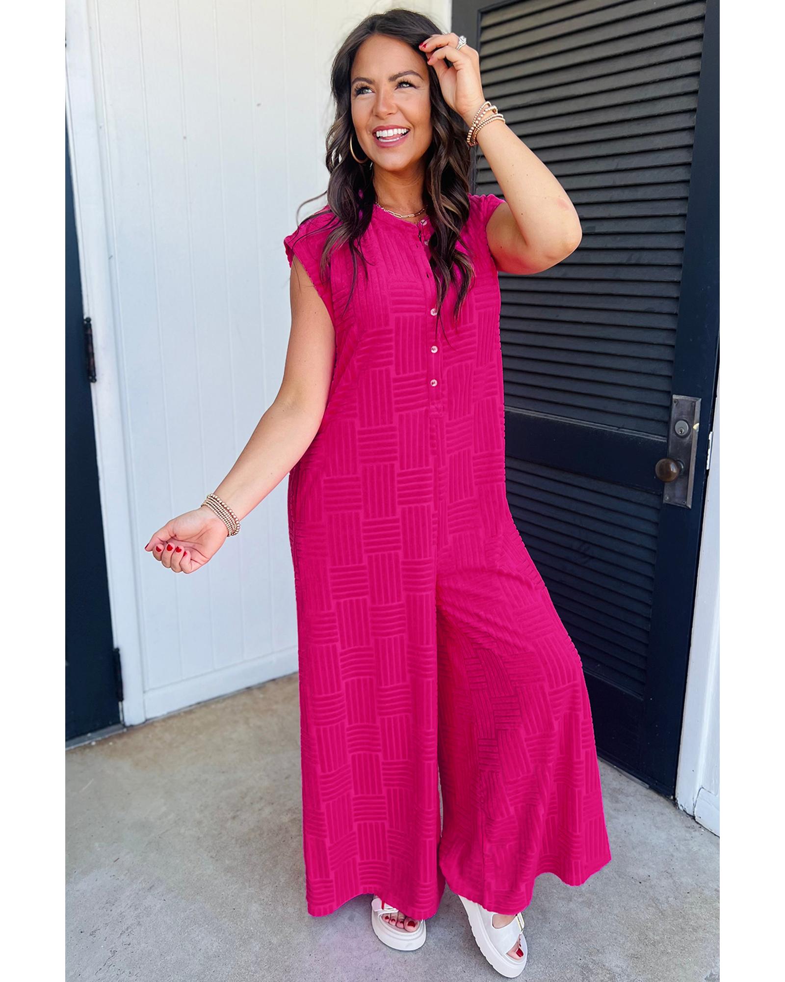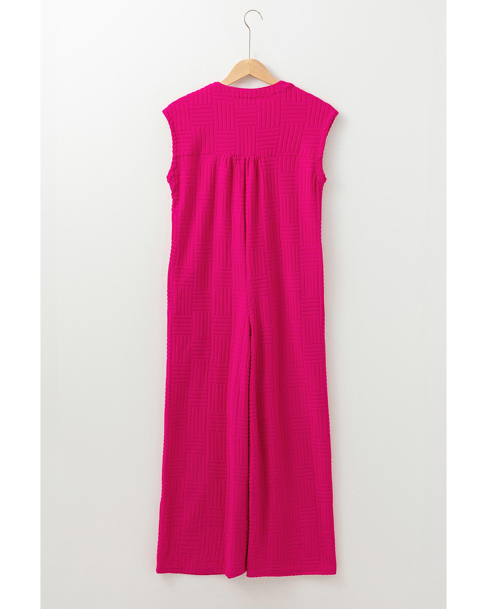 Bright Pink Terry Textured Sleeveless Button Front Wide Leg Jumpsuit – L