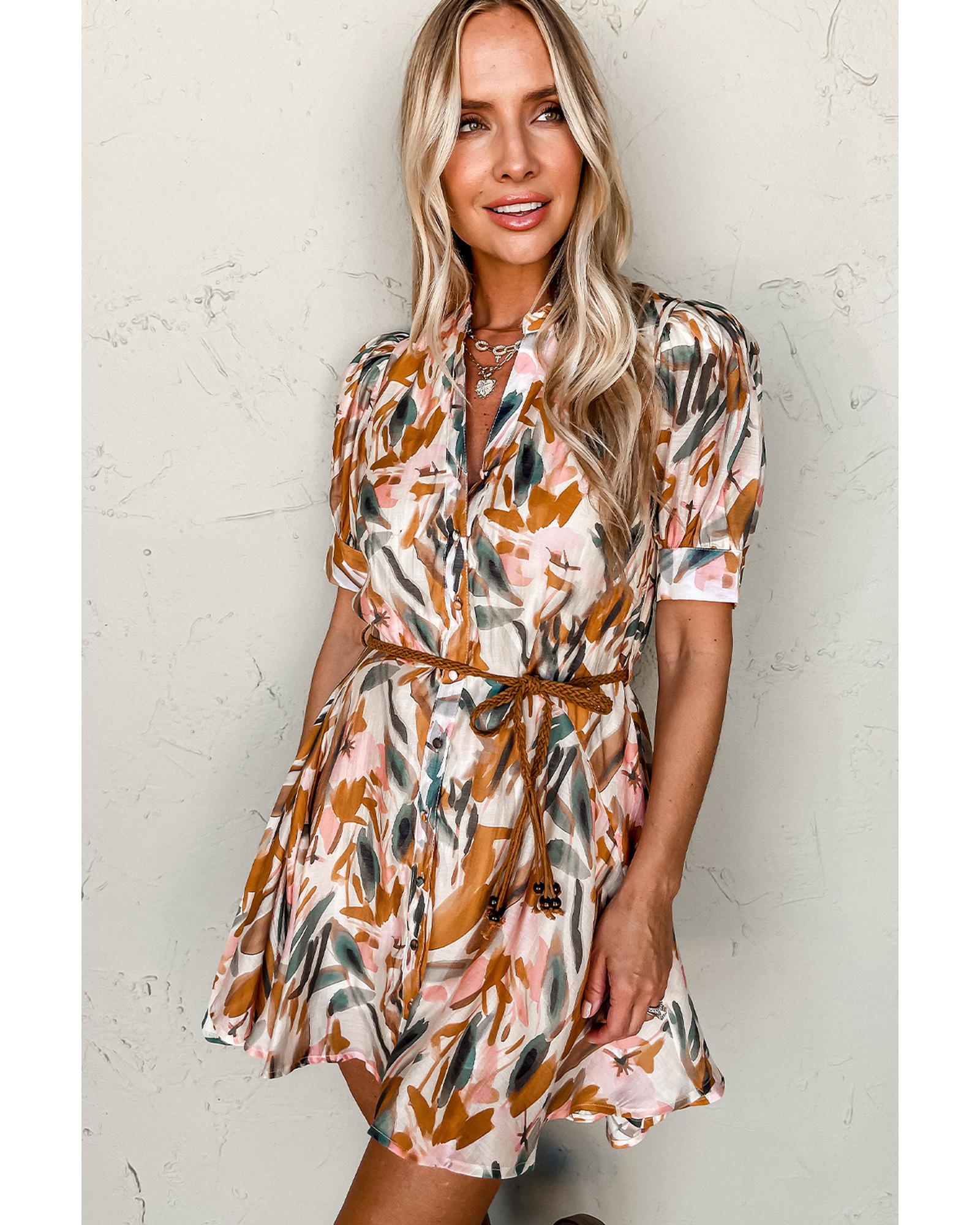 Brown Abstract Printed Puff Sleeve Button Up Braided Belt Mini Dress – M