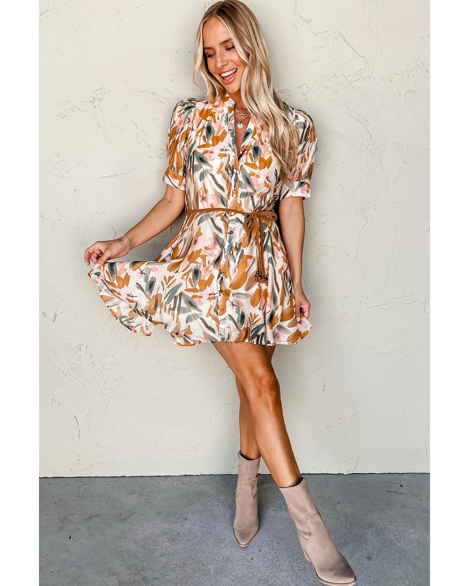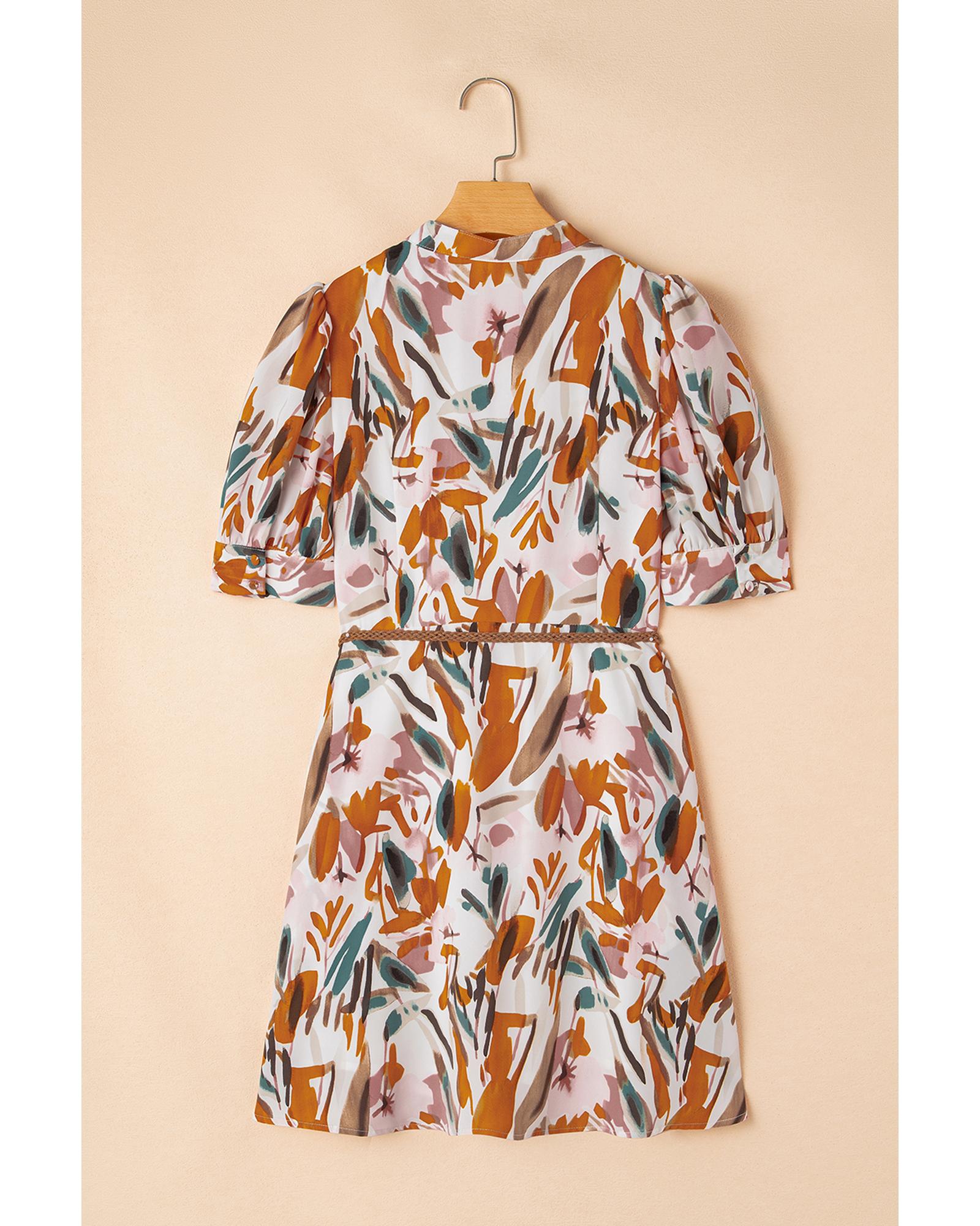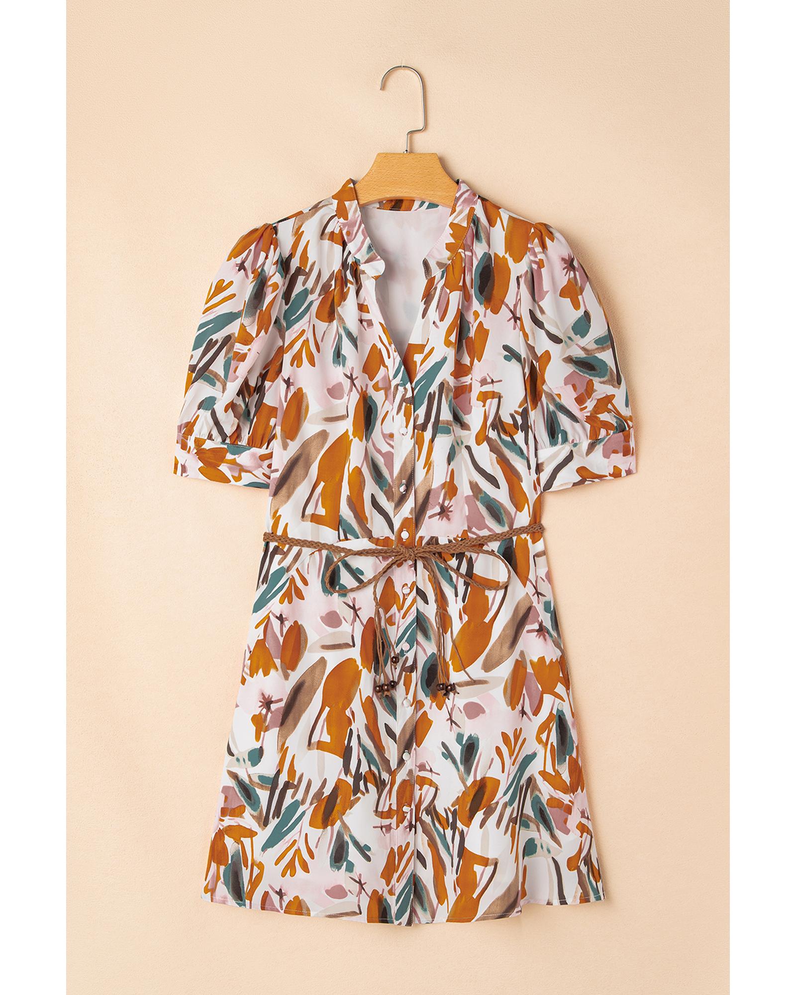 Brown Abstract Printed Puff Sleeve Button Up Braided Belt Mini Dress – XL