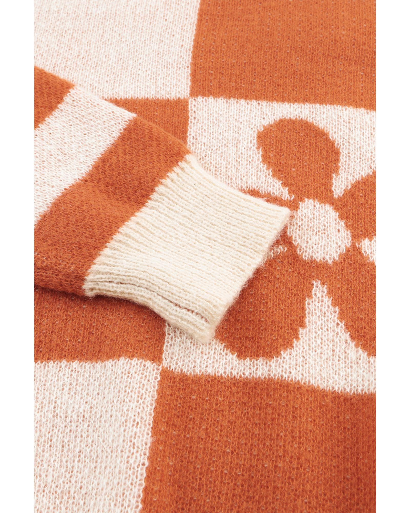Brown Checkered Floral Print Striped Sleeve Sweater – M