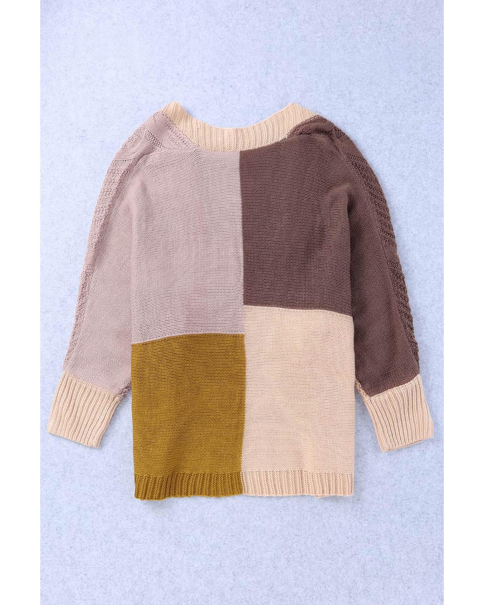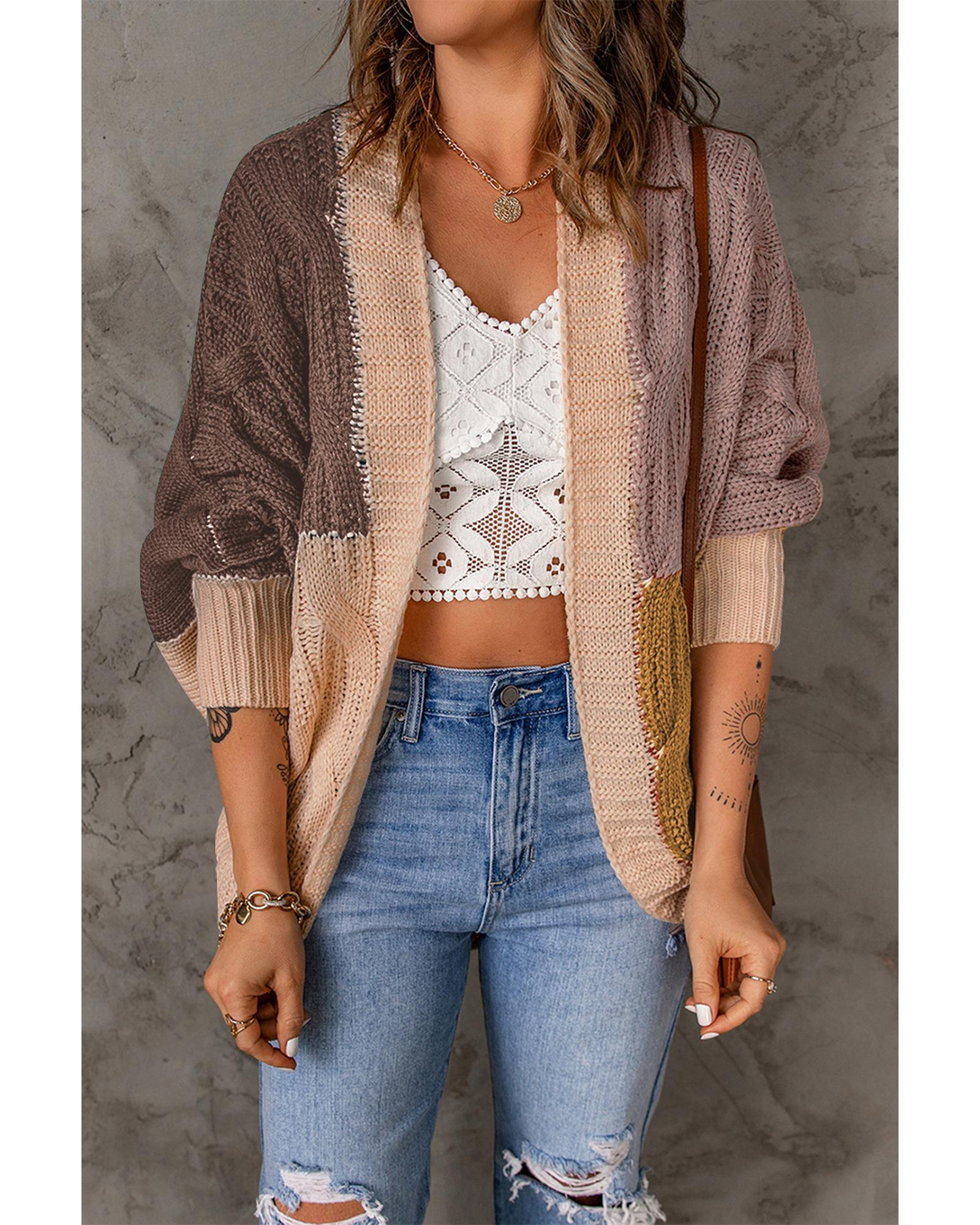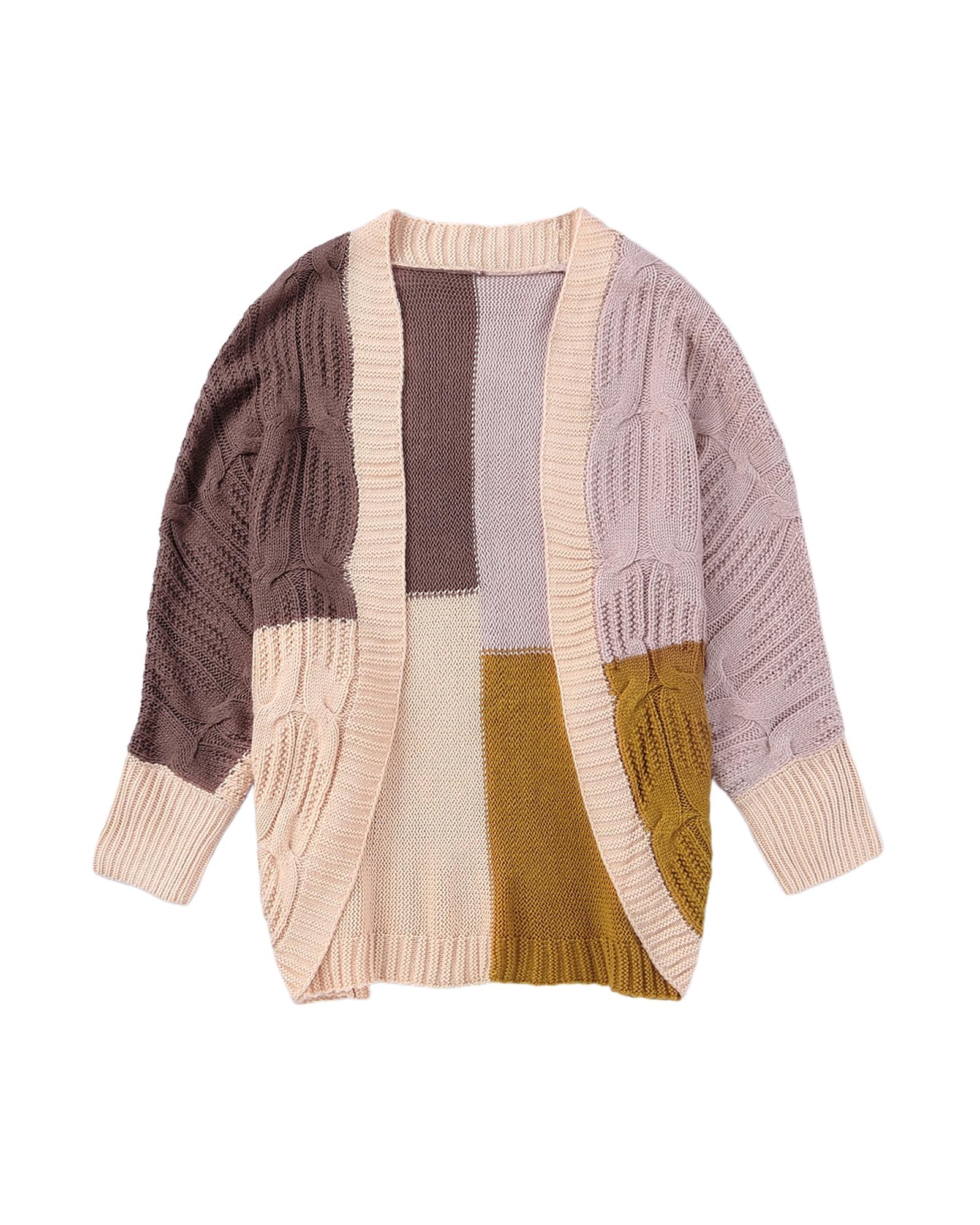 - Brown color block loose open front knitted cardigan