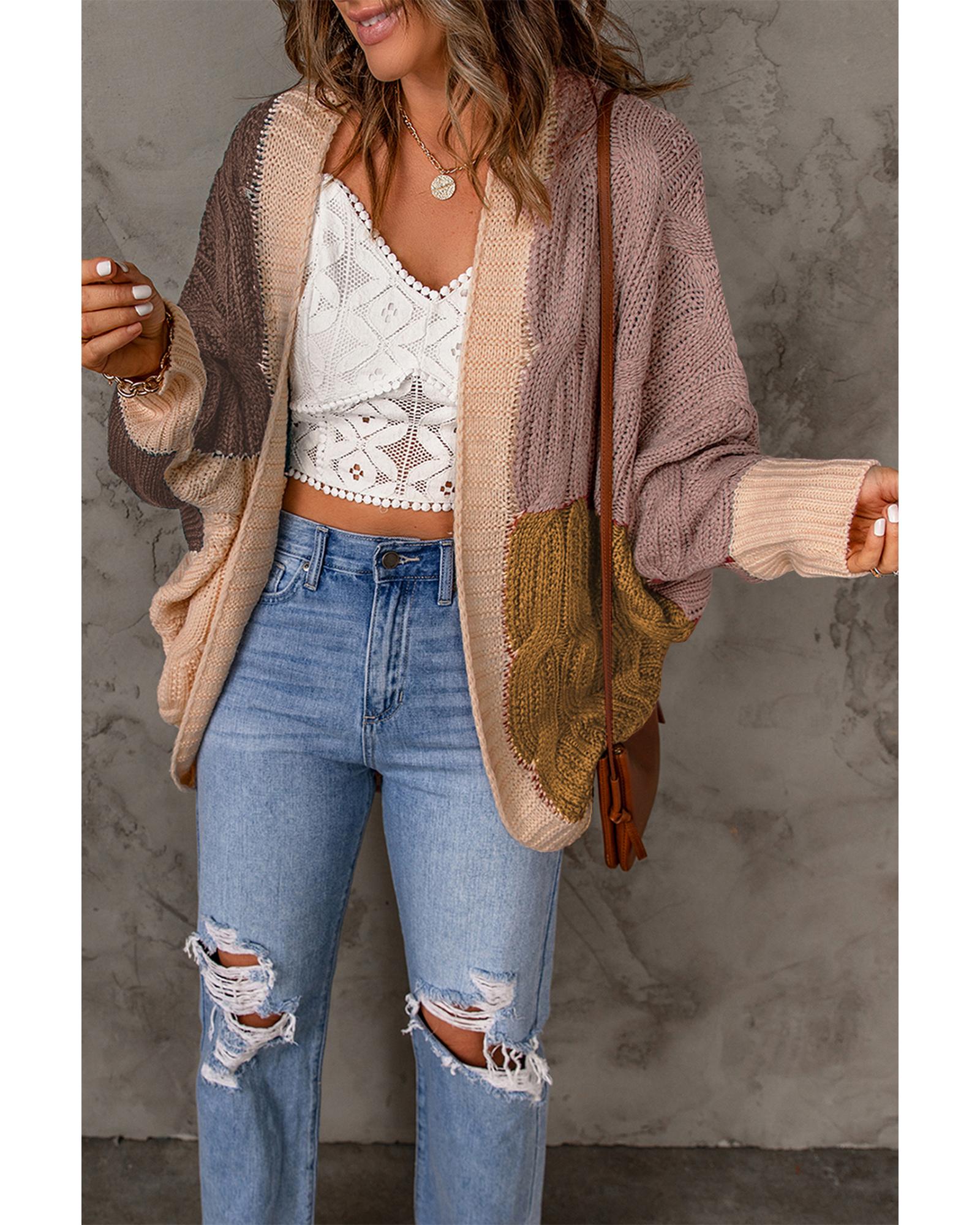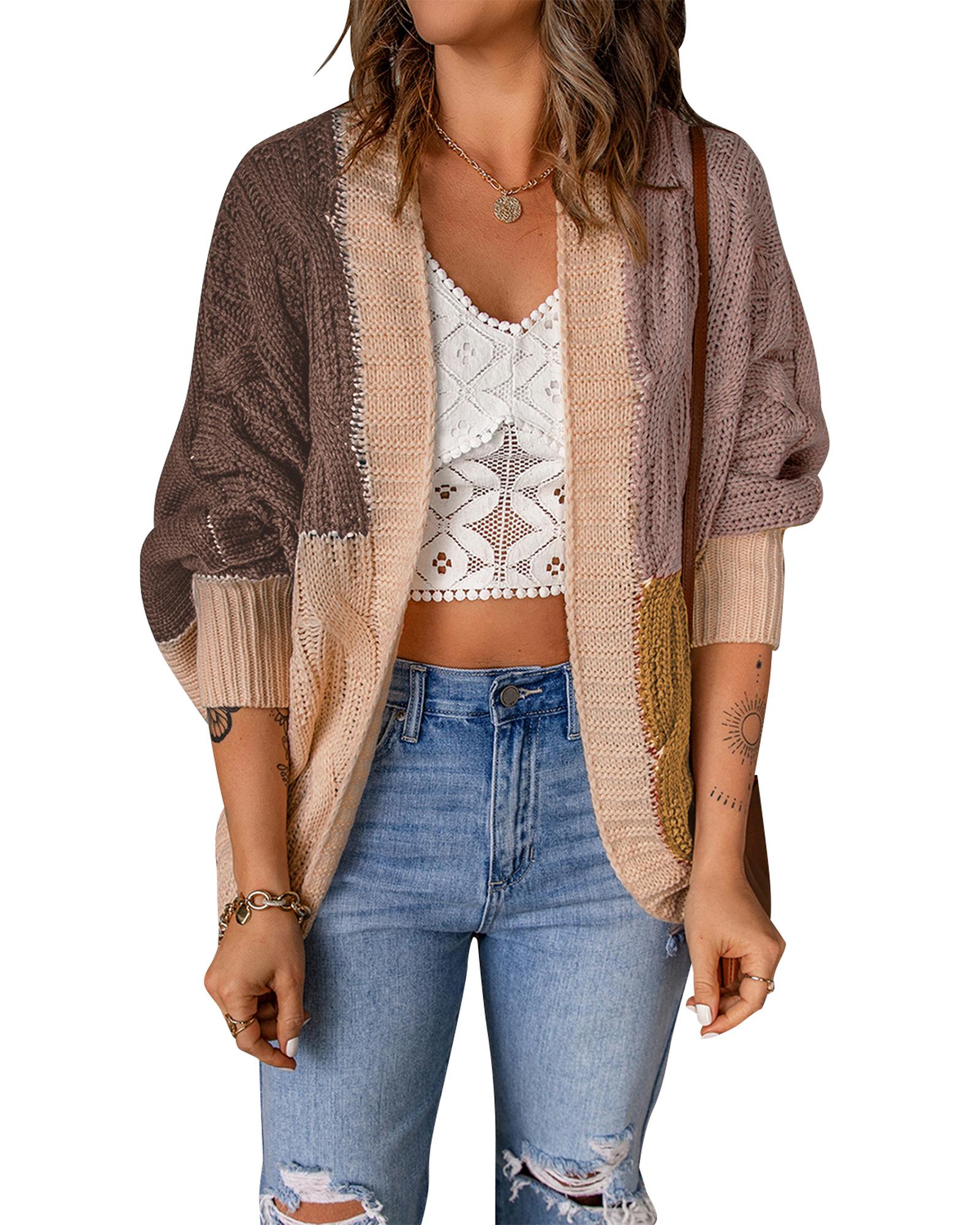 - Brown color block loose open front knitted cardigan