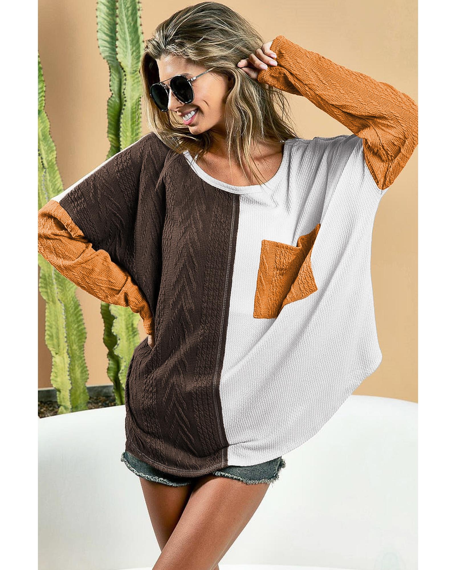 Brown Color Block Patchwork Chest Pocket Long Sleeve Top – S