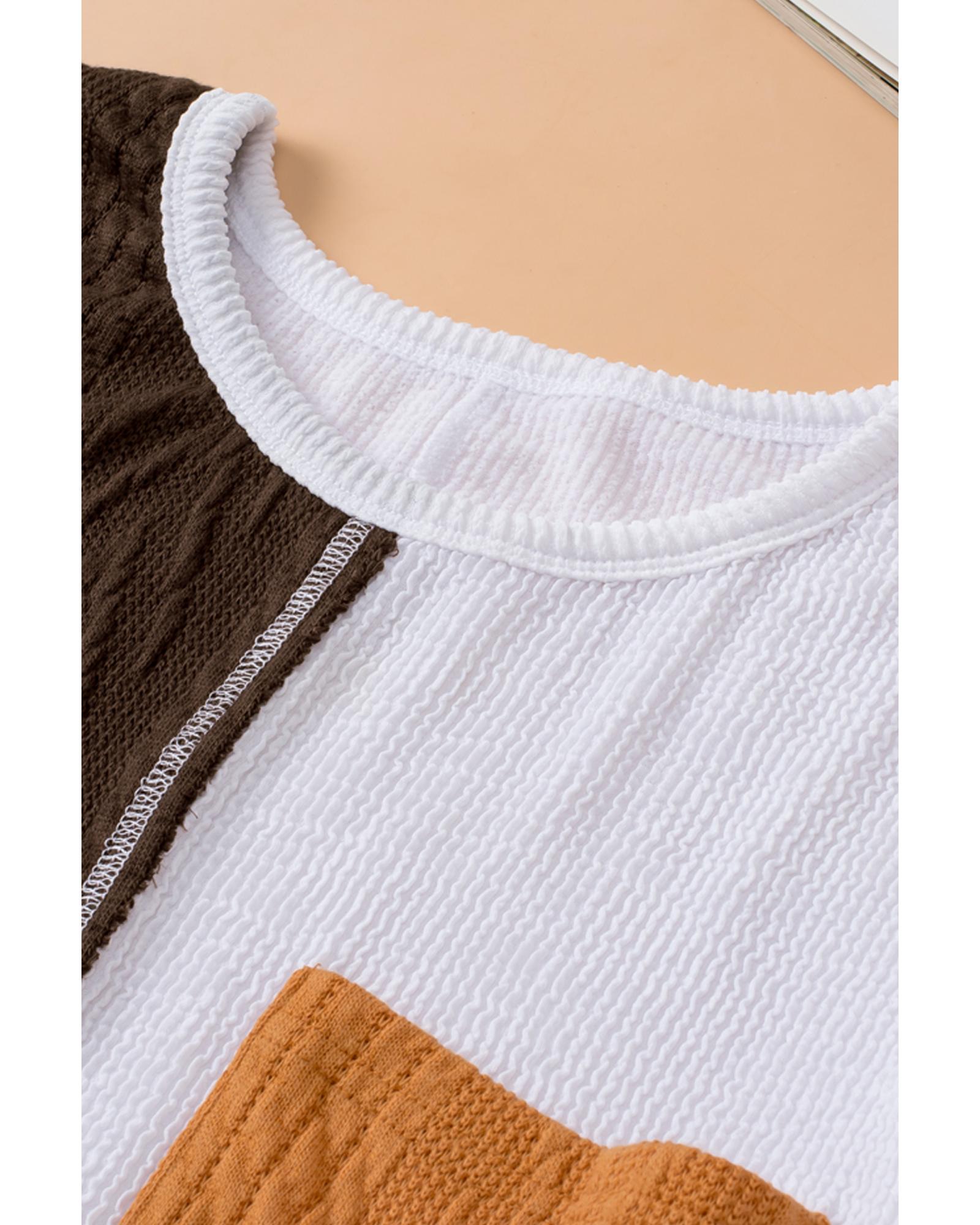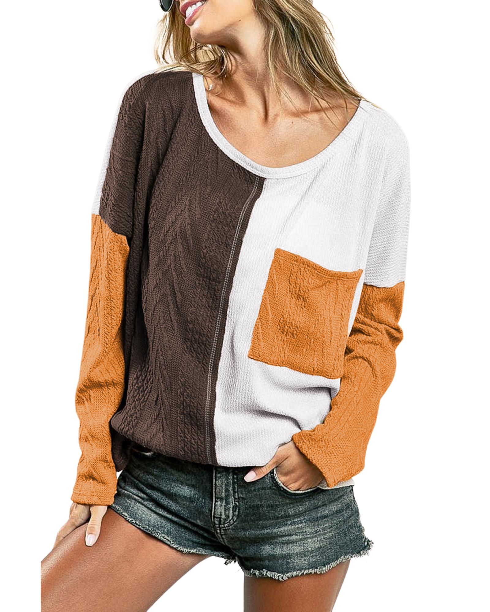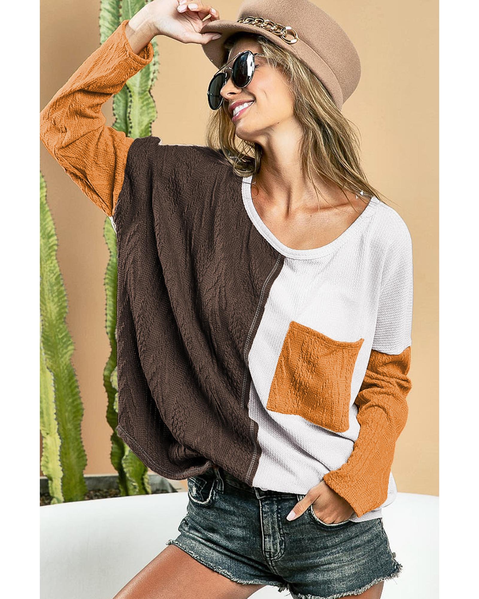 Brown Color Block Patchwork Chest Pocket Long Sleeve Top – XL