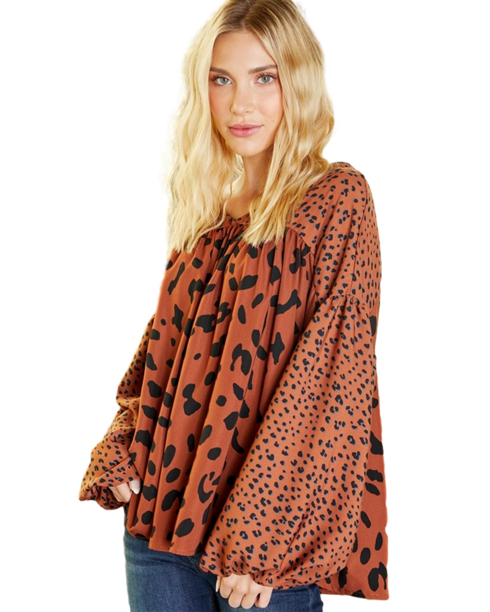 • Brown Contrast Leopard Print Bubble Sleeve Blouse