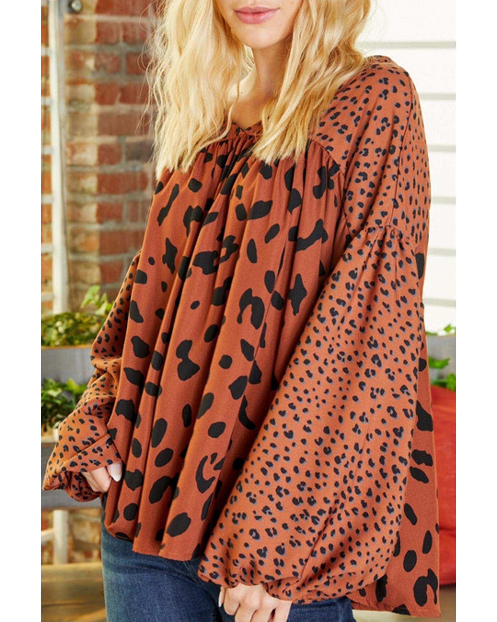 - Brown Contrast Leopard Print Bubble Sleeve Blouse