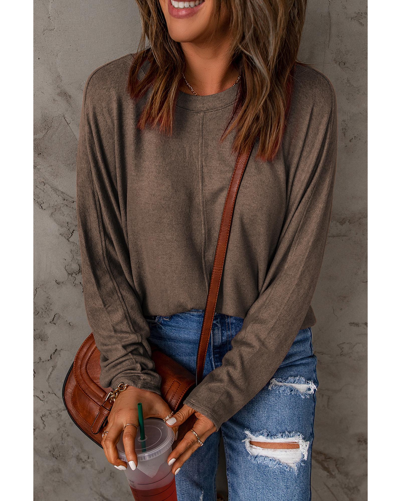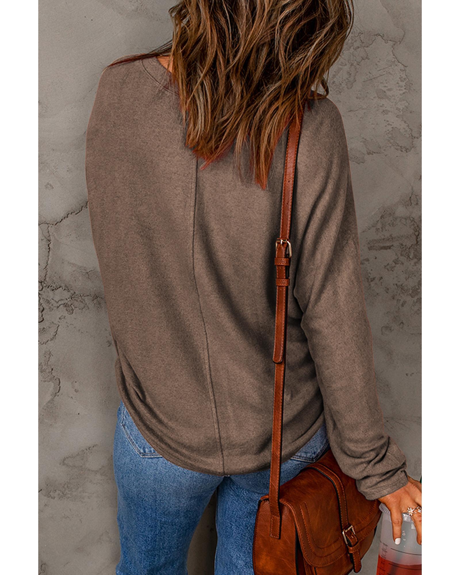 Brown Fiery Solid Color Patchwork Long Sleeve Top – L