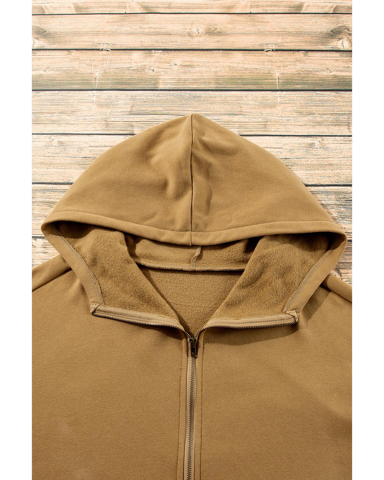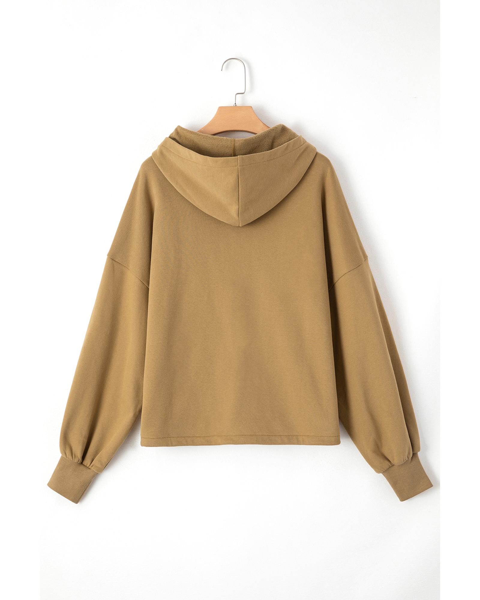 Brown Fleece Lined Half Zipper Kangaroo Pockets Loose Hoodie – S