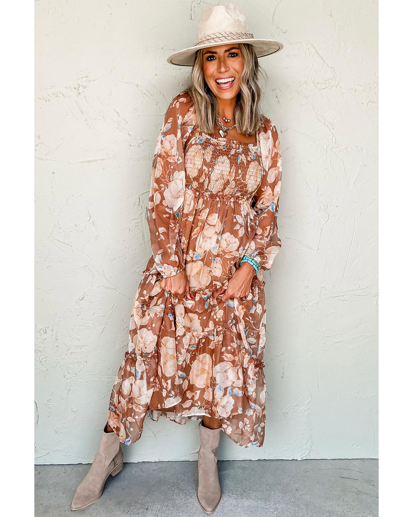- Brown Floral Print Shirred Square Neck High Waist Maxi Dress