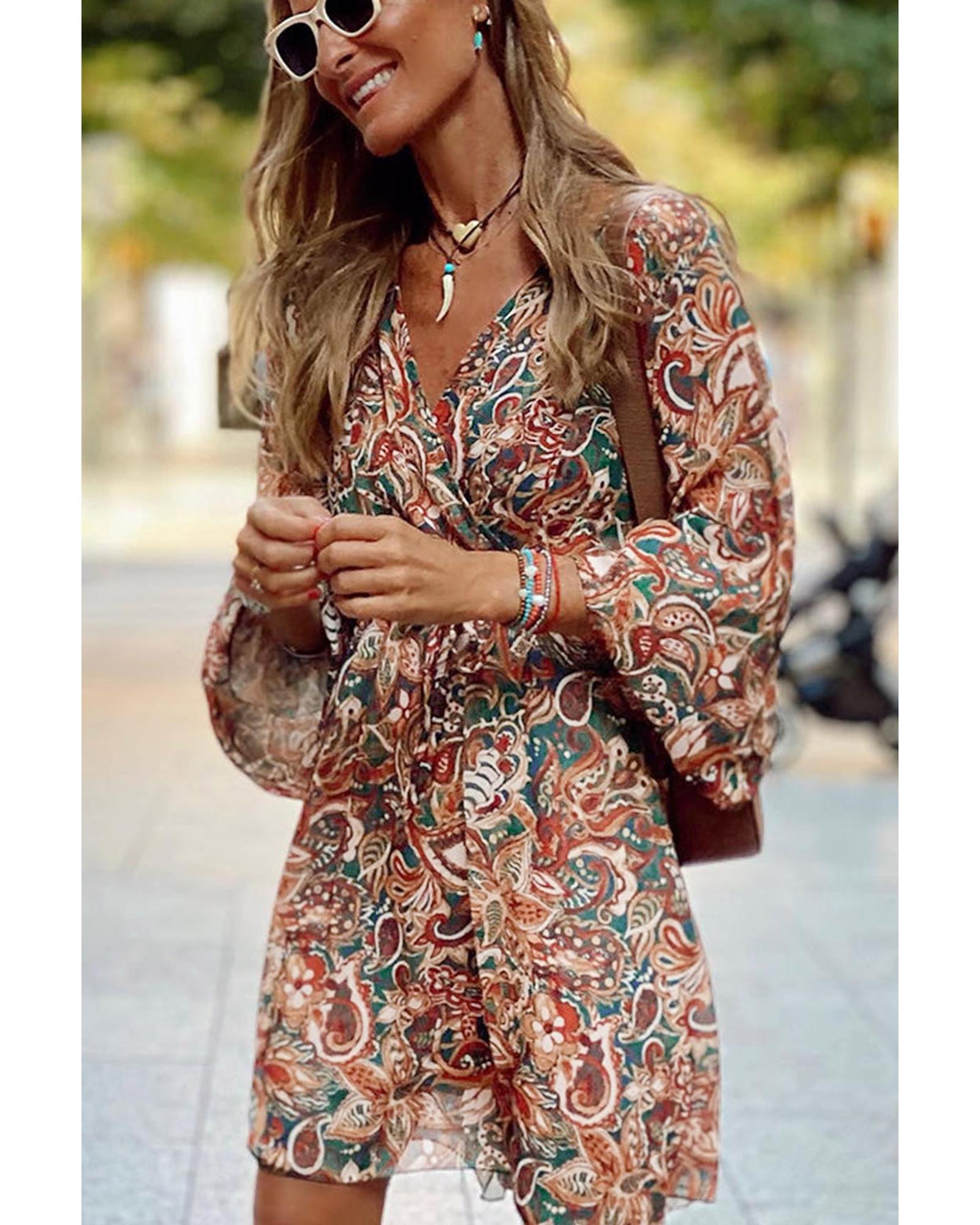 Brown Geometric Print Long Sleeve Surplice Flowy Dress – M