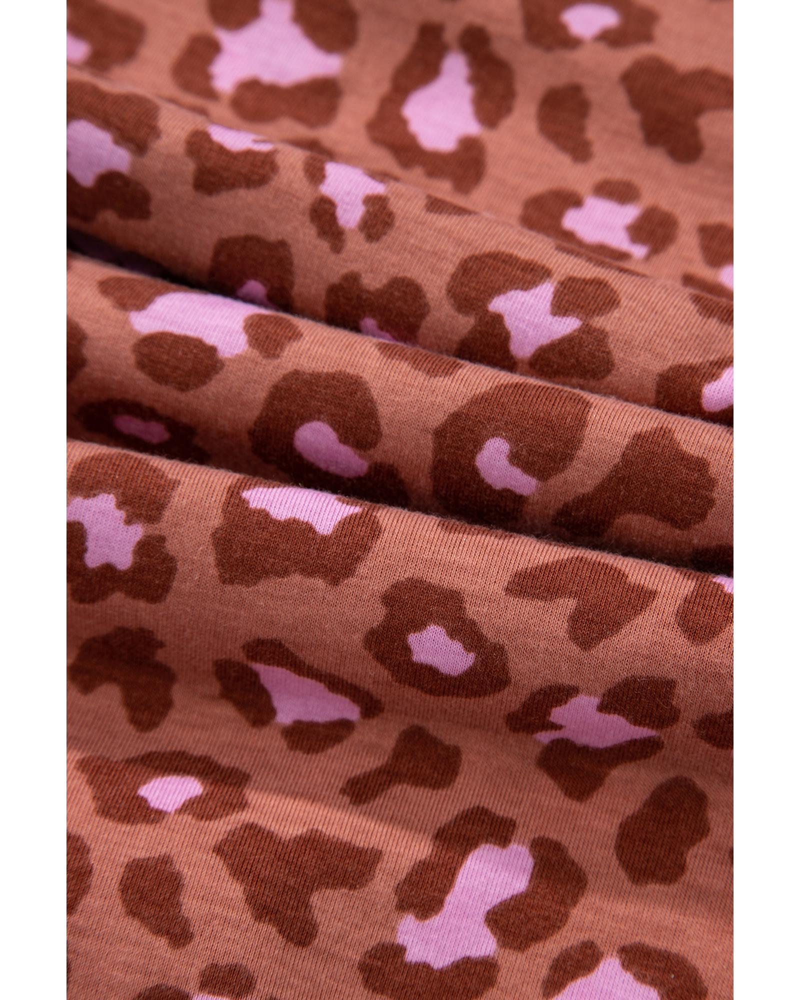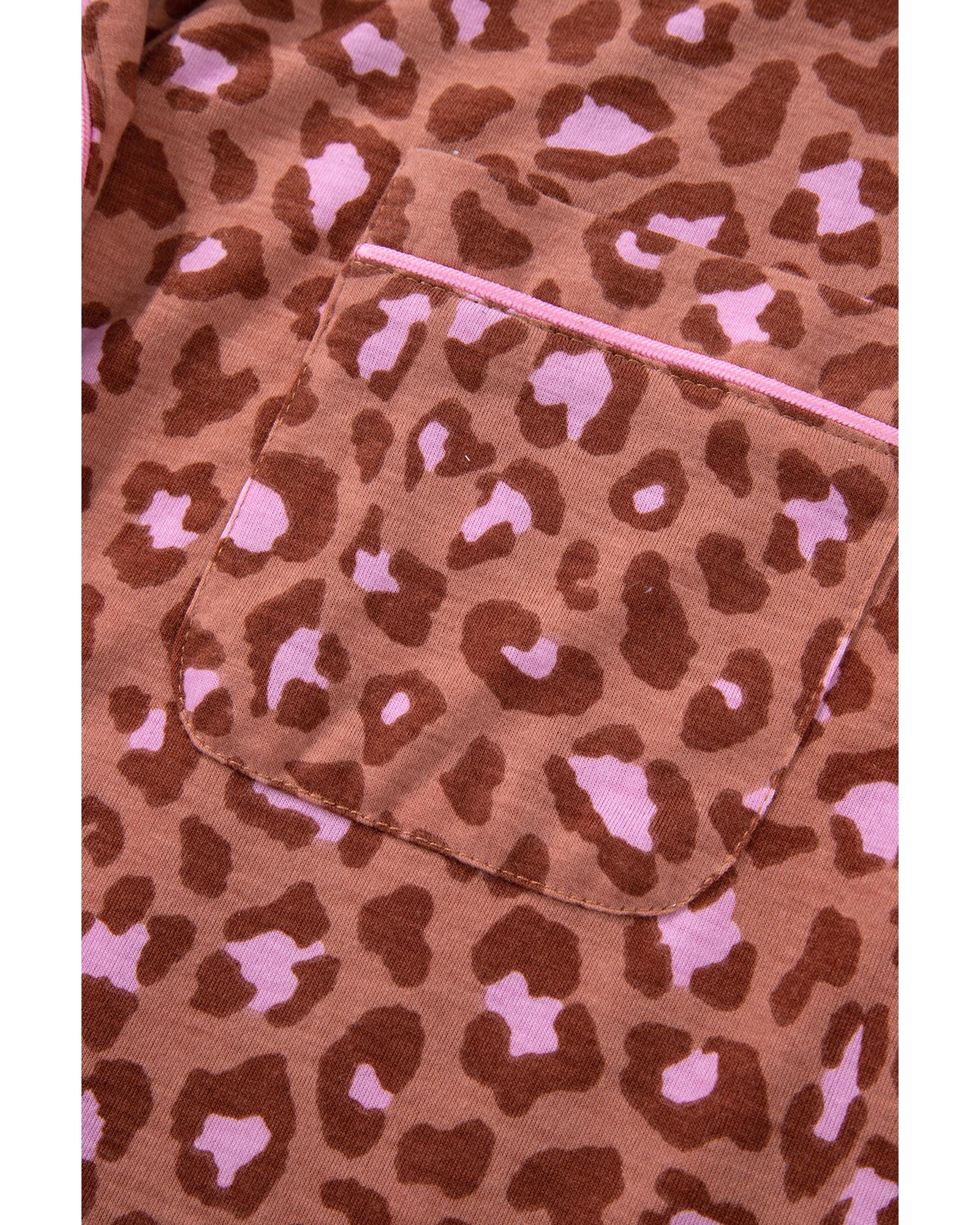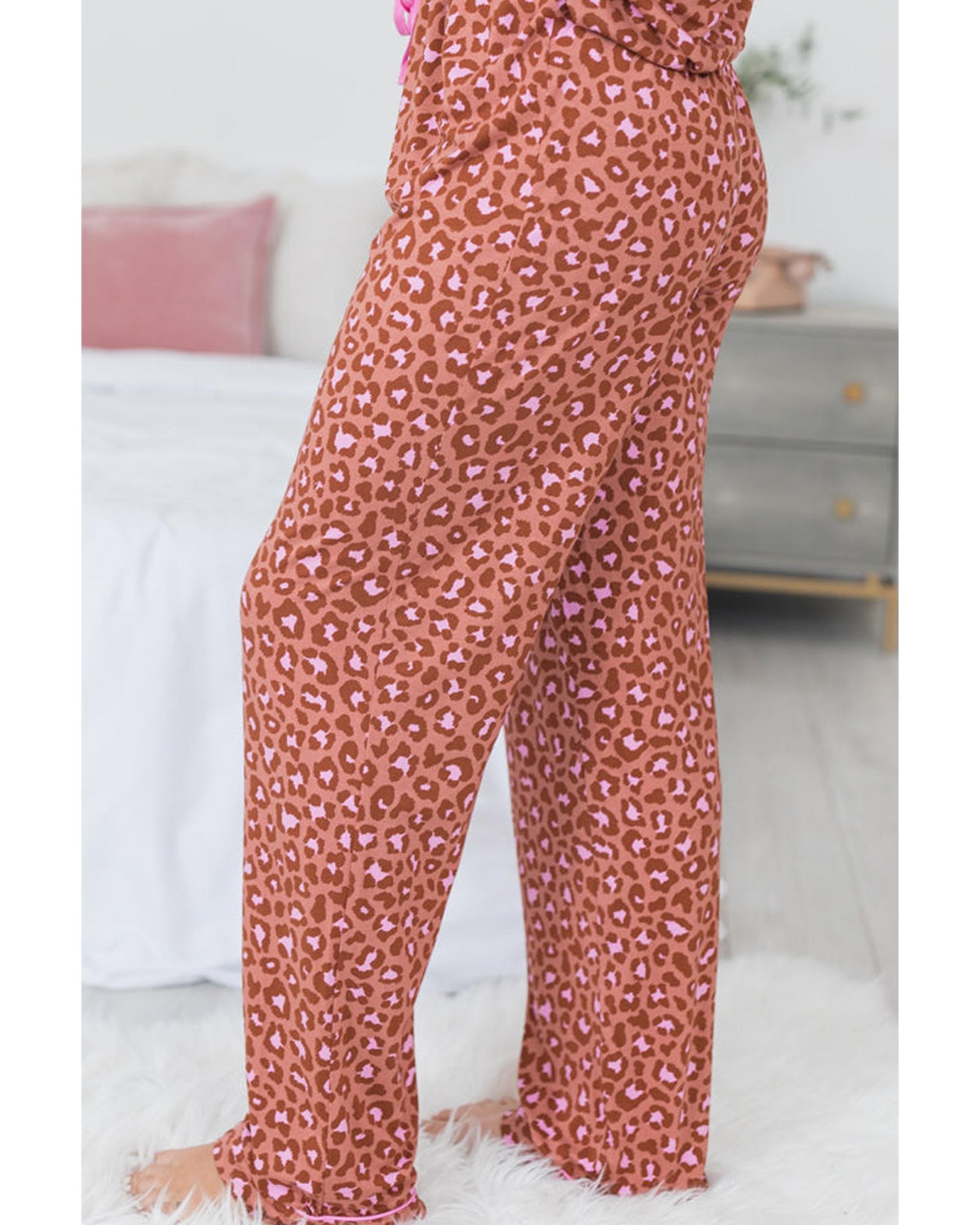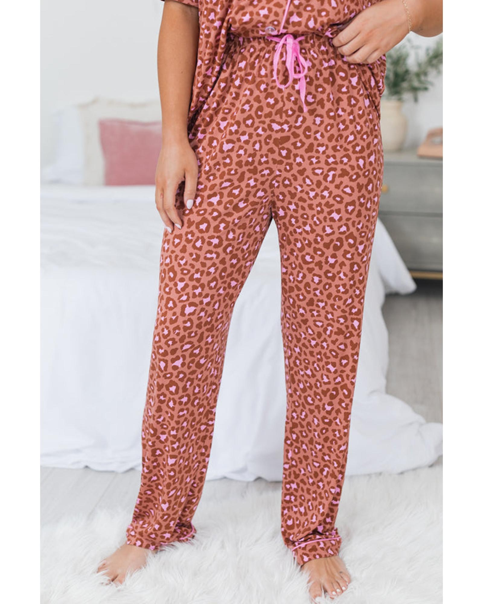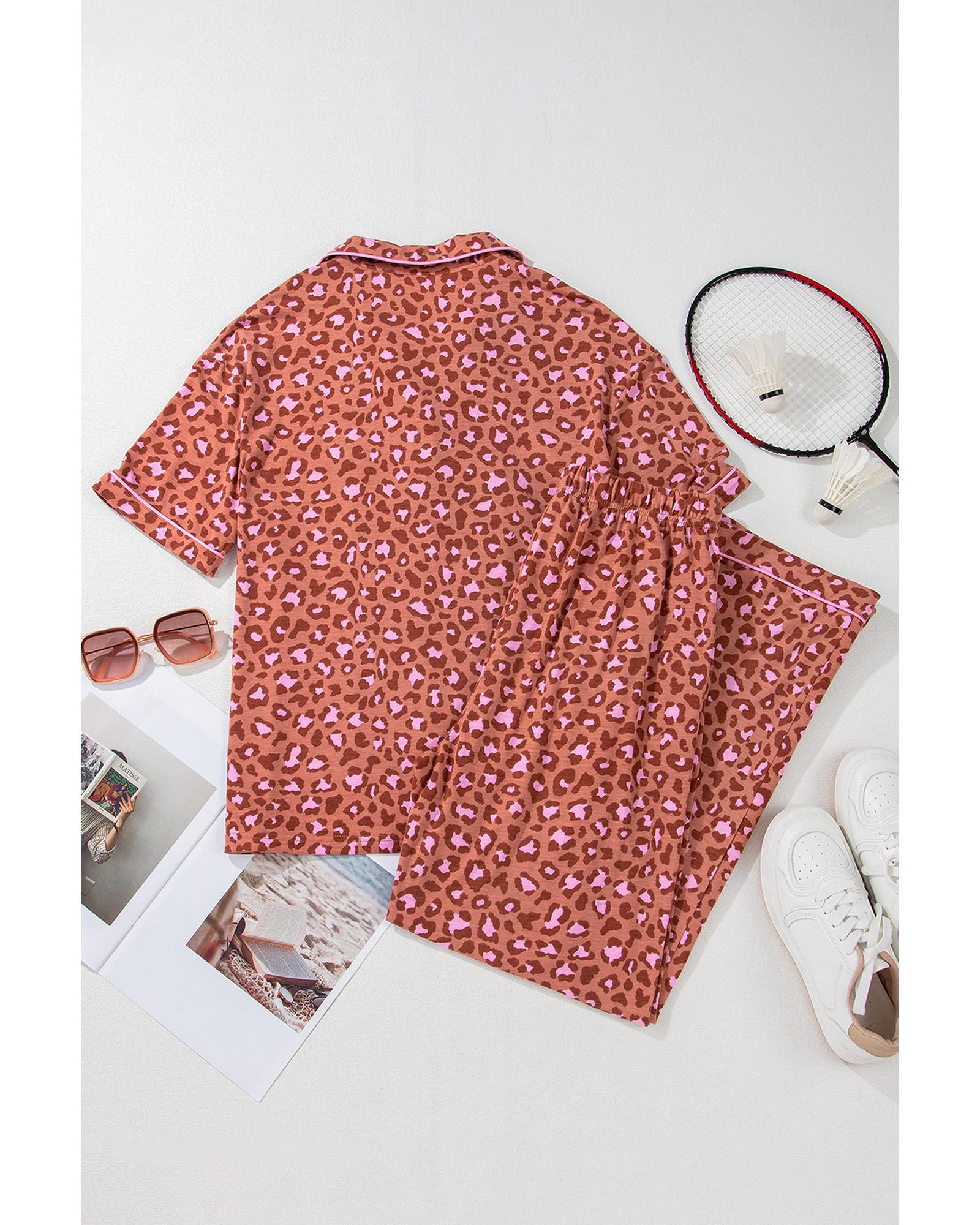 Brown Leopard Print Short Sleeve Shirt and Pants Pajamas Set – M
