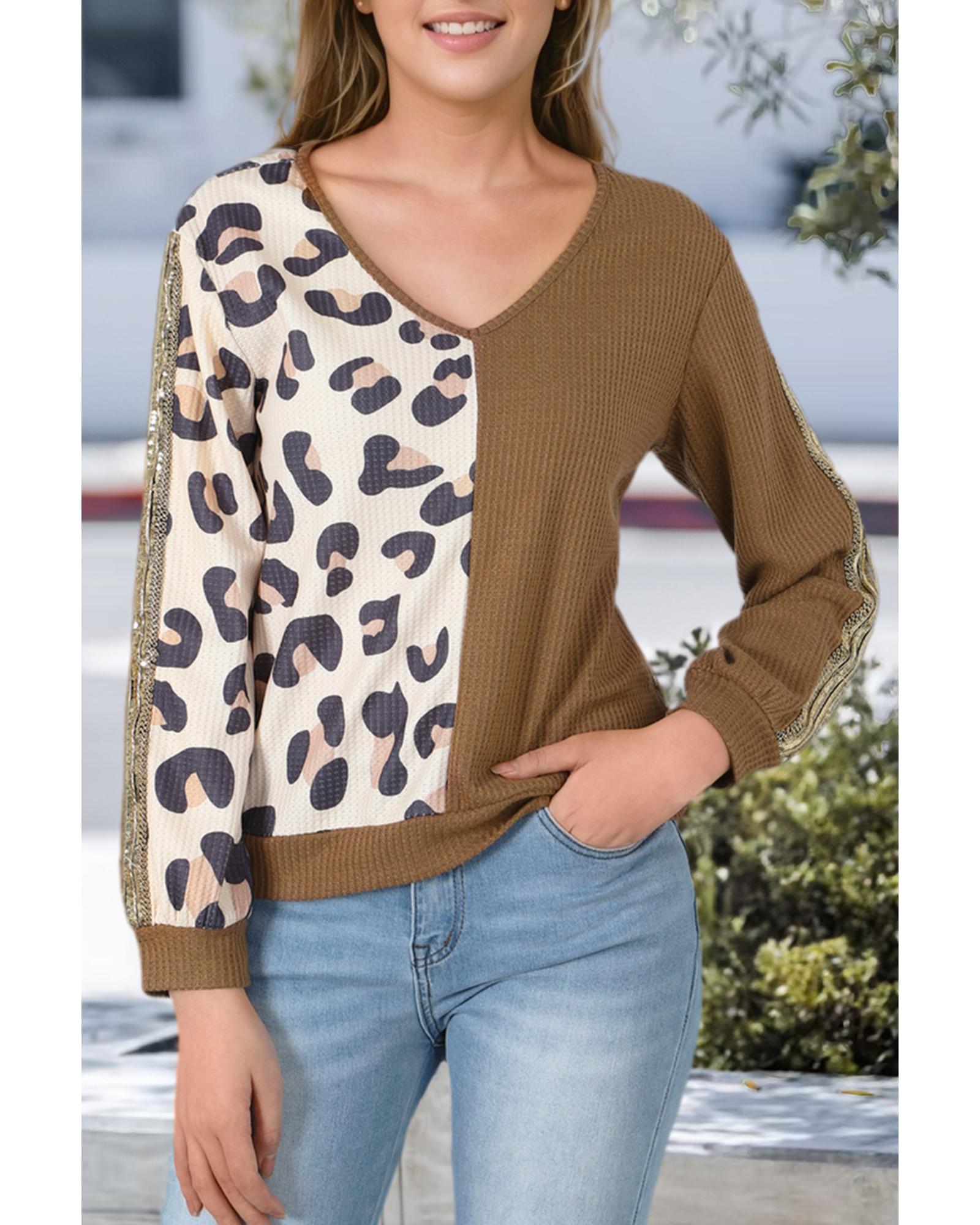 Brown Leopard Splicing Waffle Knit V Neck Top – S