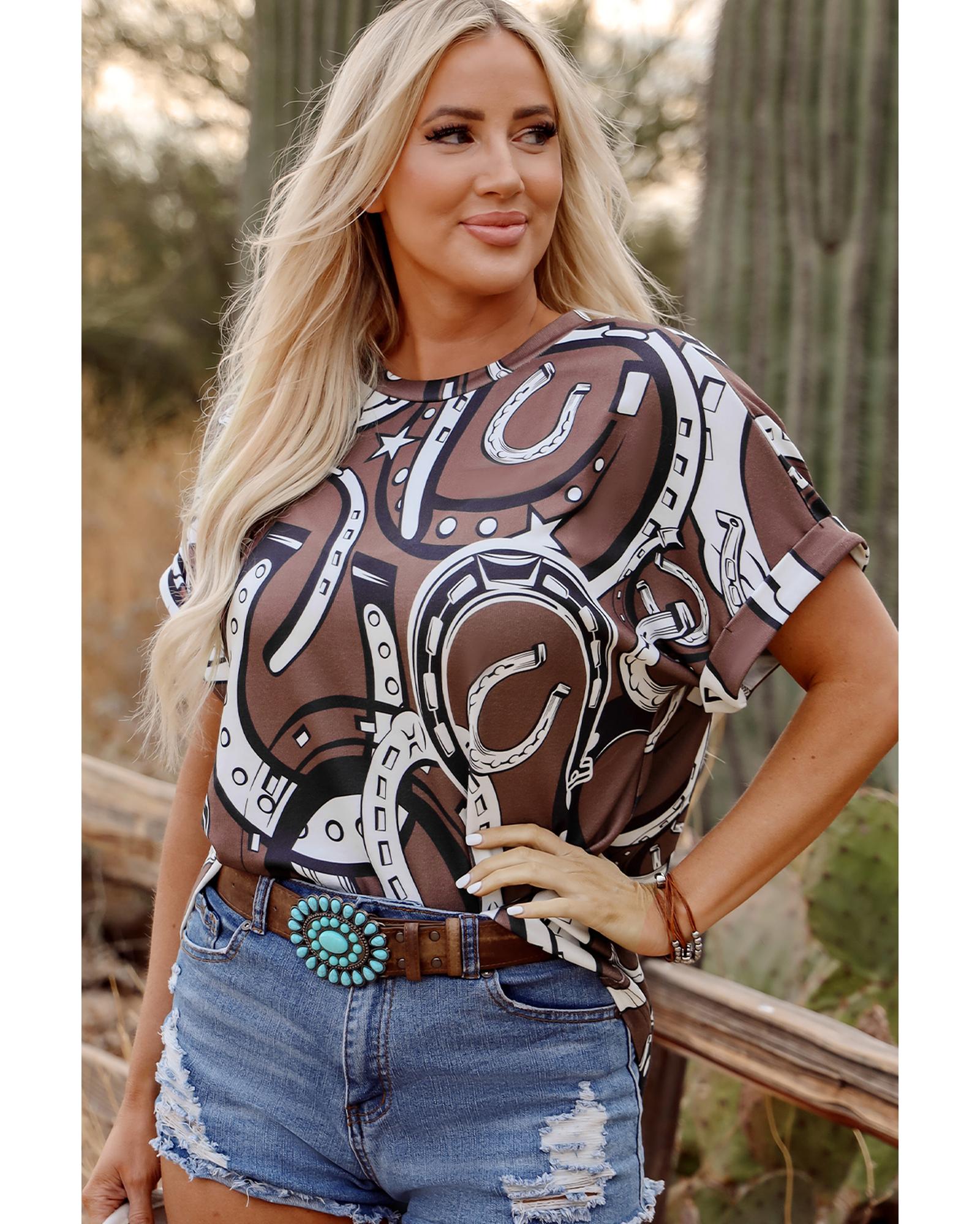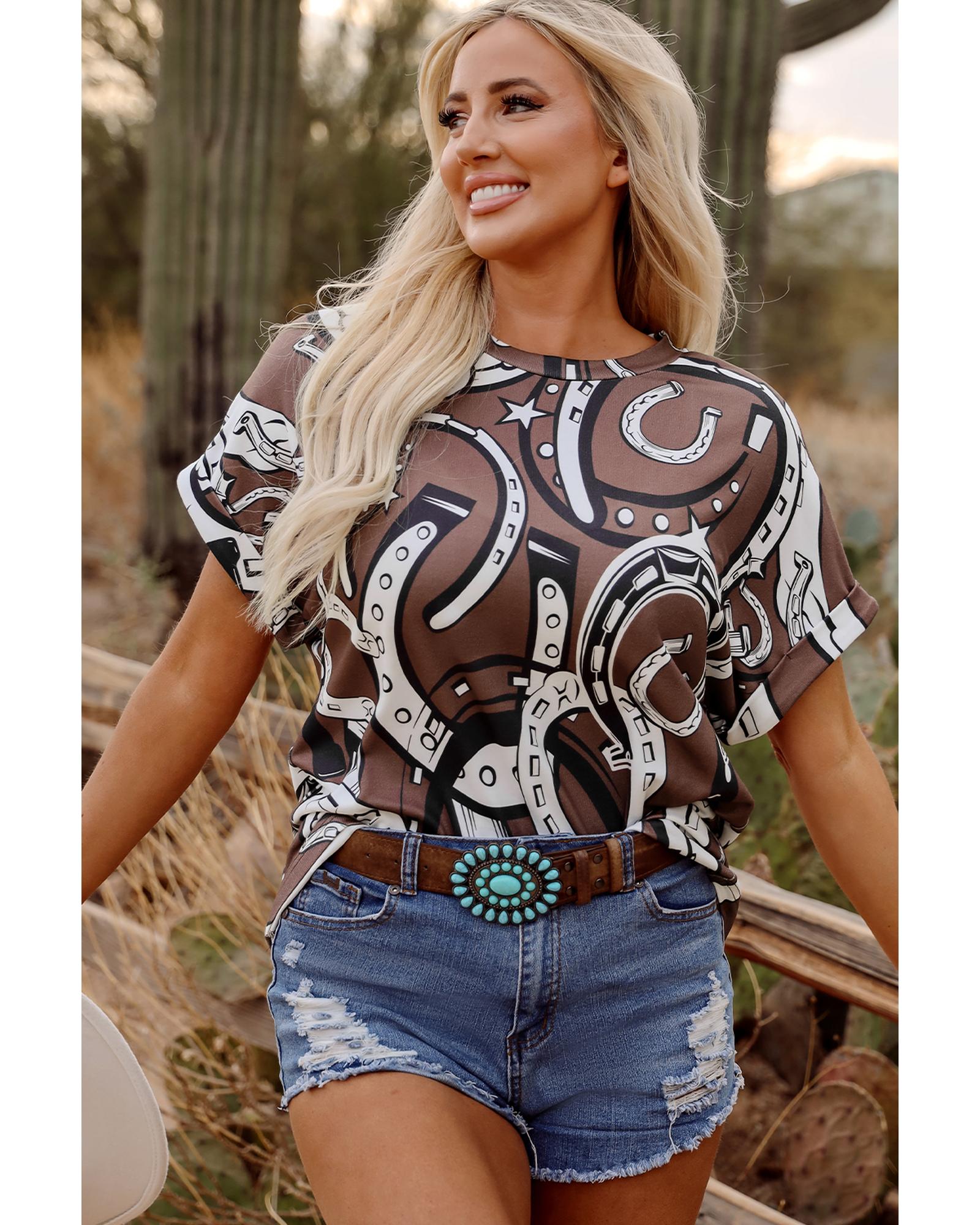 Brown Lucky Horseshoes Graphic Dolman T-shirt – M
