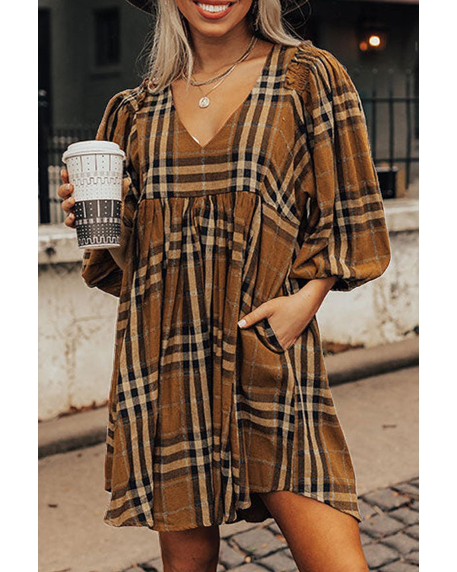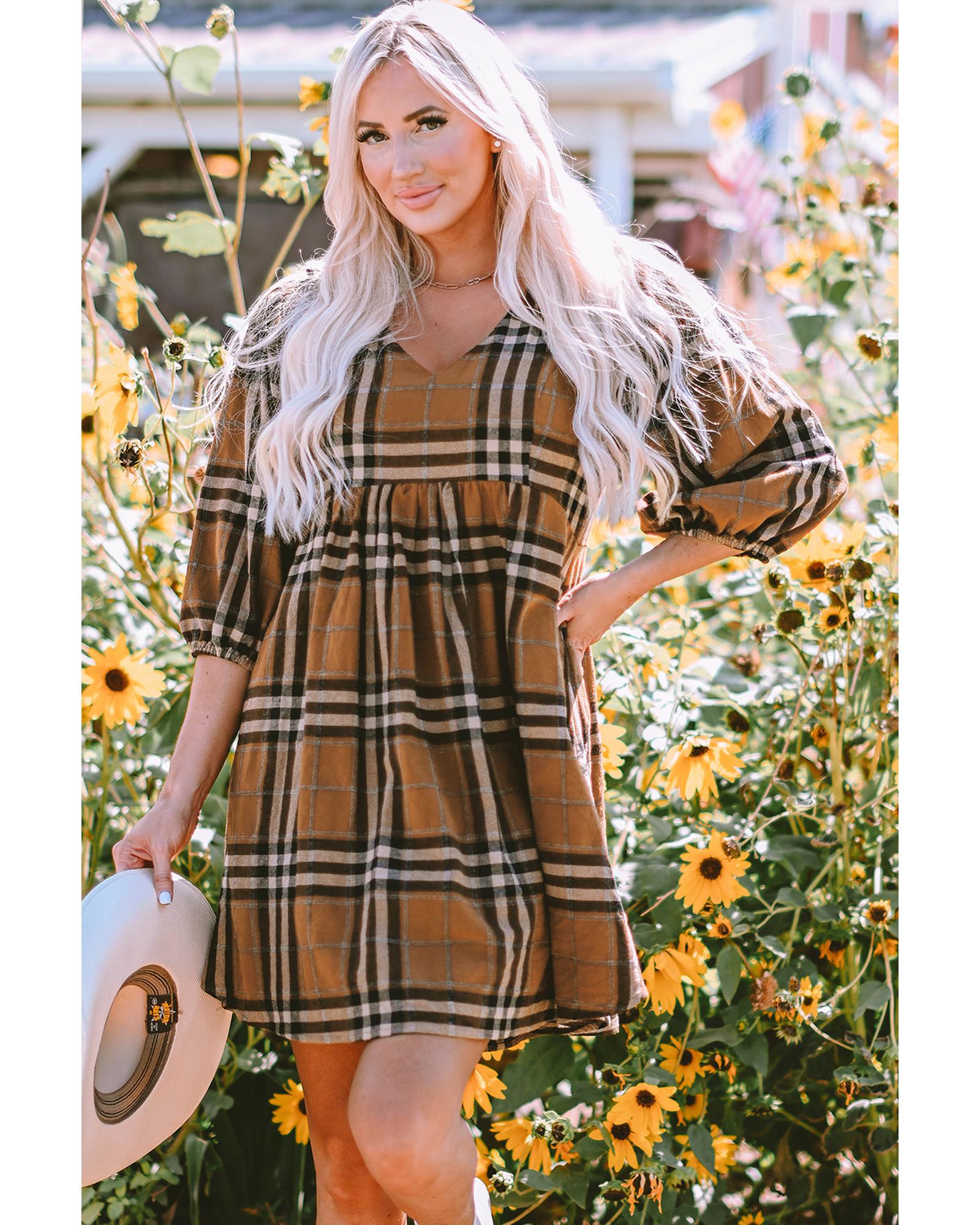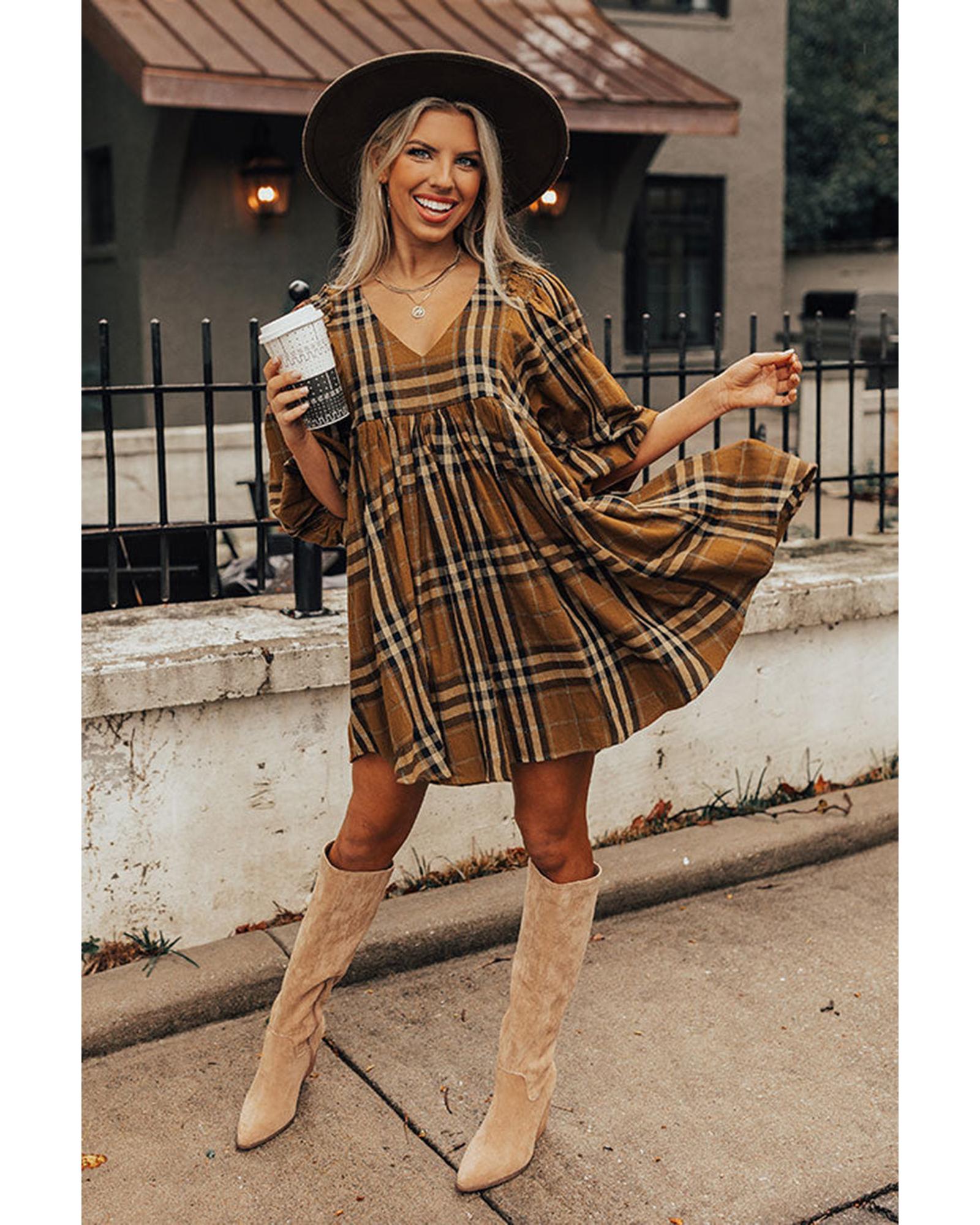Brown Plaid Pattern Empire Waist Babydoll Dress – L