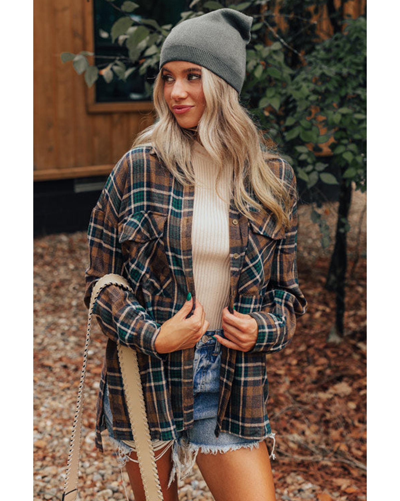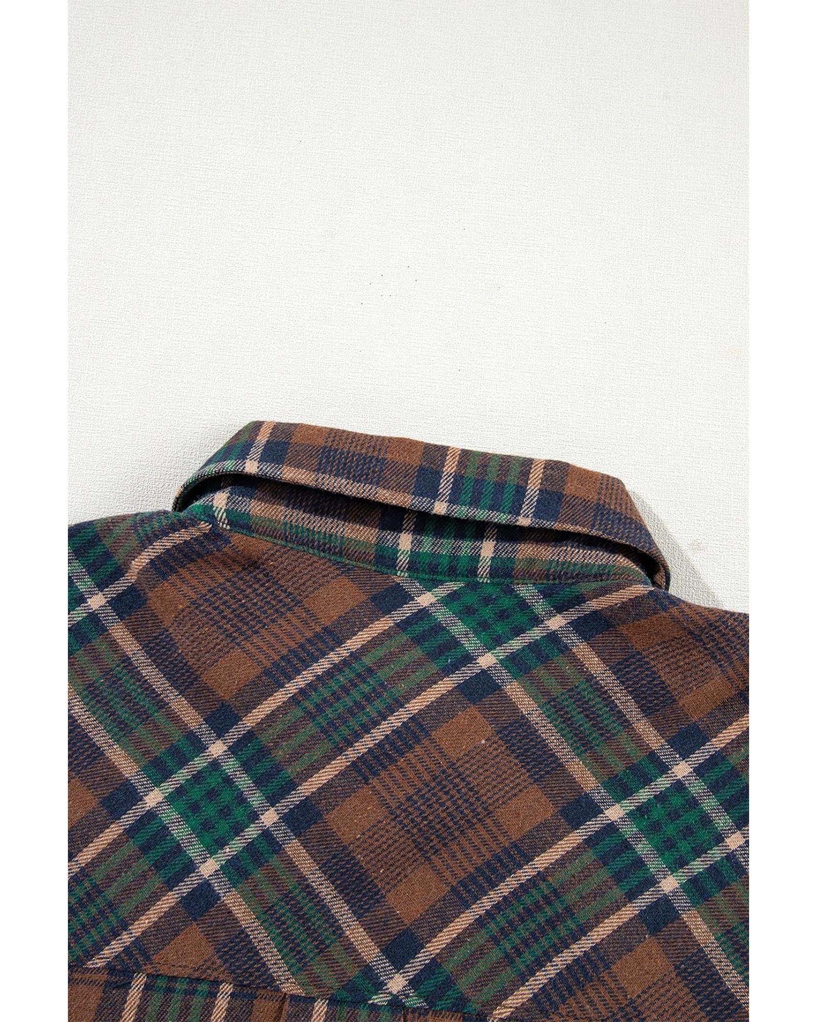 Brown Plaid Print Chest Pockets Buttoned Shirt Jacket – L